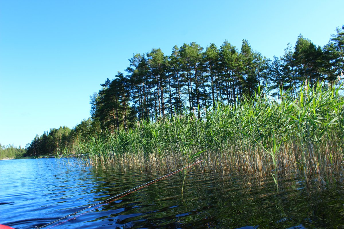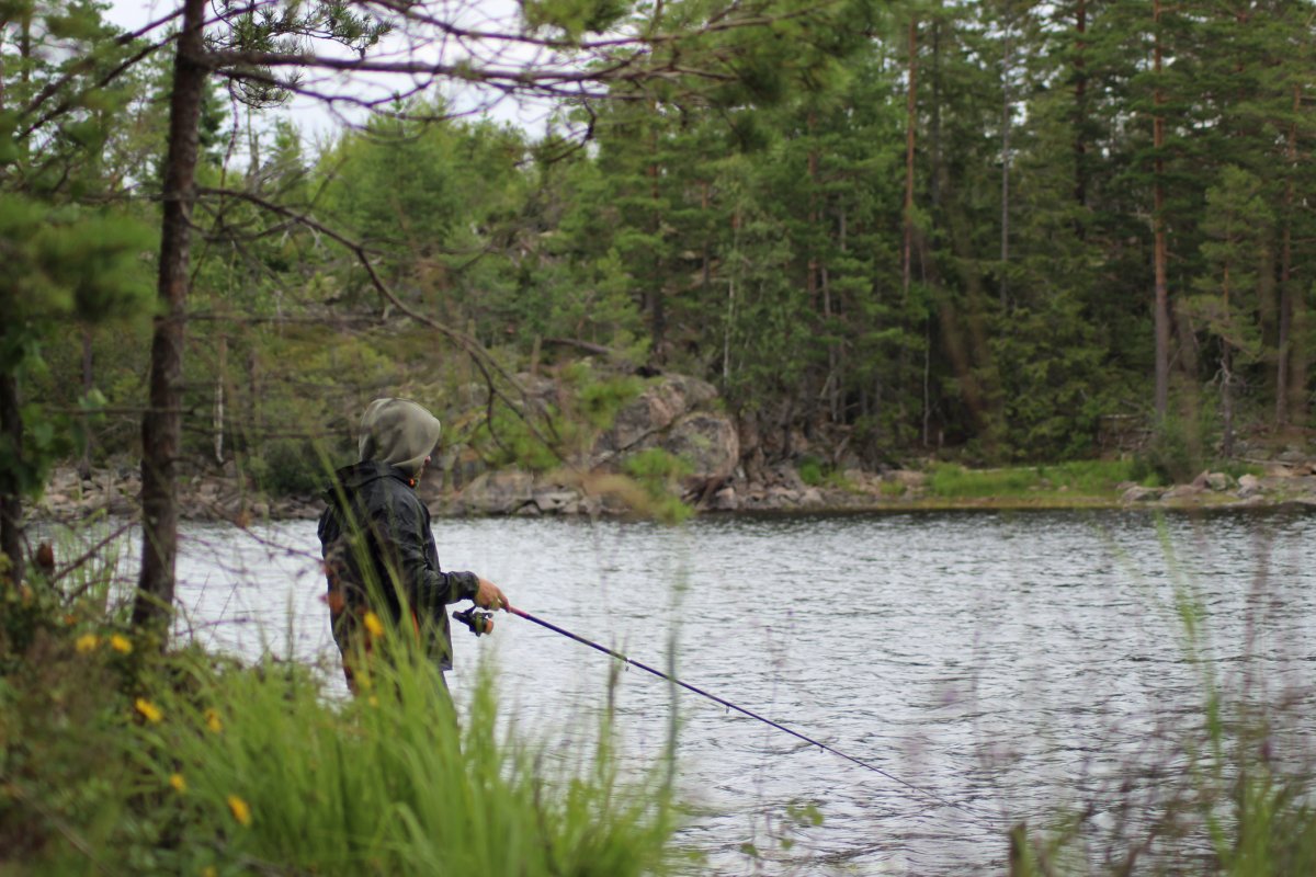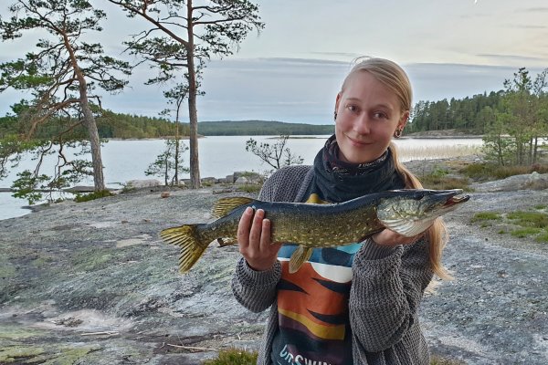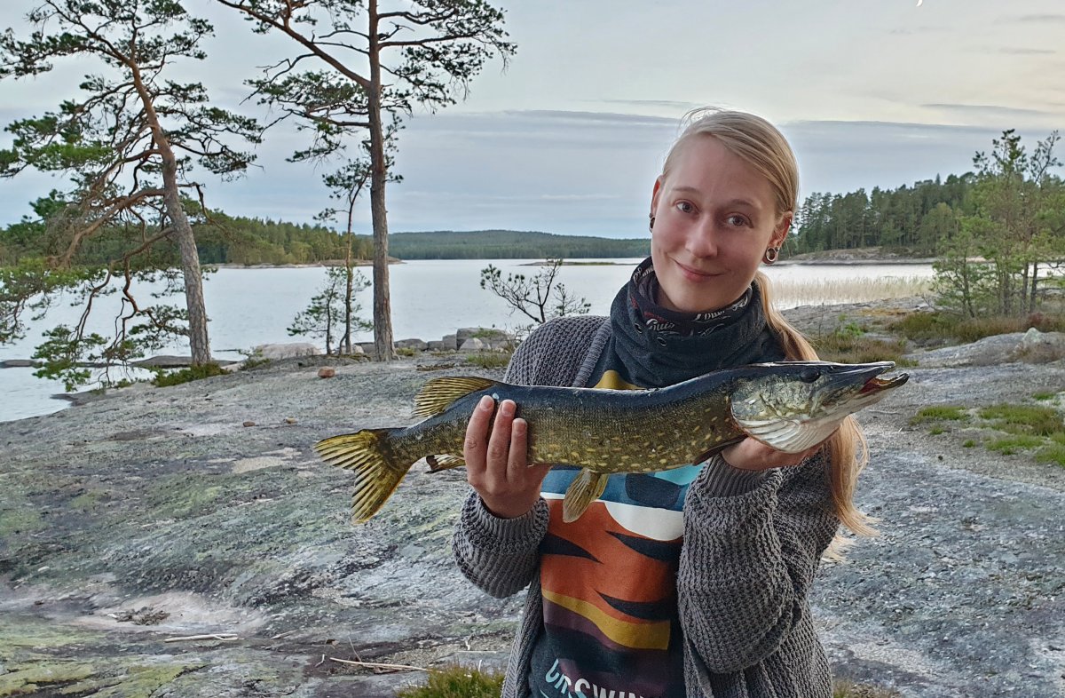 Als wir so die ersten Meter im Kanu geschippert sind kam eine uns vertraute Frage auf : Wohin denn nun? Wir schafften es bis zur Schleuse- nur um dann zu bemerken, dass wir überhaupt nicht wussten, wie eine Durchfahrt funktionierte. Unsere Geduld hielt sich nach der langen Busfahrt auch in Grenzen, also kehrten wir wieder um. Wir entschieden uns wie vor einem Jahr unsere erste Nacht auf „Ant Island“ zu verbringen. Doch dieses Jahr war alles verändert. Die grünen Raupen, die es im Vorjahr im Überfluss gab, waren nicht da. Somit probierten wir kurzerhand, Köderfische mit Nudeln zu fangen. Wir dachten schon, dass dies nicht von Erfolg gekrönt wird und überlegten die Insel in „Can´t Island“ umzubenennen. Zum Glück fanden wir noch eine Art Röhrenwürmer und konnten die kleinen Fische überlisten. Dann machten wir die Hauptangeln samt Pieper bereit und legten diese aus. Als wir uns schließlich dran machten unser erstes Essen vorzubereiten, gab es einen Alarm. Zu meinem Glück sogar an meiner Angel. Raus holte ich meinen neuen Rekordhecht, ganze 63cm und somit auch mein erster Hecht in Schweden. Total dankbar über den Fang ergänzten wir mit ihm unseren Speiseplan und es gab anstatt Buchstabensuppe mit Reis nun filetierten, gebratenen Fisch. Kurz darauf ging der zweite Pieper und diesmal fing Mario einen sehr überraschenden Fisch, einen Friedfisch (auf Köderfisch) in einer beachtlichen Größe von über 40 cm, dieser durfte wieder schwimmen. Nachdem wir unseren Abend also noch so richtig genießen konnten legten wir uns schlafen und es fing während der Nacht an zu regnen. Trotzdem musste Mario um 5 Uhr Morgens noch mal schnell das Zelt verlassen, da wieder seine Angel Alarm machte. Er konnte dann bereits den zweiten Hecht in diesem Schweden Urlaub landen, der aber etwas kleiner war und deshalb sofort weiterschwimmen durfte. Da wir noch kaum die Augen aufbekamen, legten wir uns noch etwas ins Zelt. Nachdem der Regen sich dann verzog erwachten wir und starteten entspannt mit einem Kaffe in den Tag. Kurz darauf machten wir uns dann auf den Weg zu neuen Ufern.