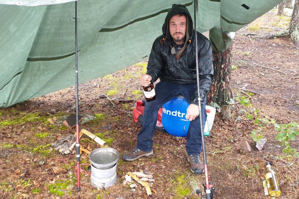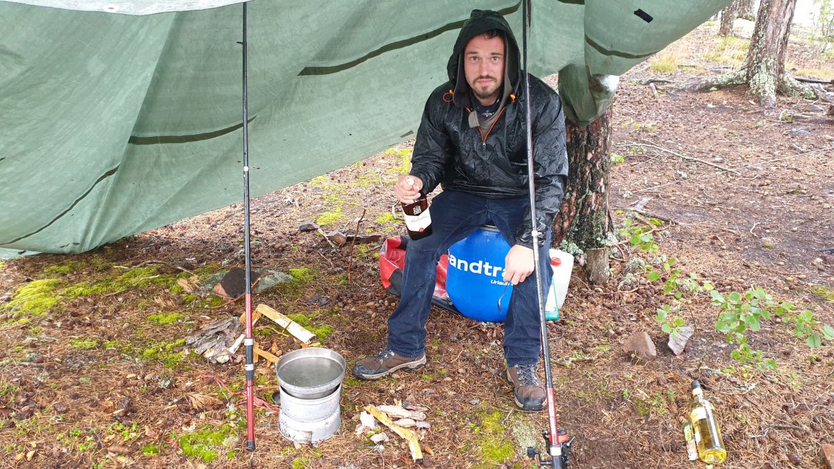 Bei durchgehend grauem Wetter entdeckten wir eine nette kleine Insel an einer Schilfkante mit Seerosen die uns würdig erschien.Wir blieben. Nachdem wir einige Zeit, viele Nerven und mehrere Versuche brauchten, unser Zelt vernünftig aufzubauen, stand es endlich. Die Schwierigkeiten schoben wir auf den unebenen Boden und den sehr starken Wind. Wir begannen unsere tägliche Routine und kochten Essen. Ich probierte mich vermehrt mit meiner Kamera aus und legte mich auf die Lauer. Ich ließ mich davon so ablenken, dass ich nicht an die großen, rutschigen Felsen dachte. Es kam wie es kommen musste und ich fiel hin. Bemüht um die Kamera streckte ich sie in die Höhe und musste mich daher mit meiner Kniescheibe und meinem Kinn am Stein abstützen. Die Kamera blieb heile und ich konzentrierte mich darauf, den Schmerz weg zu atmen. Mein Knie hat es gut erwischt, aber um das mal vorweg zu nehmen : Ich blieb von ernsthaften Verletzungen oder Spätfolgen verschont. Ich konnte mich die erste Zeit nach dem Sturz nur humpelnd fortbewegen und so musste Mario eines tun - noch mehr arbeiten. Er übernahm alle Aufgaben gerne und da das Wetter nicht besser wurde ruhten wir uns etwas im Zelt aus. Im Endeffekt erwartete uns ein Nachmittag mit viel Schlaf. Irgendwann kamen wir aber wieder hervorgekrochen - was wir noch ziemlich bereuten. Es zogen noch dunklere Wolken auf und unser bisher härteste Outdoormoment traf uns ungewollt heftig- wir unterschätzten den aufkommenden Regen und wurden alsbald komplett durchnässt von Starkregen und Sturm. Wir konnten weder Feuerholz ins trockene legen, noch unser Tarp vernünftig aufspannen, sodass wir in kürzester Zeit vor vielen Problemen standen. Wir dachten anfangs noch, dass der Schauer sich schnell wieder verzieht, aber er hielt mehrere Stunden an. Nass bis auf die Knochen und mit einem leicht undichten Zelt harrten wir die Zeit unter der provisorisch mit Angelruten als Ständer aufgebauten Plane aus. Unsere Laune zu der Zeit brauche ich wohl nicht beschreiben, wir dachten jedenfalls wenn es so weiter regnet müssen wir den Tripp abbrechen, denn ich war mir sicher, dass das Zelt dem nicht lange standhalten wird. Wir warteten geduldig und Mario bekam schließlich ein kleines Feuer hin welches in dem Moment dringen notwendig war und uns etwas Wärme und neuen Mut spendete. Den Wetterbericht werden wir ab dem Tag nicht mehr ignorieren. Von circa 17:00 bis 21:00 ging das Spektakel und wir konnten uns schließlich endlich einen heißen Tee kochen. Wir wollten Outdoor, wir wollten Abenteuer und wir wollten back to the roots! Und wir bekamen davon alles, alles auf einmal! Zum Glück konnten wir uns durch das Feuerchen noch einigermaßen trocknen und aufwärmen und schlüpften dann bald zügig in das Zelt, welches zum Glück auch von weiteren Wassermaßen verschont blieb. Um 00:09 mussten wir dann noch mal raus, da der Pieper der Angel ging. An Marios Rute befand sich mit 76cm der Größte Hecht seit langem. Wir filetierten ihn am nächsten Morgen und packten ihn für das Mittagessen ein. Zum Glück schien an dem Morgen die Sonne und wir konnten unsere restlichen feuchten Klamotten aufhängen und trocknen. Danach gab es für uns nur ein Ziel : Ein Dano !