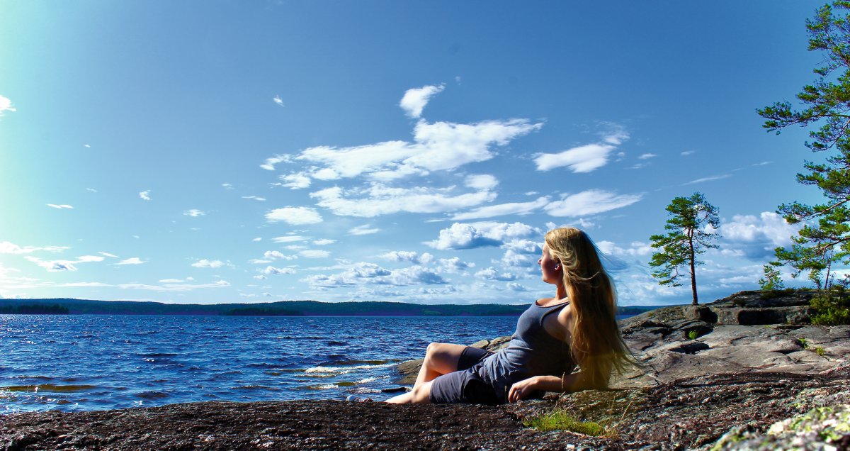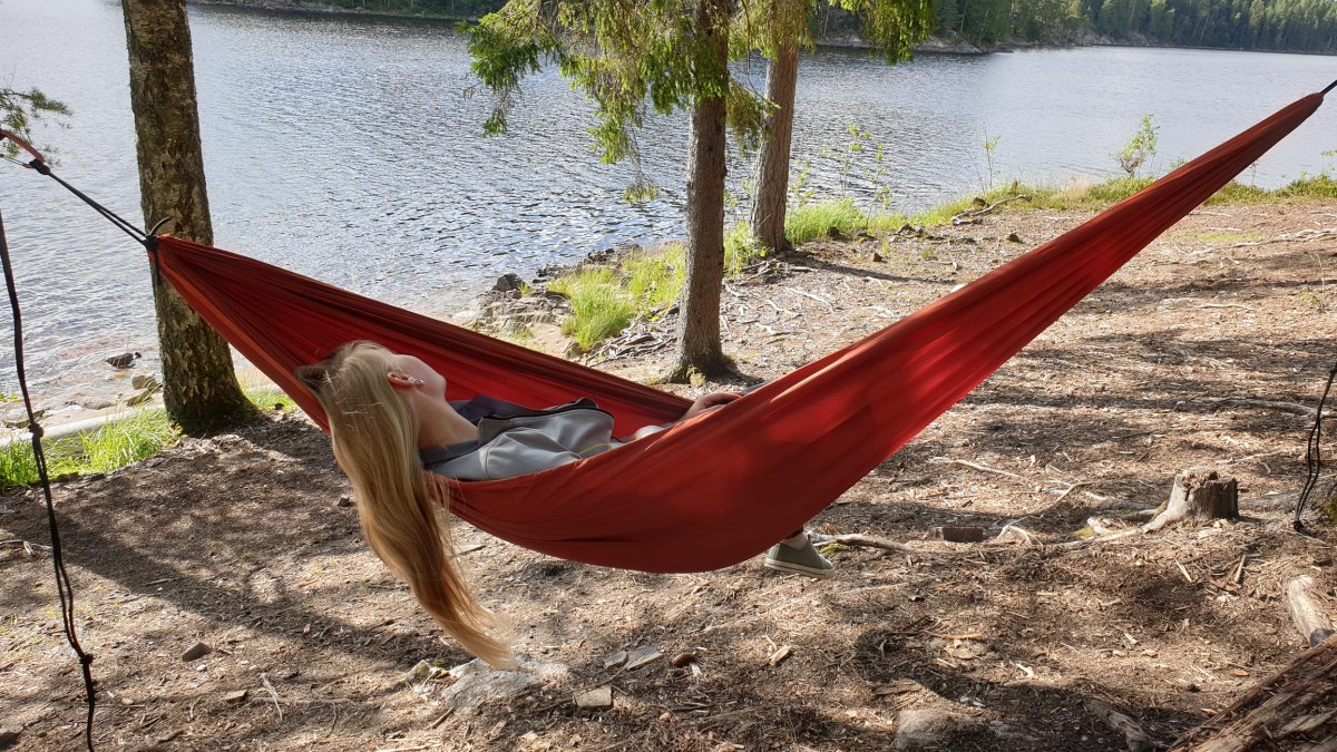 An diesem Tag standen wir früh auf, denn die Sonne sollte endlich wieder am Himmel erscheinen. Zum Glück war das auch so. Wir paddelten bei blauem Himmel zu einem Rastplatz den wir im letzten Jahr schon beim vorbei paddeln gesehen haben und dieser entpuppte sich als wirklich schönes Fleckchen mit Badebucht, Feuerstelle und vor allem blauem Himmel satt! So, jetzt beginnt der Sommerurlaub! Direkt am Foxen gelegen konnten wir wunderbar den Wellen lauschen. Während ich diesen Text schrieb, köchelte unsere zweite Blaubeermarmelade vor sich hin und ich schaukelte entspannt zwischen den Bäumen in der Hängematte hin und her. Wunderschön ! Wir passten einen Moment mit komplett wolkenlosem Himmel ab und gingen in der Bucht baden. Unsere von der Woche in Mitleidenschaft gezogenen Klamotten wuschen wir im klaren Seewasser und hatten dabei Spaß wie alte Waschweiber. Danach fingen wir noch ein paar Köderfische und der Begriff „Brotauge statt Rotauge“ setzte sich durch. Denn die hier heimischen Rotaugen verschmähen leckere Würmer und stürzen sich dafür auf das von mir *Ironie an* innig geliebte Eiweisbrot *Ironie aus*. Später zog dann ein kleiner Regenschauer über uns her, den wir im Zelt abwarteten. Dabei entsprangen uns Gedanken wie „ witzig ist, wenn nur einer lacht !….sagte der Arzt der Tierwelt, das Medi-Tier“ und ich regte mich etwas über die „Furzel“ unter meinem Rücken auf- F(uck, eine W)urzel. Als Mario mir dann aus meinen bisherigen Aufzeichnungen vorlas ergaben sich ganz wilde Geschichten. Denn ich bin wahrscheinlich die einzige Frau auf Erden mit einer Sauklaue, die schlimmer ist als bei jedem Schreibanfänger. Aber wie hieß es doch so schön „Nobody war auch nicht perfect!“