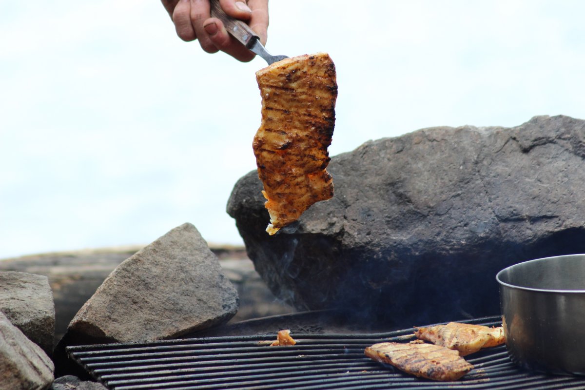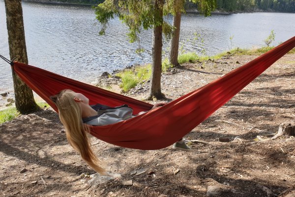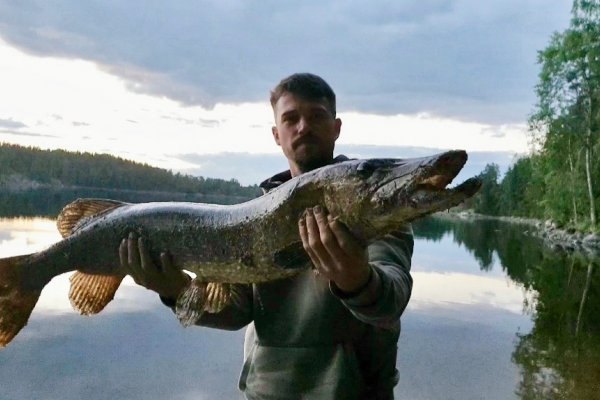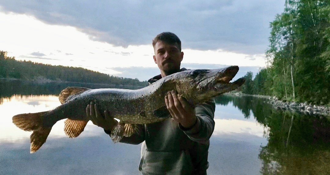 Zu unserer Erleichterung fanden wir nach einem schönen Paddelmorgen das Dano 39. Wir erbauten unser Wind und Regengeschützes Lager, sägten und hackten Holz und machten uns an unser luxuriöses Mittagessen - es gab über dem offenen Feuer gegrilltes Hechtfilet. Mit den passenden Gewürzen und leckeren Kartoffeln aus der Glut ein absolutes Festmahl. Während alles vor sich hin briet waren wir ganz froh über den Platz, wir mussten mal kein Zelt aufbauen und so ein Dano ist doch sehr geräumig. Nachdem Mittagsschlaf erwartete uns noch ein sehr entspannter Tag. Wir sammelten Heidelbeeren, backten Heidelbeer-Apfelkuchen ( der allerdings eher nach Brötchen schmeckte ) und saßen an unserem schönen Lagerfeuer. Ich überwand mich dann Nachmittags und ging baden an unserem kleinen Privatstrand. Ich wagte mich in das kühle nass und es war wirklich sehr erfrischend. Die Sonne trocknete danach meine Haare im Nu und ich fühlte mich bereit für die nächsten Tage.Im Laufe des Abends zeigte sich, das Schweden uns in diesem Jahr beim Thema Angeln wirklich wohl gesonnen war, denn Abends gab es den nächsten Alarm - an unserer günstigsten Ersatzrute. Wir liefen zu den Angeln und hatten diese zum Glück festgebunden an einem Ast, da sie sonst ganz bestimmt im Wasser gelandet wäre. Was folgte war ein mehrere Minuten langer, sehr spannender Drill von Mario.Wer ihn kennt weiß, dass er wirklich viel Kraft hat, aber dieser Fisch war ein würdiger Gegner und Mario wusste direkt, dass es ein großer sein muss. Von Minute zu Minute stieg der Glaube an den lang ersehnten Meter Hecht ( Für alle nicht-Angler: Hechte ab einem Meter werden als kapital und sehr selten angesehen, dies ist ein Ziel auf das jeder Raubfischangler meist Jahre lang hin angelt ). Die Mühe und Geduld von Mario wurde an diesem Abend belohnt mit einer satten 1,10m großen Hechtdame von circa 11 KG. Ein richtiges Urzeitmonster ! Natürlich durfte sie weiterschwimmen, immerhin sorgen Hechte in dieser Größe für Nachwuchs. Wir saßen den Rest des Abends leicht paralysiert am Lagerfeuer und als die Aufregung nachließ, gingen wir schlafen. Alles in allem war dies eine ruhige, mückenfreie Nacht ohne die Sorge vor plötzlichem Wassereinbruch.