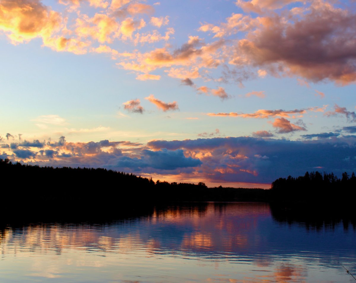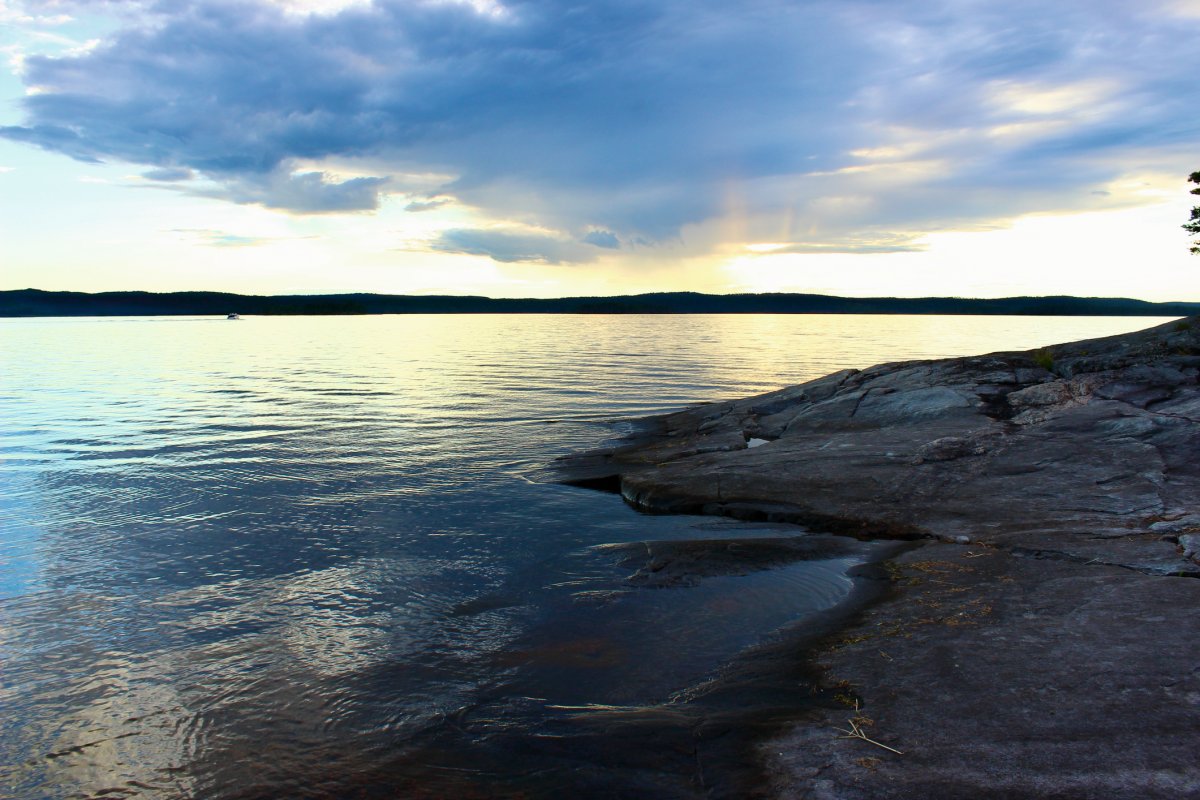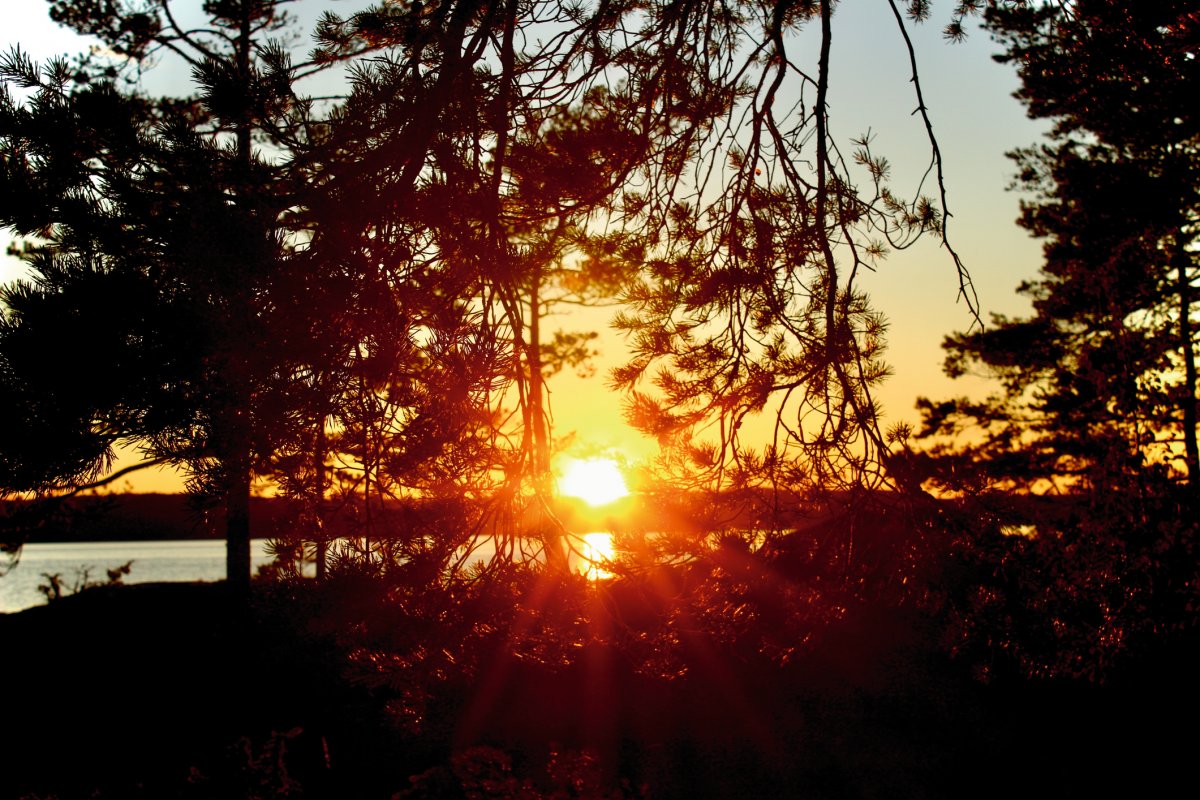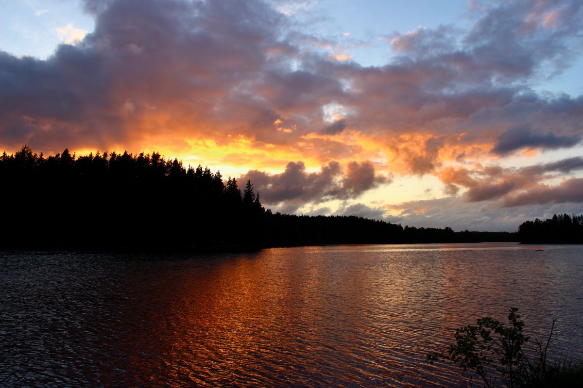 Der Dienstag begann grau in grau und Regenschauer zogen sich über den ganzen Tag.Durch das Wetter konnten wir nicht sonderlich viel machen und so ging es scheinbar auch den Anderen Kanuten, der See blieb still. Wir aßen, kuschelten und schliefen viel. Während ich das alles sehr gemütlich fand, war meinem Freund langweilig. Positiver Nebeneffekt davon war, dass wir genug Feuerholz auf Lager hatten. Ausserdem baute er eine Reuse um den Krebs zu fangen, der sich über unsere Köder an den Angeln hermachte. Gegen 18Uhr wandelte sich endlich das Wetter und die Sonne konnte sich mit einigen Strahlen durch die Wolkendecke zwängen. Der Abend blieb trocken und wir aßen köstliche Nudeln in Tomatensoße mit geröstetem Knoblauch und Salami- Chefkoch Anja war geboren ! Jeden Abend auf Neue war ich im übrigens total fasziniert von dem Farbenspiel der Abenddämmerungen. Malerisch.