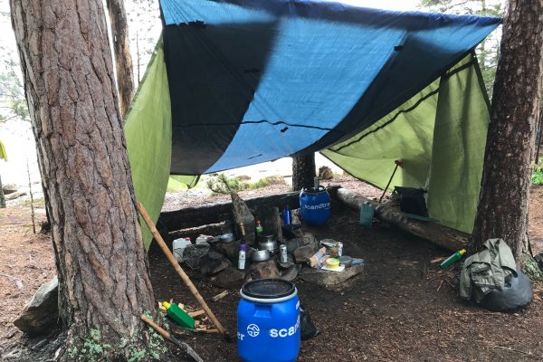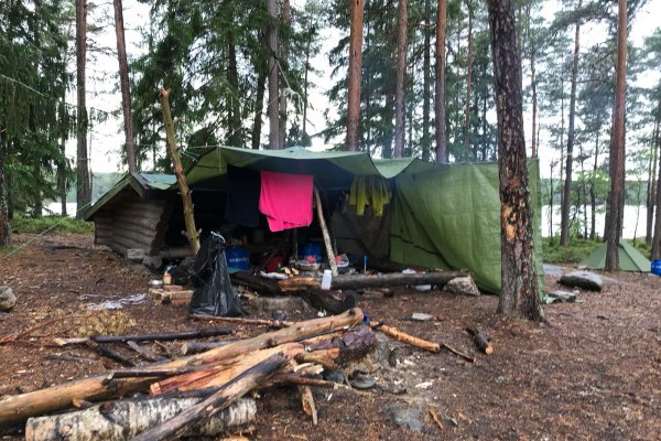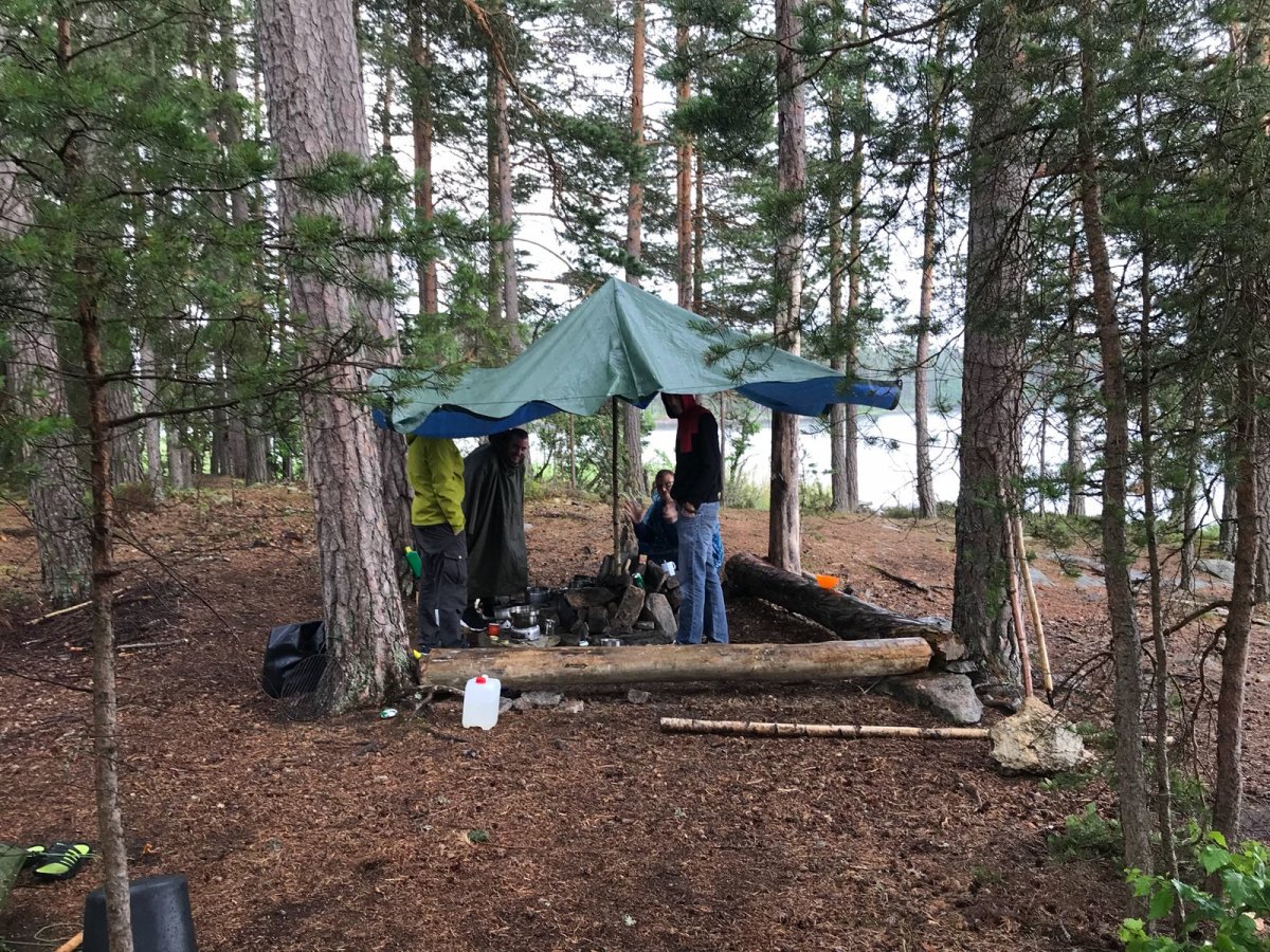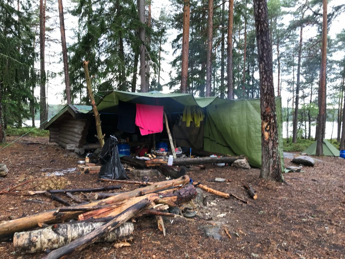Als wir nach Ihm schauten stellte sich schnell raus, dass Björn beim Wäsche waschen ausgerutscht und einmal unfreiwillig schwimmen gegangen ist. Leider waren seine einzigen trockenen Schuhe nun ebenfalls nass, also hat er sich in den Schlafsack gepackt. Björn hatte aber schon angefangen ein paar Leinen zu spannen, so dass wir die Planen spannen konnten. Also bauten wir nun das bisher größte Lager auf. Die Windschutzhütte als Basis verlängerten wir das Vordach, spannten die Seiten ab und beschwerten alles mit Steinen so dass es Winddicht ist. Nun konnte auch jeder seine nassen Sachen am Feuer, bzw unter dem „Dach“ trocknen. (Und ich sage Euch… wir haben unsere Sachen bisher 3 mal in der Waschmaschine gehabt,… einige riechen immer noch nach Feuer!)
