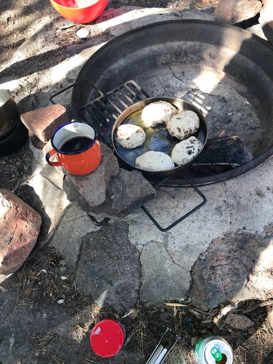 Nagut, es wird erst mal gefrühstückt, diesmal etwas später, da wir ja erst das Bier vom Vortag austrinken mussten. Meine Freundin und ich genehmigten uns eine Schale Müsli und einen Kaffee. Jens ruderte allerdings schon wieder mit den Händen in der Teigschale herum. Schon wieder Stockbrot? Weit gefehlt! Schokobrötchen! Einfach die Tafel Schokolade aus der Fresstonne klein gebröselt und mit in den Teig. Super Sache sage ich Euch!