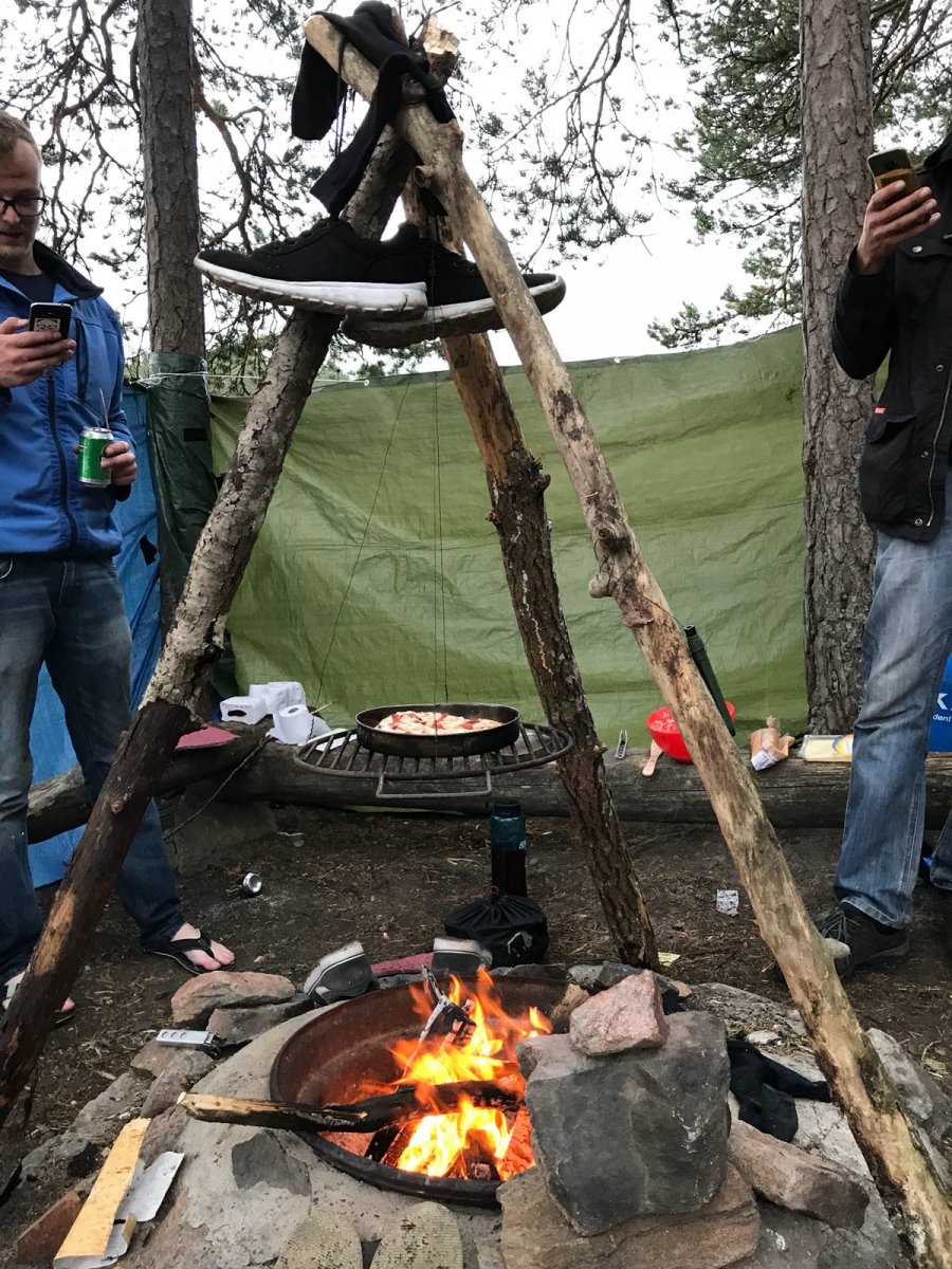 Tino hatte es sich zudem zur Aufgabe gemacht ein Dreibein für den Grillrost zu bauen. Dies wurde den Tag dann nicht nur zum Kochen benutzt, sondern auch um Schuhe und Klamotten zu trocknen.