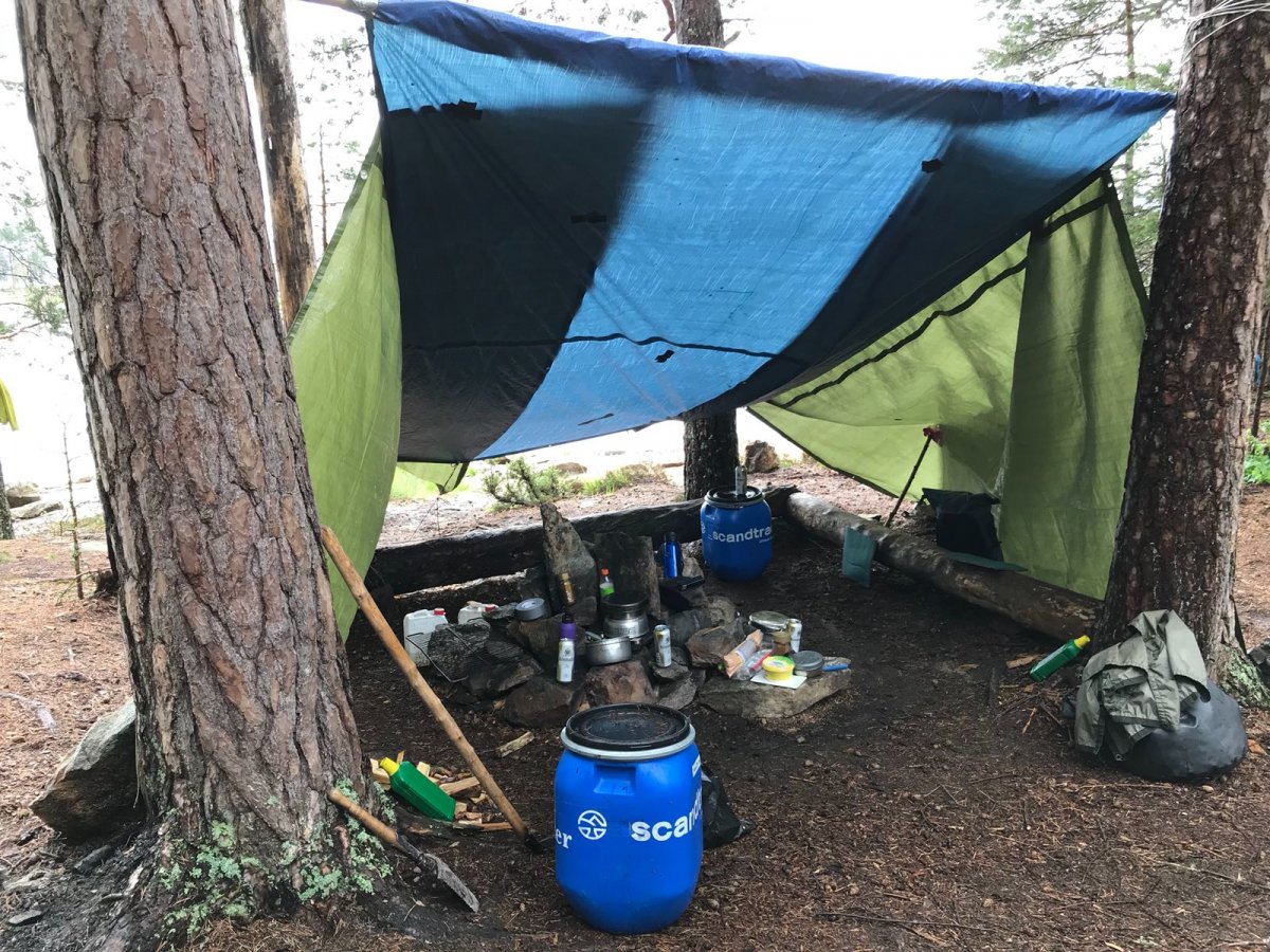 Auf unserer Insel angekommen waren wir pitschnass! Mal wieder…. Schnell ans Feuer… aber wieso brennt das Feuer nicht mehr? Ein bisschen Holz zum Feuer halten hatten wir doch noch… hmm.. scheinbar wohl nicht, egal. Feuer ist ja schnell gemacht. Aber wo ist Björn? Warum ist eine Plane vor der Windschutzhütte? Schläft der?