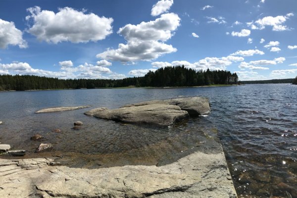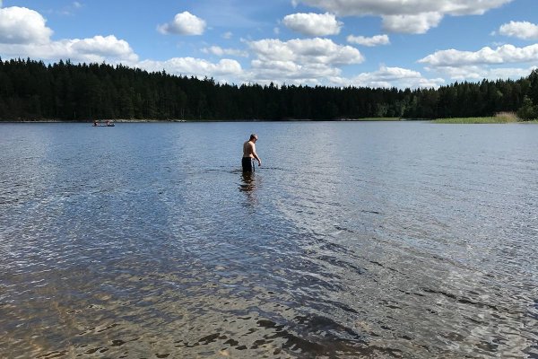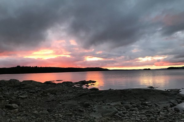 Nachdem wir alle Ausrüstung unten am Wasser hatten nahmen wir uns ein Kanu, beluden es und fuhren los. Wir verabschiedeten uns von unseren Helfern und wünschten Ihnen eine schöne Woche auf dem Wasser. Bei bestem Wetter paddelten meine Freundin und ich Richtung Norden. Nach einer Weile beschlossen wir an einem kleinen Strand am Ufer anzulegen um ein Bier zu trinken, eine Zigarette zu rauchen und etwas Pause machen. Nach erste Begutachtung des Platzes war uns schnell klar „Hier bleiben wir heute Abend, es ist zwar kein offizielles Dano, aber Feuer dürfen wir sowieso nicht machen“ Es war zwar eine „wilde Feuerstelle“ vorhanden, diese nutzen wir allerdings nur als Unterlage für unseren Spiritus Kocher. Es gab genug Platz für das Zelt, ein Sandstrand und reichlich Felsen, die in meinen Augen prima zum Angeln geeignet sind.