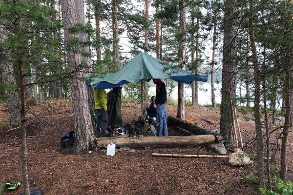 Unter einer Plane die wir provisorisch zu einem Pavillon umgebaut haben verbrachten wir die ersten Stunden stehend, in den Regenpausen wurde geangelt, parallel gekocht und dummes Zeug erzählt.