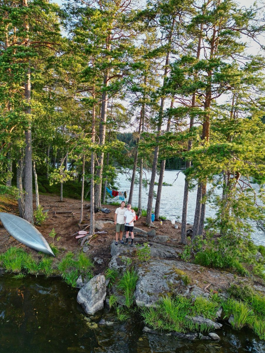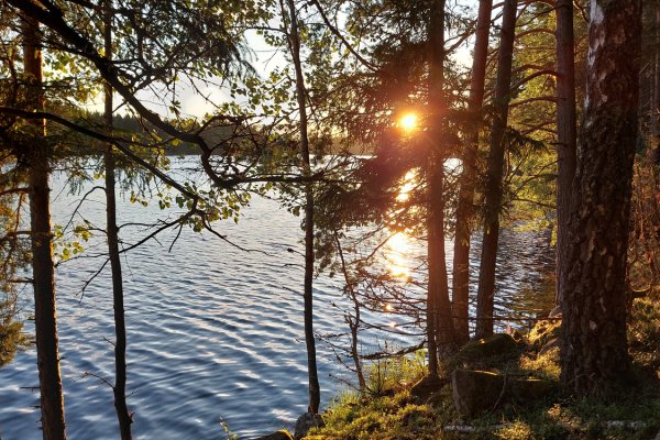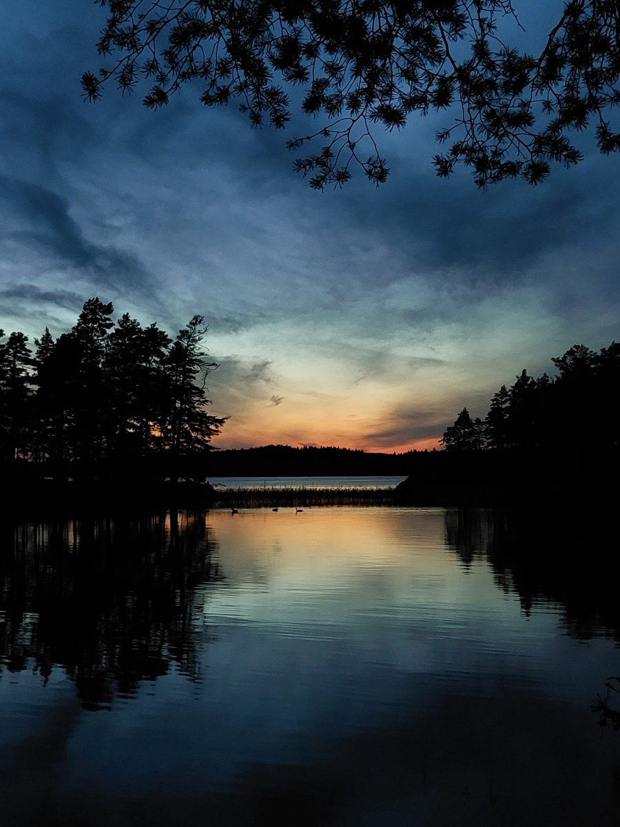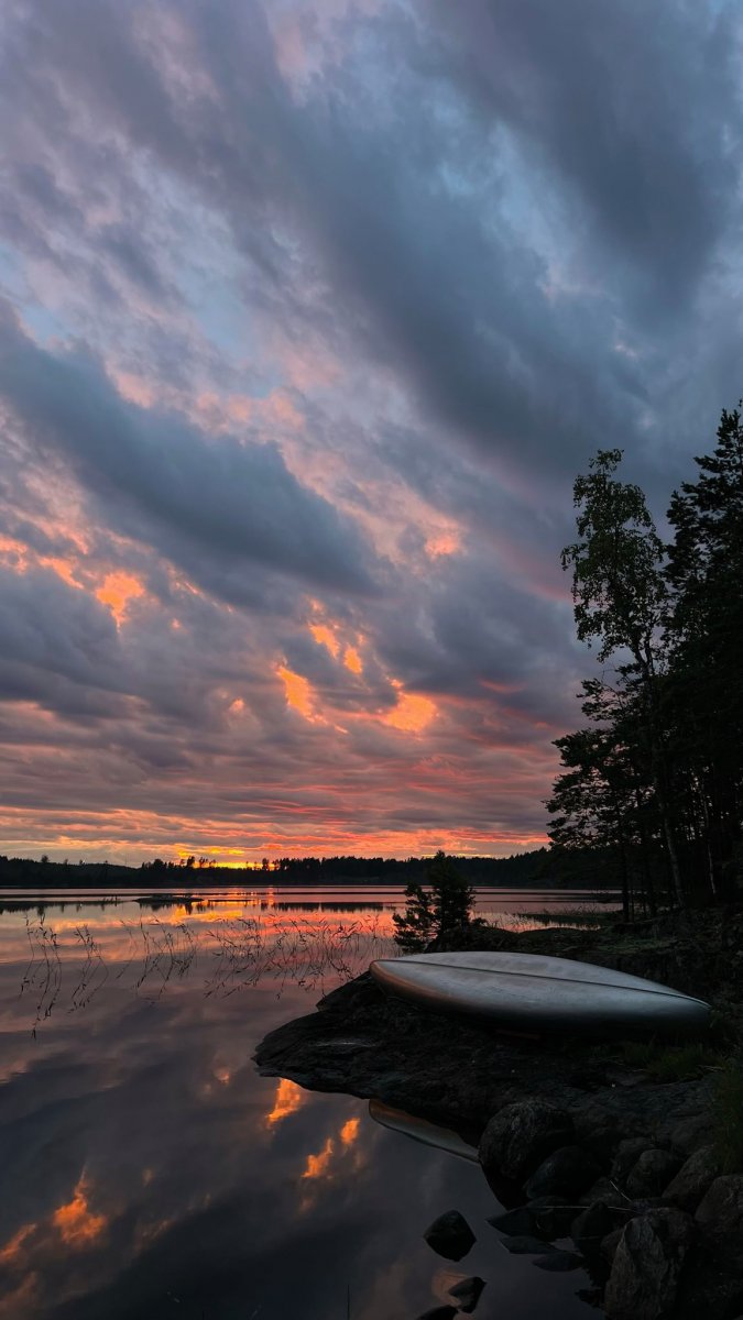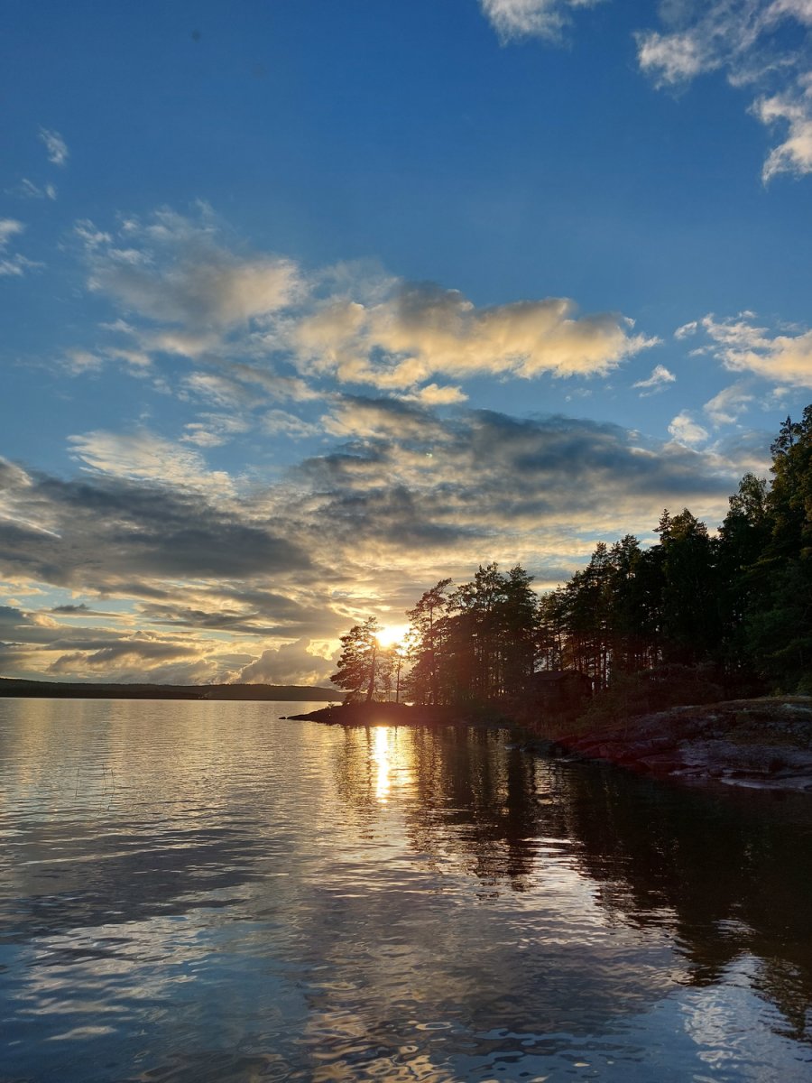 Der Tag der Anreise begann wie im Jahr zuvor.. mit starkem Regen. Dieser ließ im Laufe des Tages aber glücklicher Weise nach und als wir am Nachmittag zum Flughafen Halle/Leipzig fuhren, erstrahlte schon wieder der Sonnenschein. Die BusfahrerInnen Lars und Joanna fuhren uns souverän nach Lennartsfors und die fast 18 Stunden Busfahrt gingen wie im Flug um. Diesmal waren wir der erste Bus, der ankam, sodass es im Basiscamp noch recht leer war und wir weder an der Ausrüstungs- noch an der Kanuausgabe warten mussten. Also schnell die Sachen umgepackt und schon ging das Abenteuer los. Bei 21 Grad und Sonne-Wolken-Mix fuhren wir gemütlich in unserem Kanu und die Entspannung setzte von dem Moment ein, als wir den Steg verließen. Während der Fahrt schauten wir immer, was uns aus dem letzten Jahr noch bekannt vorkam und was eben nicht. Nach etwa 2,5 h hatten wir unseren Schlafplatz für die erste Nacht auserkoren. Eine kleine süße Insel, die wir nur für uns hatten. Kaum angelegt und ausgepackt, stillten wir erstmal unseren Mittagshunger mit unserem mitgebrachten, schon vorgekochten Essen. Danach überkam uns ein unerwarteter Schauer. Schnell legten wir die Gewebeplane über uns und all das Gepäck und verharrten dort, bis der Regen nachließ. Die Regenpause nutzten wir zum Lageraufbau. Danach wurden wir belohnt mit einem wunderschönen Sonnenuntergang, wie man ihn hier aus Schweden kennt. Glücklich konnten wir uns danach bettfertig machen und die erste Nacht in der Natur einläuten.