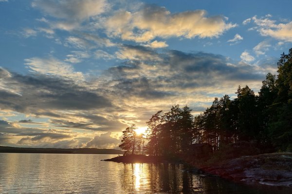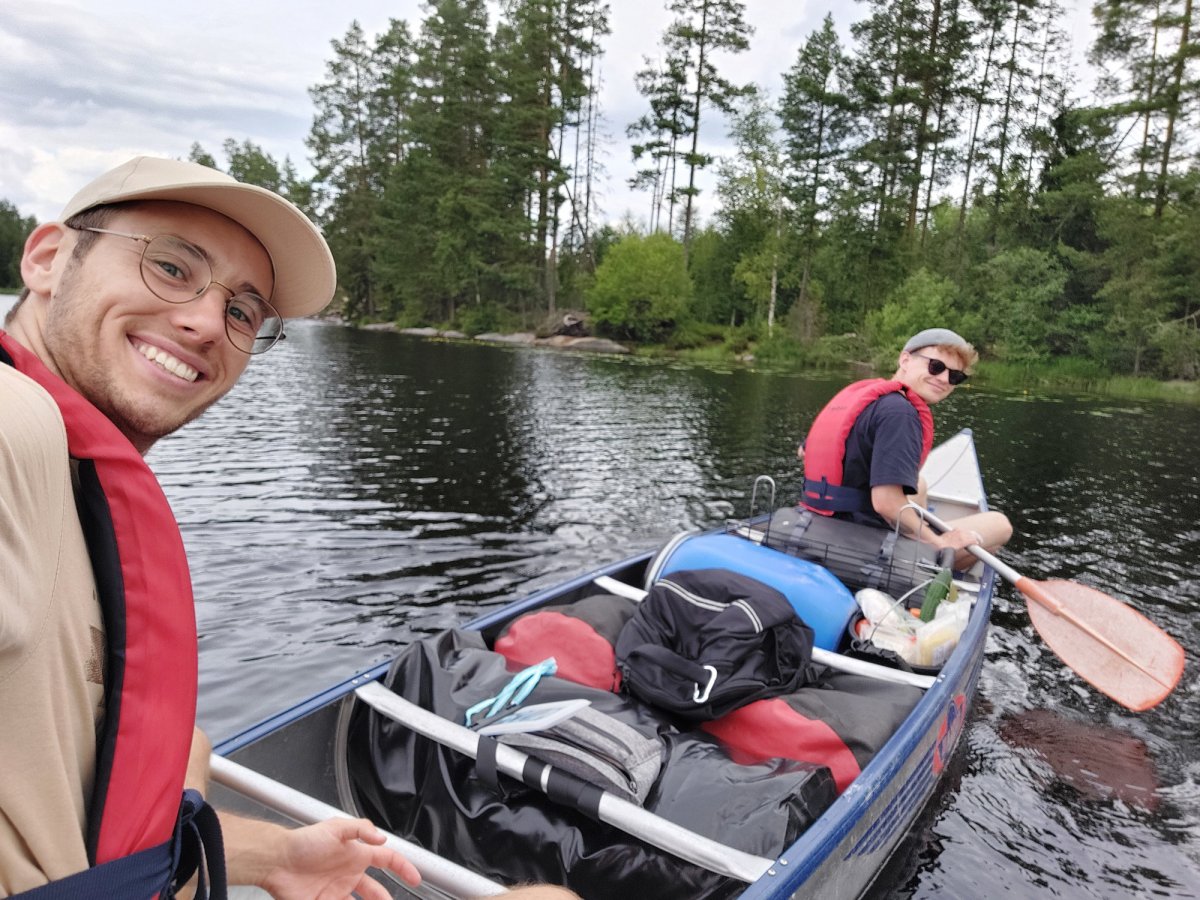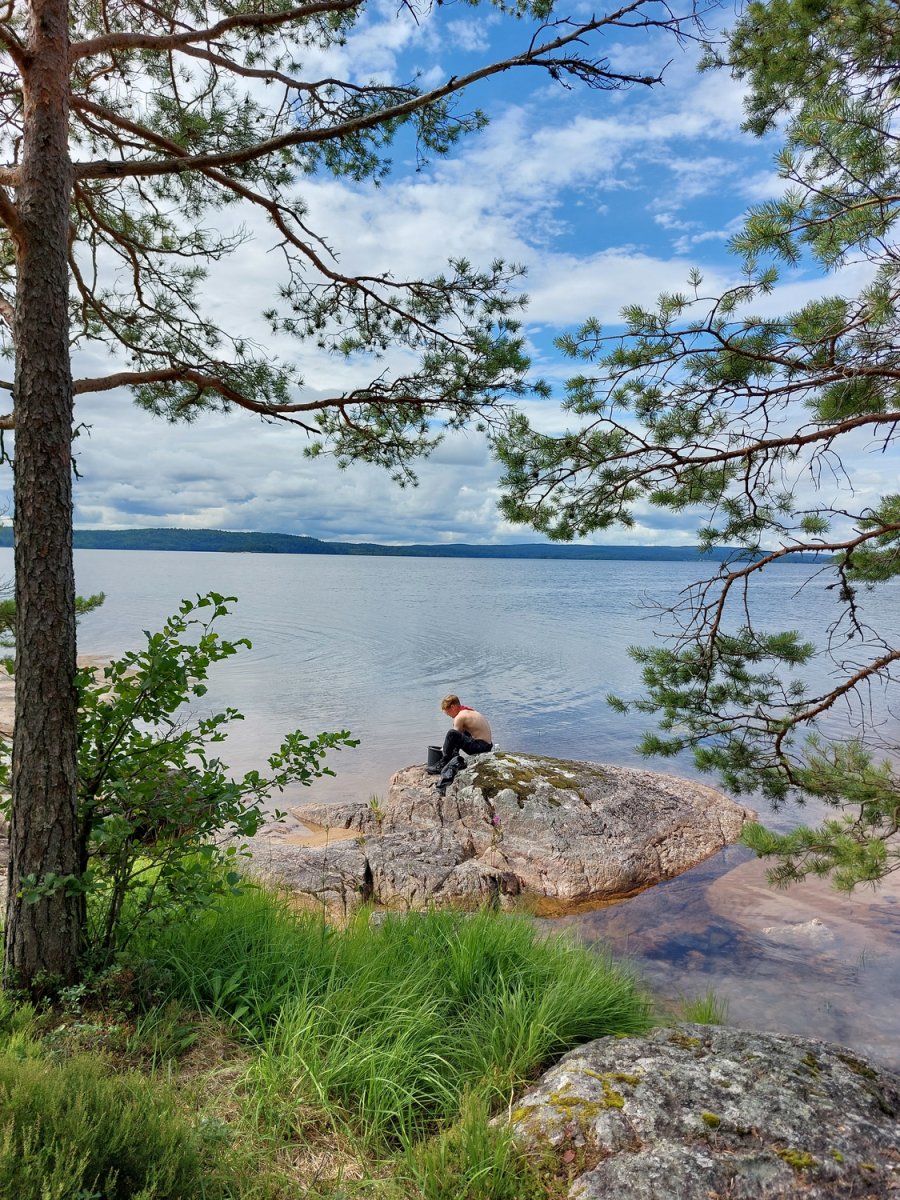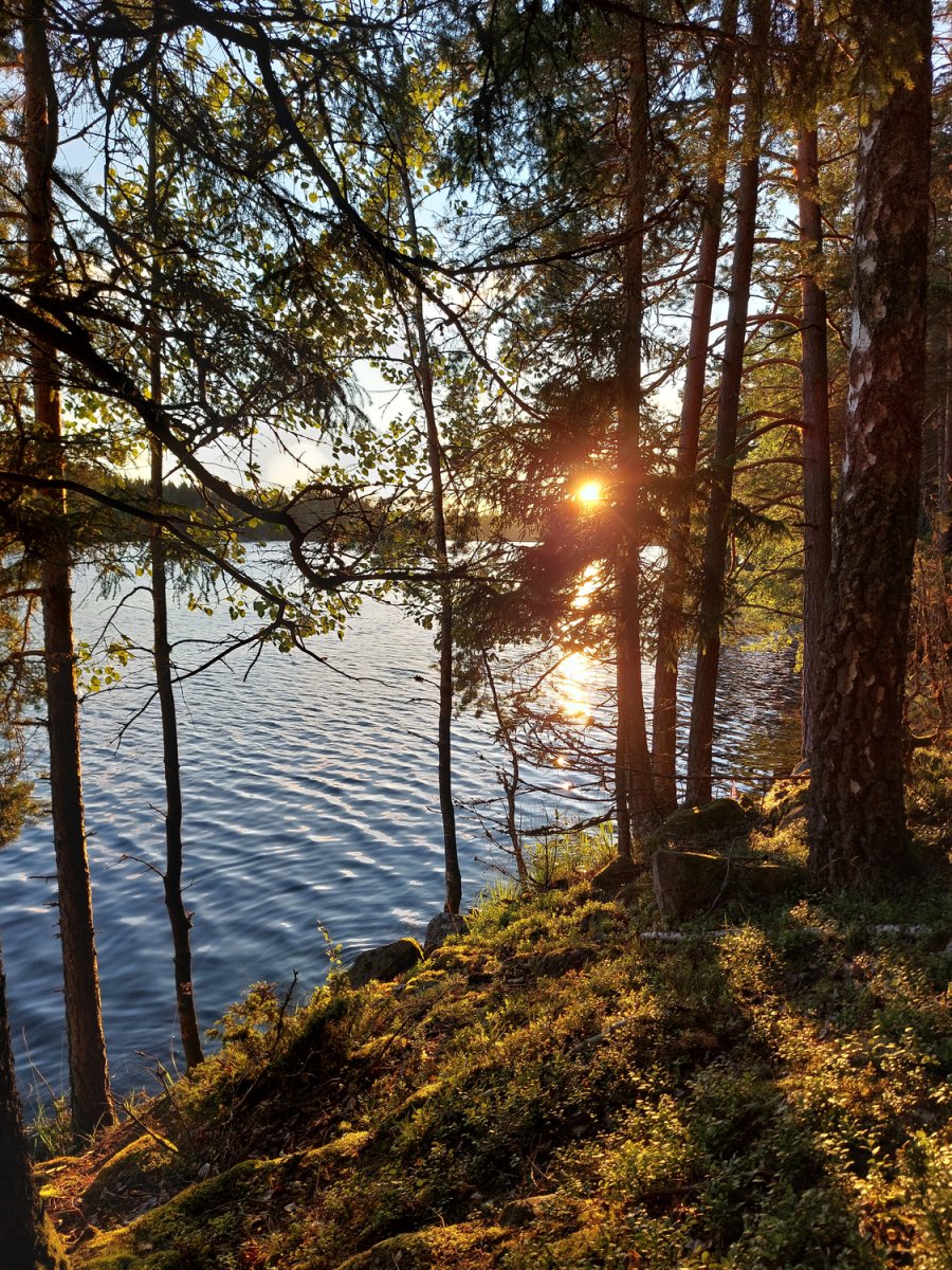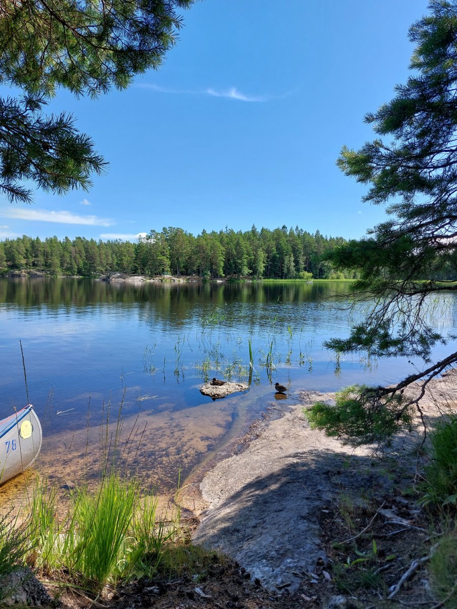 Der Tag der Anreise begann wie im Jahr zuvor.. mit starkem Regen. Dieser ließ im Laufe des Tages aber glücklicher Weise nach und als wir am Nachmittag zum Flughafen Halle/Leipzig fuhren, erstrahlte schon wieder der Sonnenschein. Die BusfahrerInnen Lars und Joanna fuhren uns souverän nach Lennartsfors und die fast 18 Stunden Busfahrt gingen wie im Flug um. Diesmal waren wir der erste Bus, der ankam, sodass es im Basiscamp noch recht leer war und wir weder an der Ausrüstungs- noch an der Kanuausgabe warten mussten. Also schnell die Sachen umgepackt und schon ging das Abenteuer los. Bei 21 Grad und Sonne-Wolken-Mix fuhren wir gemütlich in unserem Kanu und die Entspannung setzte von dem Moment ein, als wir den Steg verließen. Während der Fahrt schauten wir immer, was uns aus dem letzten Jahr noch bekannt vorkam und was eben nicht. Nach etwa 2,5 h hatten wir unseren Schlafplatz für die erste Nacht auserkoren. Eine kleine süße Insel, die wir nur für uns hatten. Kaum angelegt und ausgepackt, stillten wir erstmal unseren Mittagshunger mit unserem mitgebrachten, schon vorgekochten Essen. Danach überkam uns ein unerwarteter Schauer. Schnell legten wir die Gewebeplane über uns und all das Gepäck und verharrten dort, bis der Regen nachließ. Die Regenpause nutzten wir zum Lageraufbau. Danach wurden wir belohnt mit einem wunderschönen Sonnenuntergang, wie man ihn hier aus Schweden kennt. Glücklich konnten wir uns danach bettfertig machen und die erste Nacht in der Natur einläuten.