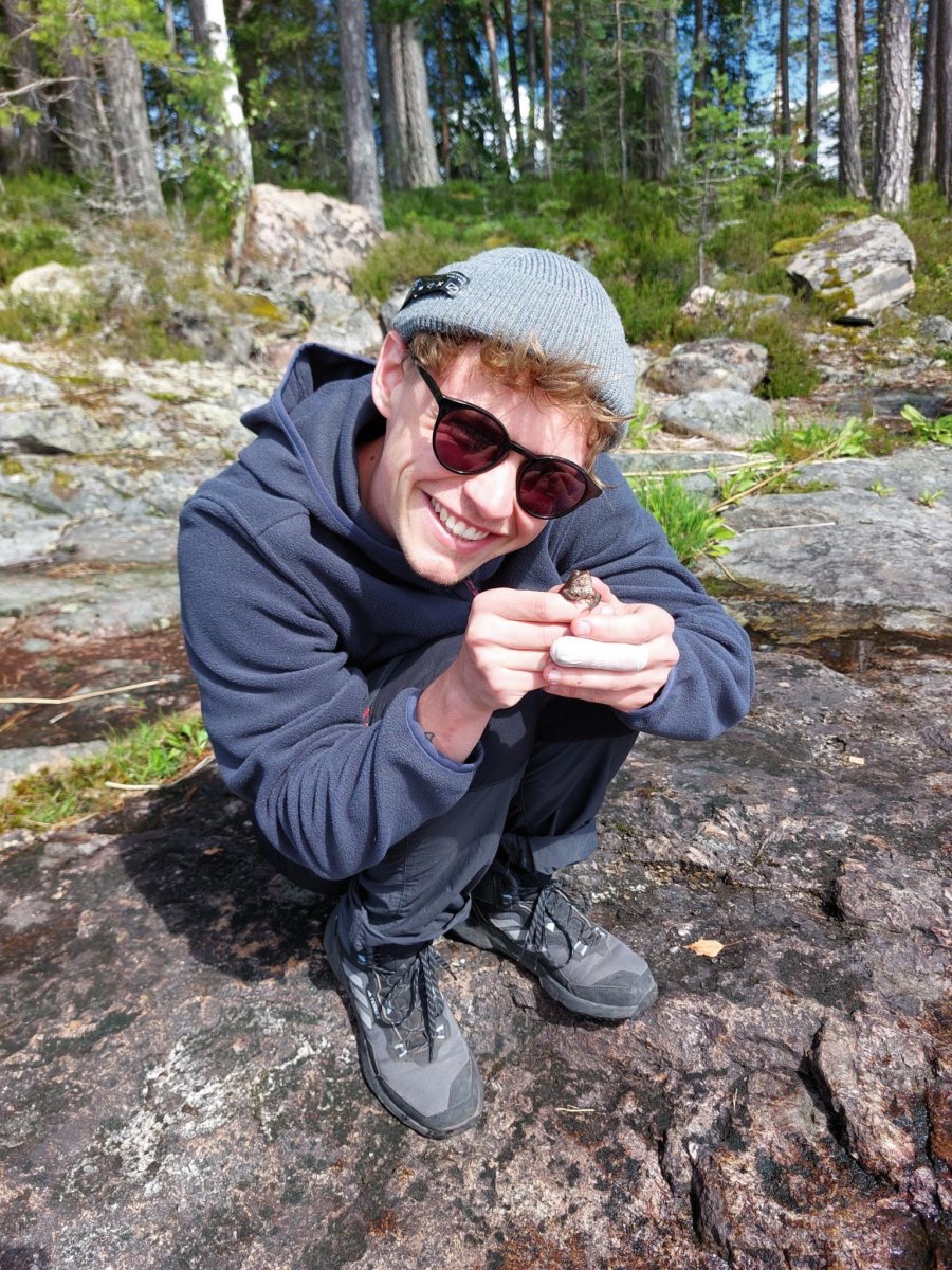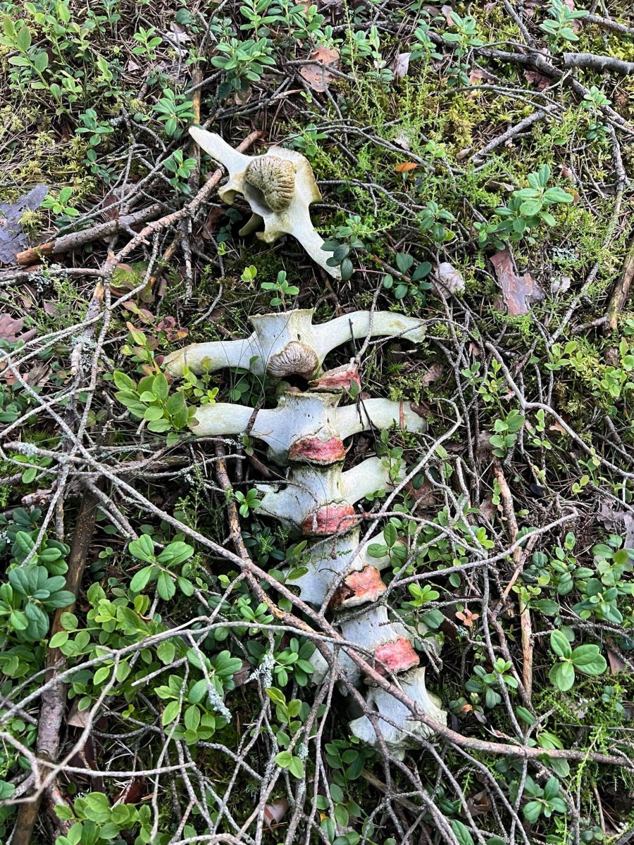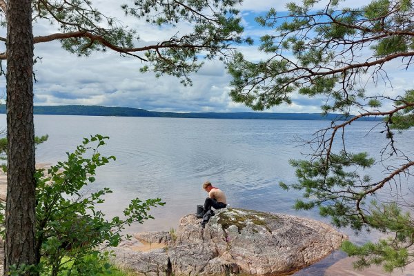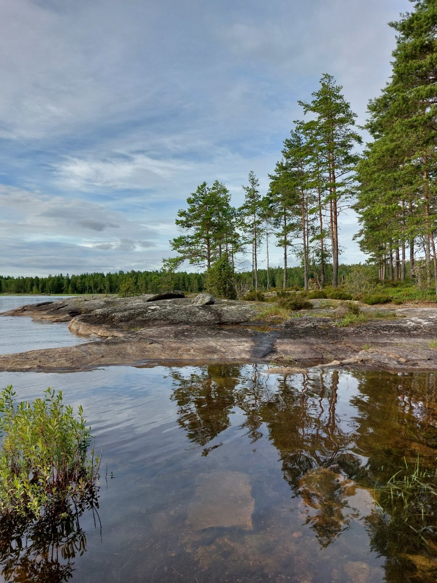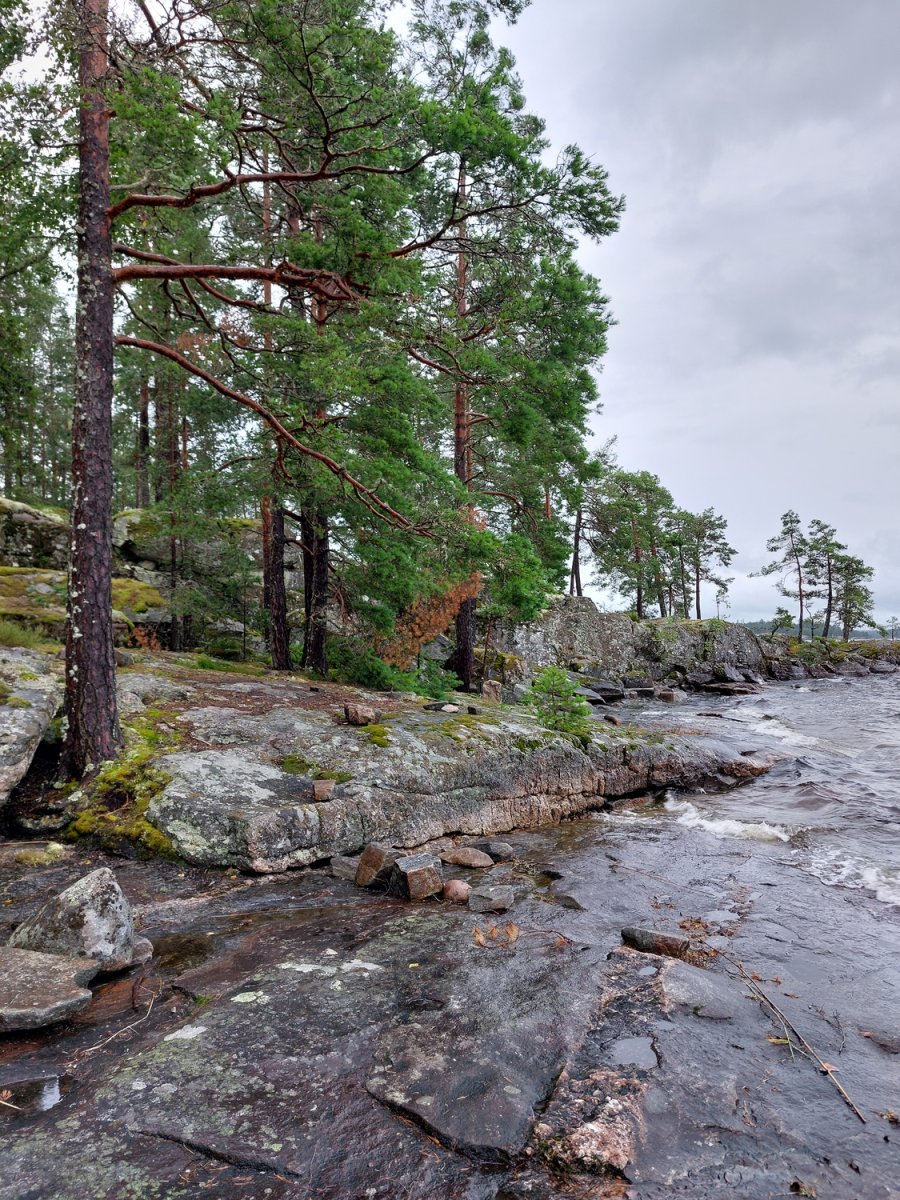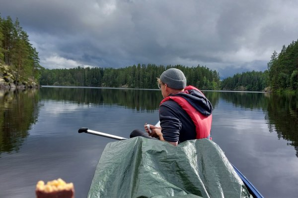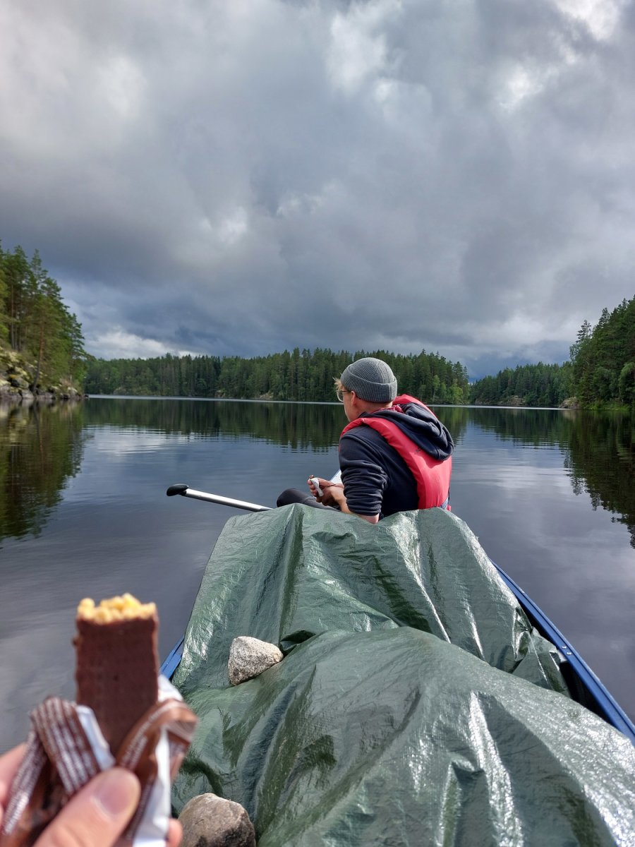 Nach einer sehr regenreichen Nacht und einem ebenso regenreichen Morgen haben wir erst gegen 12 Uhr das Zelt verlassen können. Das Frühstück zur Mittagszeit war dann auch bitter nötig und nachdem wir gegen 15 Uhr endlich alles zusammengepackt hatten, ging es für uns wieder aufs Wasser. Unser Ziel war, die Flöte Fjorde zu durchqueren, um den schmaleren Abschnitt des Stora Le zu erkunden. Leider entpuppte sich dies später als schlechte Idee, da wir nicht wirklich gute Schlafplätze sichten konnten - und wenn, dann waren die wenigen bereits belegt. Da wir gerne alleine bleiben wollten, sind wir immer weiter voran gefahren. Da für den Abend wieder Regen angekündigt war, hatten wir etwas Druck im Nacken, endlich einen Platz zu finden. Gegen 18 Uhr haben wir uns dann für einen semi-guten Stellplatz entschieden und möglichst schnell alles aufgebaut. Zwischen den Bäumen stand ein kleiner Steinkreis, in welchem augenscheinlich Feuer gemacht wurde und oben drauf lag ein kleiner Schädel, welcher nach einem kleinen Raubtier wie Mader oder ähnlichem aussah. Als Biologe ging mein Herz für Knochen auf und ich beschloss ihn mitzunehmen. Wie abgepasst hat es dann mit dem Regen begonnen. Zum Abendbrot kam dann jedoch nochmal die Sonne raus und wir konnten Tortellini mit Käsesauce und Champignons kochen. Später dann sind wir nochmal auf eine kleine Erkundungstour gegangen und haben ca. 100-150 Meter von unserem Zelt entfernt ein Becken und den Steiß eines größeren Tieres gefunden. Kurz war uns etwas mulmig und nach ein paar weiteren Metern fanden wir außerdem Wirbelkörper und Rippen. Nach ausgiebigem Rätseln haben wir entschlossen, das dies ein Rind gewesen sein muss, welche vermeintlich von einem Wolf gerissen wurde. Ein ungutes Gefühl überkam uns, als wir einen großen Kothaufen fanden, welcher zu groß für Wolfskot und zu klein für einen Kuhfladen war. „Dank“ Google hätte er gut zu einem Bären gepasst - waren uns jedoch nicht wirklich sicher, ob dies überhaupt sein kann, da hier in der Gegend nicht unbedingt Bären auftreten. Mit einem anhaltenden unguten Gefühl ging es dann zurück zum Zelt, wo wir uns schnell bettfertig machten, um dann in den Schlafsack zu springen. Drinnen fühlten wir uns dann allerdings recht sicher und wir fanden kurz vor 1 Uhr in den Schlaf.