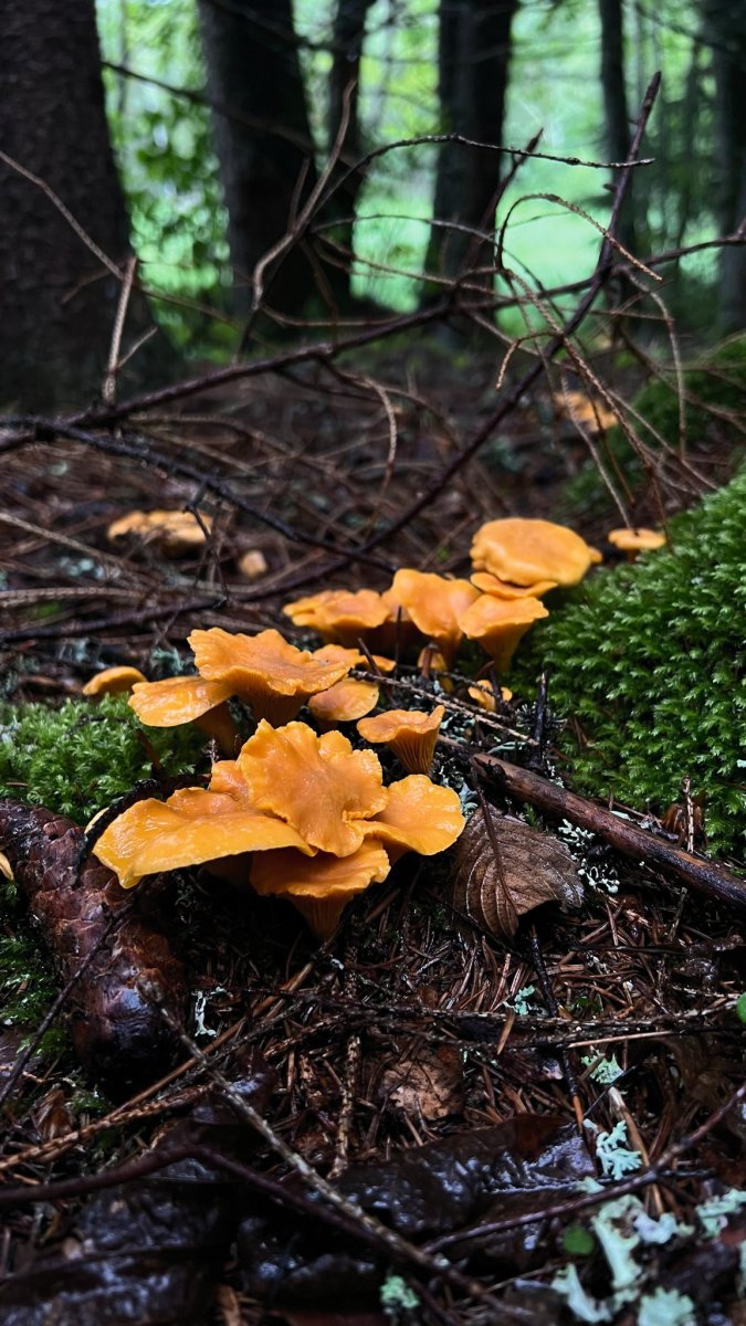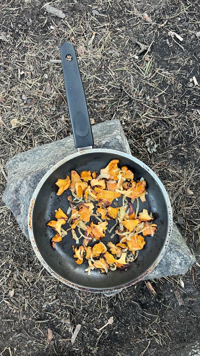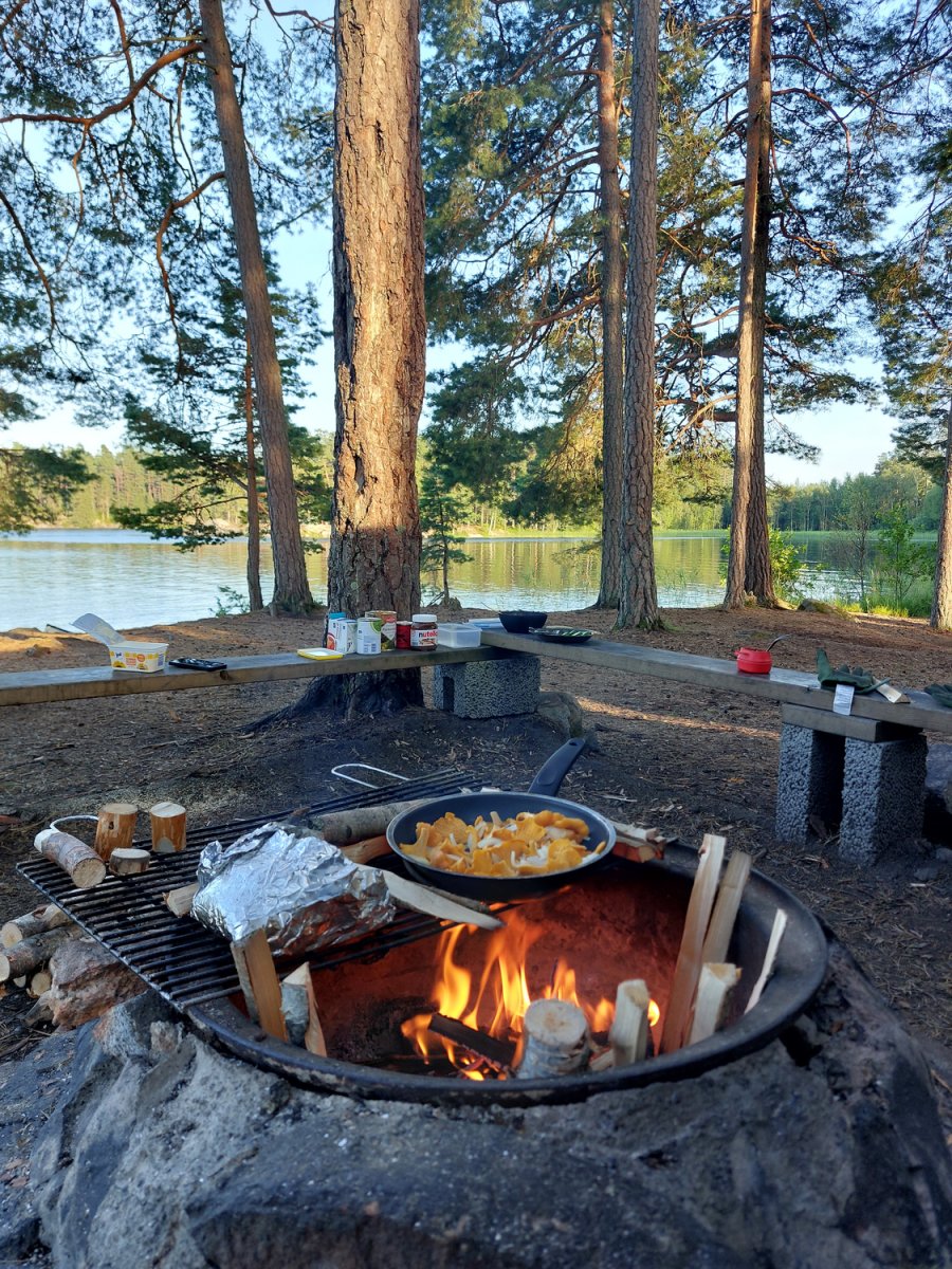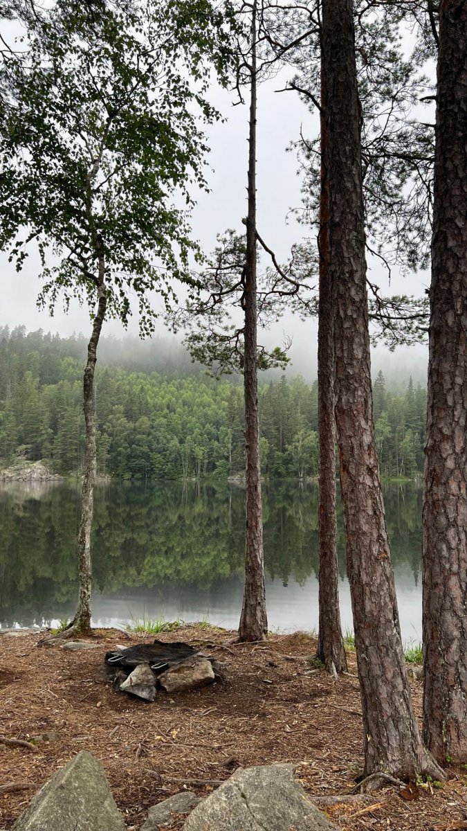 Nach einer langen und ruhigen, aber regnerischen Nacht, wachten wir an einem ebenso regnerischen Morgen auf. Der See war optisch kaum vom Umland zu unterscheiden, weil es so diesig war. Wir freuten uns sehr, dass unser Frühstück schon fertig war. Also genossen wir unsere Pancakes mit Heidelbeermus im Zelt. Abgesehen von Klogängen und essen holen und machen, verbrachten wir die meiste Zeit des Tages im Zelt, weil es von 8-18 Uhr regnen sollte. Die Zeit verging erstaunlich schnell, obwohl wir nicht viel machten, außer nappen, quatschen und ein bisschen spielen. Wir fieberten auf den Abend hin, wo der Regen endlich aufhören sollte. Doch das Ende kam und kam nicht. Die Wetterapp schob das potentielle Ende des Regens immer weiter nach hinten, sodass wir uns gegen 19 Uhr entschieden, uns die Regensachen über zu werfen und in den Wald zur Erkundungstour aufzubrechen. Den erhofften Elch fanden wir zwar nicht, dafür aber einen wunderschönen Wald und sehr viele Pfifferlinge. Nachdem wir von der 3-stündigen Wanderung wiederkamen, hauten wir noch die Pilze in die Pfanne und aßen ein spätes Abendmahl. Danach machten wir uns fertig fürs Bettchen und gingen, immernoch im Regen, spät ins Zelt.