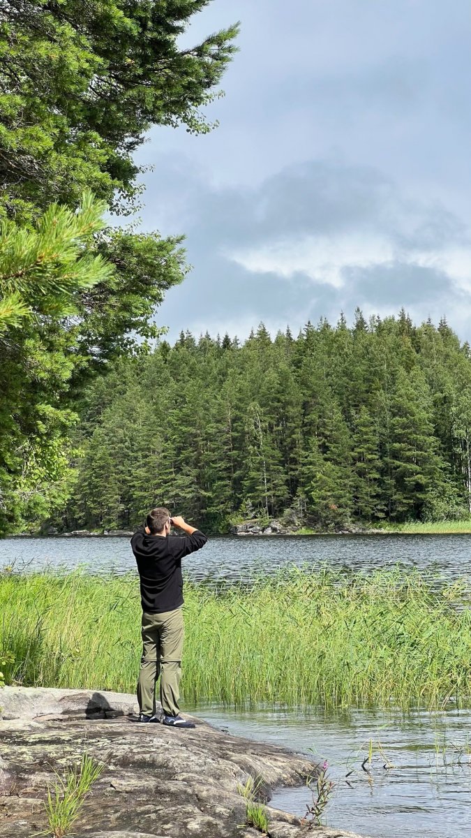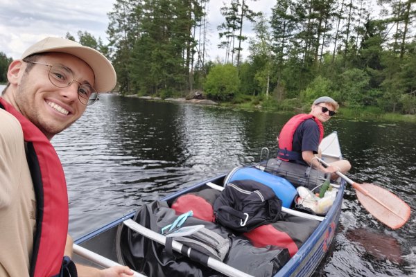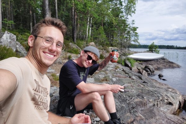 Den Abreisetag begannen wir ganz entspannt, da wir aus dem Vorjahr wussten, dass man lange warten musste, um seine Sachen zurückzugeben. Deswegen entschieden wir uns dazu, die Zeit lieber noch in der Natur zu verbringen. Der Himmel war strahlend blau und wolkenlos und auch die Sonne heizte bereits was das Zeug hielt. Nach einem letzten entspannten Frühstück am See räumten und sortierten wir einmal vor, damit es später schneller ging. Auf der Fahrt zum Basiscamp sahen wir bereits schon die Neuankömmlinge auf dem Wasser, aber auch die Abreisenden machten sich mit uns auf den Weg zum Steg. Die Organisation im Camp Höglund lief mal wieder reibungslos und es ging noch schneller als im Jahr zuvor. Nachdem wir alles abgegeben und umgepackt hatten, sind wir nach Lennartsfors gelaufen und haben uns ein Eis, sowie ein Souvenir gekauft. Ab da hieß es warten, bis um 21 Uhr der Bus abfahren sollte. Auf der Adventure Road haben wir nochmal Heidelbeeren gesammelt und dabei sogar Elch-Losung gefunden - jedoch konnten wir nichts Verdächtiges in der Nähe erspähen. Den Rest der Zeit schnackten wir mit anderen Reisenden und dann war es Zeit einzusteigen. Noch bevor die Fahrt losging erzählten uns die Busfahrer, dass auf den letzten Rückfahrten vom Camp aus Elche gesichtet wurden und dass wir deswegen unsere Augen aufhalten sollten! Und das taten wir, scannten jeden cm in rasender Geschwindigkeit vom Wald ab - in der Hoffnung, einen Elch zu sehen. Und dann kam der Moment - im Vorbeirauschen einer Lichtung sahen wir ihn. Der ganze Bus rief „Elch!“, damit auch jeder ihn rechtzeitig sehen konnte. Der Rest der Fahrt verlief recht unspektakulär, außer dass wir anstelle einer Fähre über die Öresundbrücke gefahren sind. Und mit ein paar Stunden Verspätung sind wir dann in der Heimat angekommen, wo uns wie im letzten Jahr das Empfangskomitee unserer beiden Freundinnen erwartete, was uns sehr freute.
