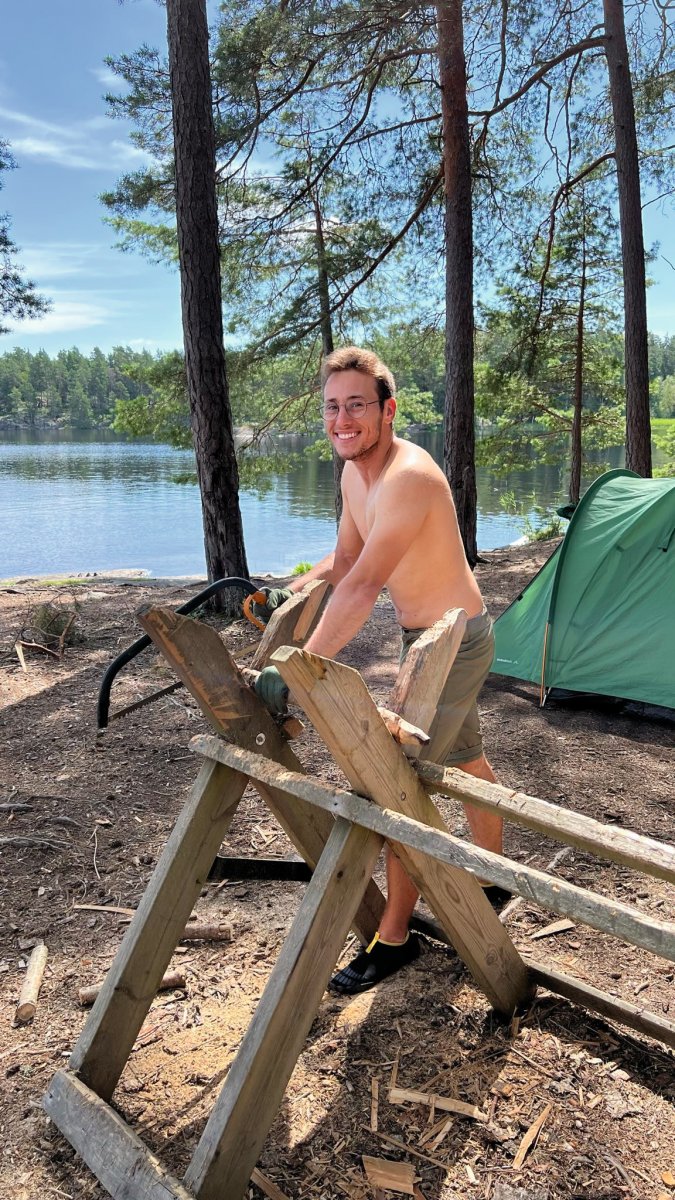 Nach der regenlosen Nacht wachten wir früh, sogar vor dem Weckerklingeln, auf. Da wir mal kein Tarp über das Zelt spannen mussten, war es zeitig hell und die Sonne küsste uns wach. Weil wir für die letzte Nacht einen Lagerplatz mit Feuerstelle finden wollten, wo wir am besten auch noch unter uns sind, wollten wir zeitnah aufs Wasser kommen und lospaddeln. Daher beeilten wir uns früh und stachen schon gegen 8.30 Uhr in See. Auf dem Weg begegneten wir nochmal dem Fischadler vom Vortag, was uns sehr freute. Bereits 10.30 Uhr hatten wir unseren Lagerplatz für den Tag erreicht - DANO 16. Mit dem ganzen Tag noch vor uns bauten wir direkt das Zelt auf und konnten danach den ganzen Tag mit schönen Dingen und Aktivitäten füllen. Wir bereiteten unser Feuerholz für den Abend vor, waren baden, schnitzten Figuren und bastelten uns Arm- und Fußbändchen aus unserem gefundenen Seil als Andenken an diesen wunderschönen Urlaub und als Zeichen unserer Freundschaft.. und das Beste daran: alles bei strahlendem Sonnenschein. Über den Tag begleiteten uns 2 kleine Entchen, die die ganze Zeit am Ufer unseres Lagerplatzes verweilten, sich wuschen, schliefen und auch neugierig verfolgten, was wir da so alles machten. Außerdem kam immer wieder ein Buchfink bei uns vorbei, genauso wie eine Bachstelze. Nachmittags setzten wir bereits den Hefeteig für den Knüppelkuchen/das Stockbrot an, was wir am Feuer machen wollten. Nach langer Gehzeit war der Teig sogar über die Schüssel gequollen. Während wir abends das Feuerchen großzüchteten, bereiteten wir unser 5-Sterne-Menü für den letzten Abend vor: Bruscetta aus Tomaten, Zwiebeln, Knoblauch, Öl und Salz auf Knäckebrot; eine Pfanne aus selbst gesammelten Pfifferlingen mit Zwiebeln; die normale Variante des Knüppelkuchens/Stockbrotes und dazu als Dessert noch Knüppelkuchen/Stockbrot mit einer Margarine-Zucker-Zimt-Mischung. Es war ein Gaumenschmaus und wir waren gut gesättigt und glücklich. Nebenher bereiteten wir sogar noch das ganze Essen für den nächsten Tag vor, sodass wir gut für den Abreisetag gerüstet waren, an den wir eigentlich noch gar nicht denken wollten. Neben Nudeln mit Tomatensoße und diversen Schnitten mit Gurke, gab es auch noch eine Zimtschnecke aus dem übrig gebliebenen Hefeteig. Nach dem ganzen Kochen und Vorbereiten noch schnell abgewaschen und wir konnten den letzten Abend in der Natur Schwedens gemütlich ausklingen lassen. Zum Sonnenuntergang fuhren wir nochmal mit dem Kanu auf den See. Wir flogen und filmten nochmal etwas mit der Drohne, die im Kanu gar nicht so leicht zu landen war. Kurzerhand entschieden wir uns, sie einfach per Hand aus der Luft wieder einzufangen, was auch glückte. Danach genossen wir die letzten Sonnenstrahlen und den malerischen Himmel, den die Sonne einfärbte. Der letzte und wundervolle Tag dieses Urlaubs neigte sich dem Ende. Während wir uns bettfertig machten, bekamen wir noch Besuch von einer kleinen süßen Maus, die sehr flink war, uns aber nicht störte. Wir verstauten alles an Gepäck so, dass sie über Nacht nirgendwo reinkriechen konnte und gingen mit zahlreichen tollen Erinnerungen an die vergangenen Tage ein letztes Mal zum Schlafen in unser Zelt.
