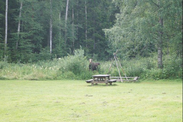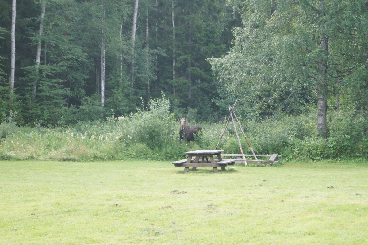 Die Nacht war nicht gerade erholsam. Mitten in der Nacht tobten draußen ungeheurige Geräusche, von denen wir wach wurden und beim besten Willen nicht zuordnen konnten. Es war wirklich extrem laut in der Nacht gewesen und wir (etwas ängstlich) rührten uns nicht bis die Geräusche verschollen. Aufgrund der Unruhe in der Nacht waren wir heute auch schon verhältnismäßig früh auf den Beinen. Wir standen auf und begannen unser Frühstück zu richten. In Ruhe und friedlich saßen wir am Tisch, als wir von weitem irgendwas hörten und sich etwas bewegen sahen. Das etwas kam plötzlich immer näher und wir staunten. Es war ein ELCH! Genüsslich und völlig unbeirrt fing der Elch (Elchkuh) an, Blätter von den Bäumen zu rupfen, was ziemlich laut war. Wir erkannten es als die Geräusche der vergangenen Nacht. Schnell schossen wir ein paar Bilder, doch die Elchkuh lies sich wirklich nicht beirren und blieb bestimmt eine Stunde am Camp.