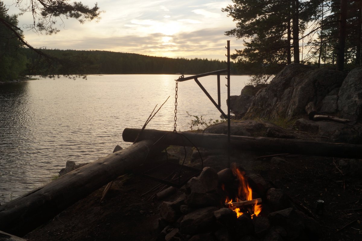 Wir gingen somit heute zurück zur Hütte Nr.23. Dort hatte es uns extrem gut gefallen und wir wollten den schönen Tag etwas am See und in Ruhe genießen und die letzte richtige Nacht in unserer Lieblingshütte verbringen. Da diese Hütte nahe zum Camp lag, kamen an diesem Tag einige andere Kanu-Scandtracker vorbei, die dort ebenfalls nächtigen wollten. So hatten wir nette Urlaubsbekanntschaften am Abend, mit denen wir uns am Abend das Lagerfeuer teilten und den Abend verbrachten. Zum Essen gab es heute den Gemüsereis, mit Speck, Tomatenmark und Zwiebeln.