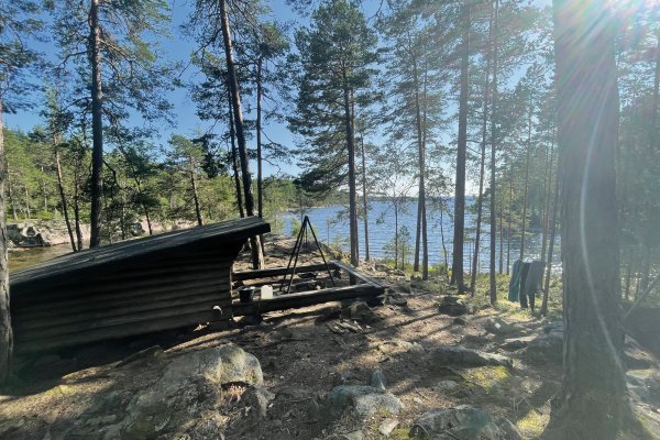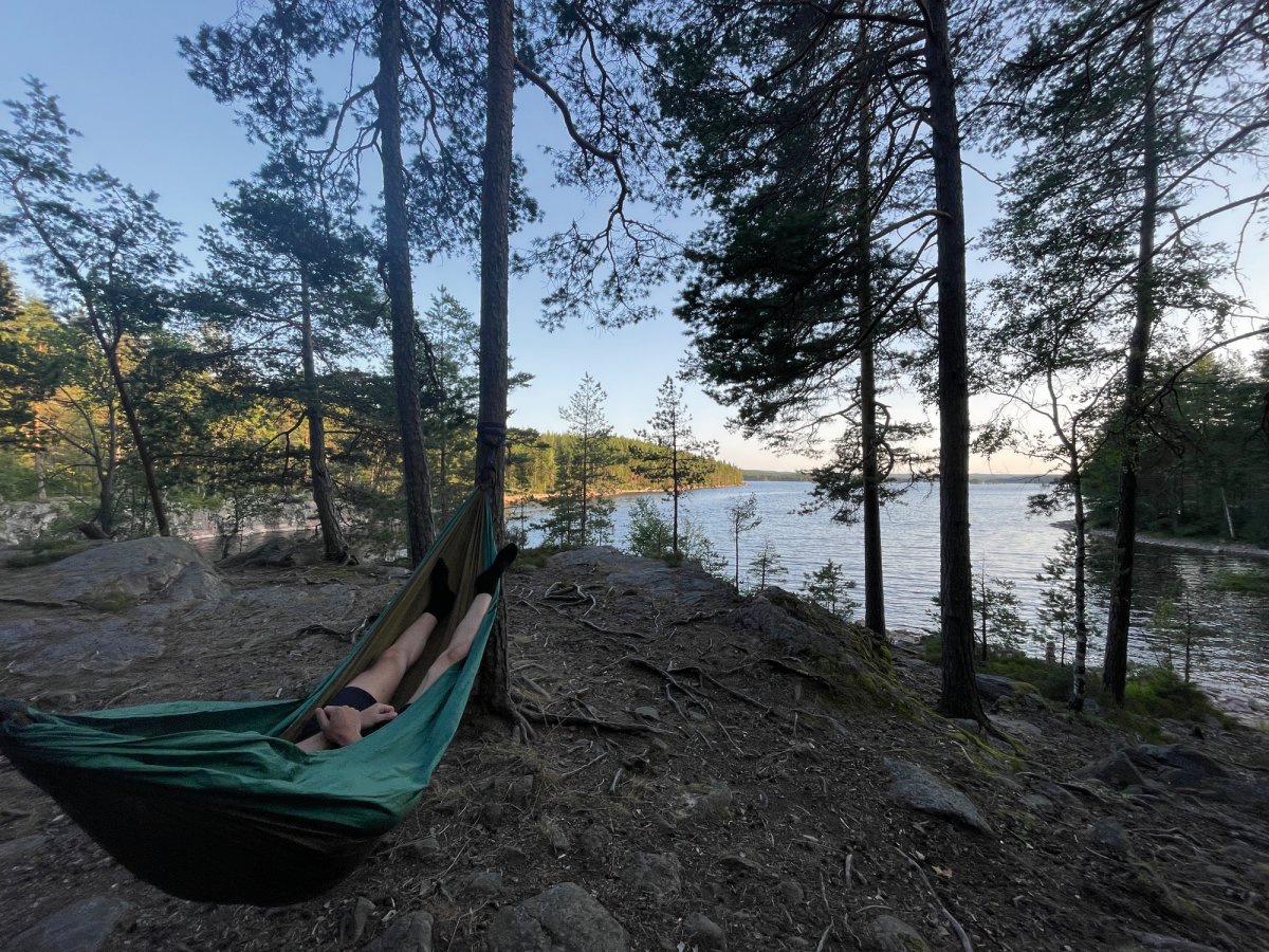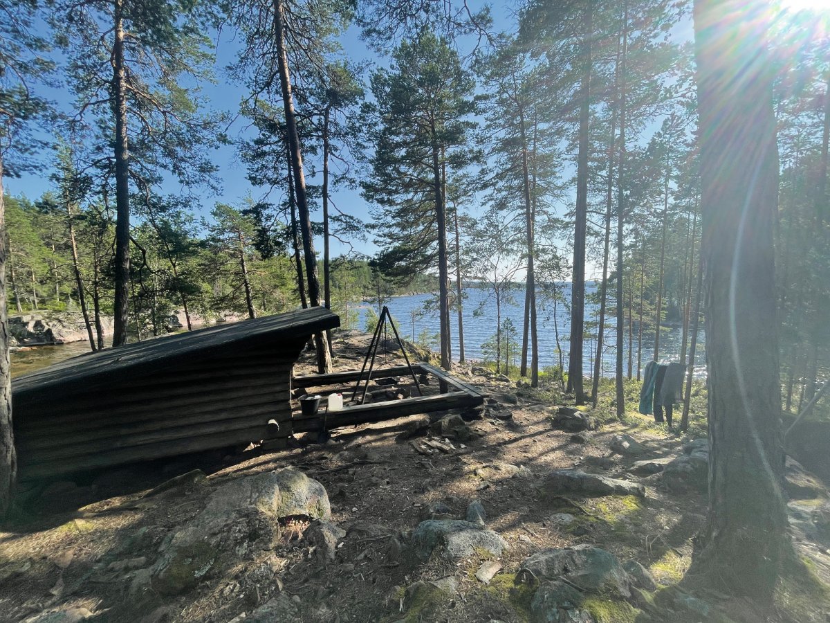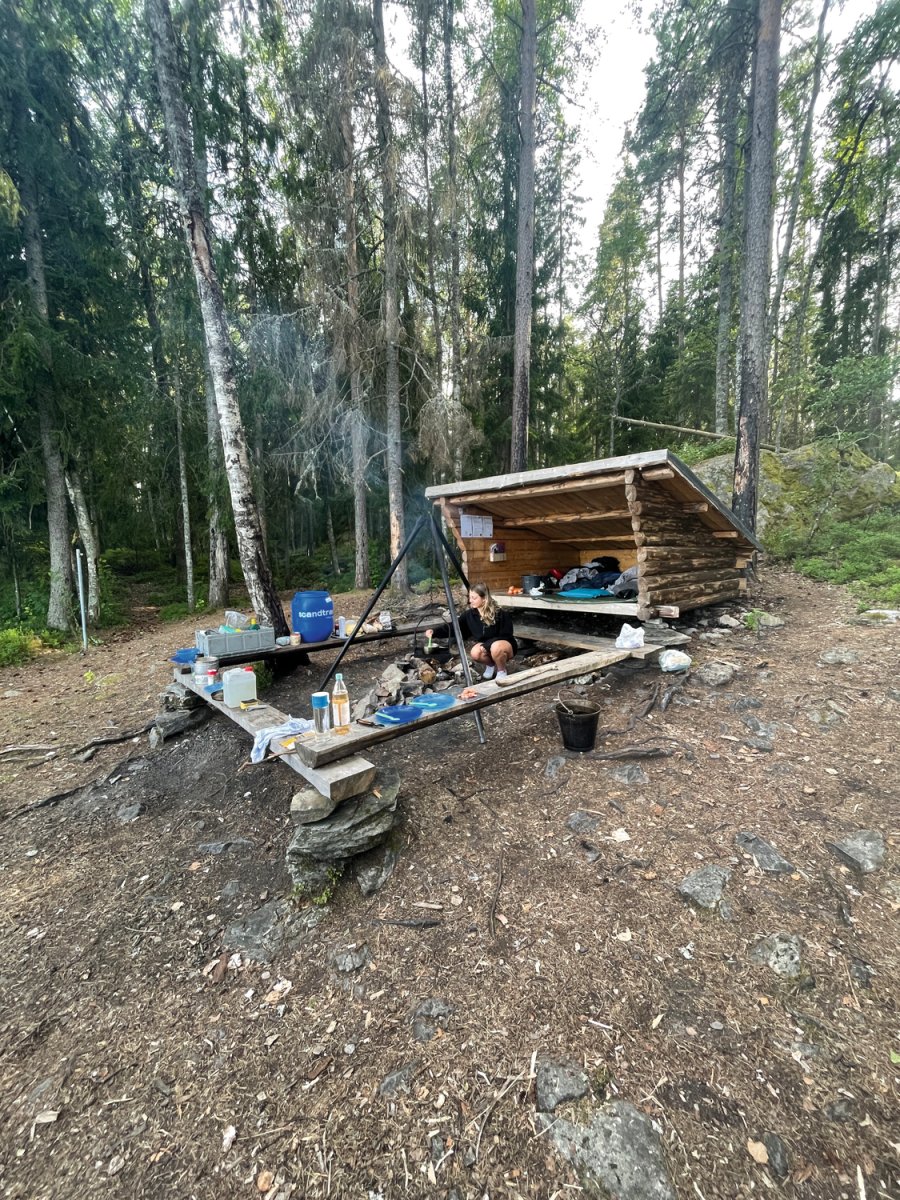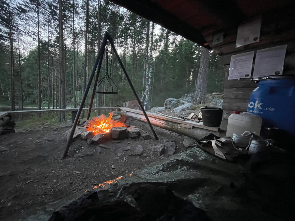 Von hieraus planten wir dann eine größere Tour für den nächsten Paddeltag. Von DANO 8 ging es runter bis Rämäna und von dort folgte eine 7 bis 8 km lange Wanderung zu den Seen Kolsjön und Glaakern – das ganze bei ungewöhnlich hohen Temperaturen im schwedischen Nadelwald, sowie mit Kanu, Provianttonne und Ausrüstung bepackt. Wir kamen am diesem Tag ganz schön ins schwitzen, wurden Abends allerdings mit einer einzigartigen Übernachtungsstelle auf unserer eigenen Insel belohnt. Der nächste Tag startete mit einem kurzen Sprung ins kühle Nass und anschließend einem frisch aufgebrühten Kaffee zum aufwärmen. Danach packten wir kurzerhand unsere Sachen zusammen und paddelten wieder in Richtung Stora Gla. Wieder auf dem Stora Gla angekommen entdeckten wir nach einer kurzen Paddeletappe das etwas versteckte DANO Nr. 12 und verbrachten auch hier zwei Nächte. Diese Windschutzhütte können wir Reisenden besonders empfehlen, sie ist sehr ruhig und etwas erhöht gelegen, ihr seid bis auf wenige Ausnahmen ganz allein und habt einen Blick auf den See.