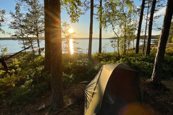 Am Anreise Tag (Samstag) sind wir zuerst 4,5 Kilometer bis zur Bucht im Norden der Insel Skömsnäs auf dem Foxen gerudert, da der Wind aus Süden bzw, Südwesten nicht ohne war. Es war ein Spot welchen ich aus dem vergangenen Jahr schon kannte. Er war perfekt geschützt und somit bauten wir unser erstes Lager auf. Das Wetter war ziemlich wechselhaft in der ersten Woche aber mit zwei guten Tarps im Schlepptau ist das absolut kein Thema. Nachdem wir die Insel etwas erkundet hatten und es auch geangelt wurde, sind wir nach dem Abendessen gegen halb 12 in die Schlafsäcke entschwunden. Wir waren wohlgemerkt auch schon über 30 Stunden auf den Beinen mit der Anreise.