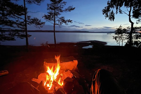 Nun war der Samstag erreicht, wir frühstückten diesmal bei definitiv besseren Wetter an diesem Ort als Bjarne und ich am dritten Tag hatten. Etwas später verabschiedeten sich die beiden von uns und machten sich wieder auf den Weg nach Lennartsfors. Wir beide waren für die Gesellschaft der beiden in diesen zwei Tagen so dankbar und es hat die Zeit einfach noch unvergesslicher gemacht. So schnell die beiden da waren, waren sie nach diesen zwei Tagen auch wieder weg. Bjarne und ich fühlten uns doch etwas alleine. Auch wenn wir zu zweit waren. Es war keine Trauer aber auch kein Gefühl der Freuden. Irgendwo dazwischen und somit starteten wir bei Wind und Regen mit Ziel noch den Foxen zu überqueren und durch den Seitenarm bis nach Norwegen gelangen. Allerdings hat uns der Wind auf den See dann ganz schön zugesetzt. Ich sage einfach nur Abenteuer und ab durch da. Natürlich mit na gewissen Portion Verstand. Auf der anderen Seite des Sees musste ich erstmal auf Bjarne warten, weil der Wind ihn hinter einer Insel getrieben hatte. Nachdem wir den Seitenarm durchquert hatten, kamen wir an der letzten Insel an. Diese Insel ist zu zwei drittel Schwedisch und einem drittel Norwegisch. Wir haben uns auf der norwegischen Seite im Wald nahe dem Wasser breit gemacht und waren froh als das Feuer mit Feuerschale auf einer alten Feuerstelle endlich am Brennen war und wir im Trocknen saßen. Es war einfach alles Nass durch das Wetter. Zu alt sind wir an diesem Abend auch nicht mehr geworden.