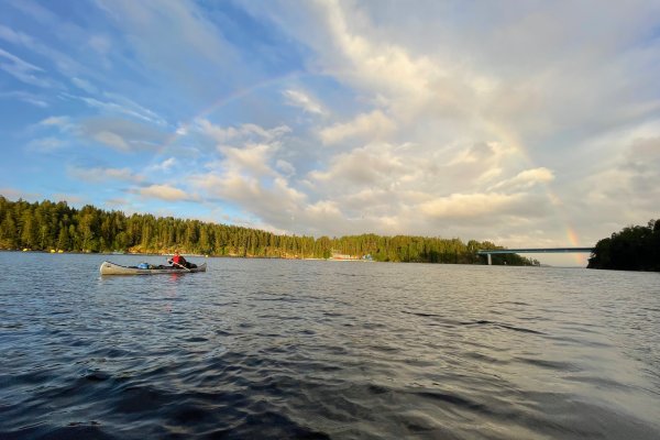 Das Ziel war es bis zum Ende vom Foxen in den Bereich von Dano 20 bis 22 zu gelangen, wo wir besser Windgeschützt wären. Somit brachen wir gegen 18 Uhr auf und waren nach einer Pause auf der Insel Bärön gegen 22 Uhr an der Brücke angelangt. Die Wolken brachen am Horizont auf nach dem wir nur Wind, Wellen und Regen hinter uns hatten. Wir lagen windgeschützt hinter der Insel kurz vor Brücke für eine Pause. Und als wir die Brücke erreichten kam der Regenbogen raus und der Sonnenuntergang überm See erwartetet uns 200 Meter voraus links um die Kurve. Es war einfach ein solch epischer Moment für uns beide. Mein Buddy sagte einfach nur. „David wo sind wir hier?!“