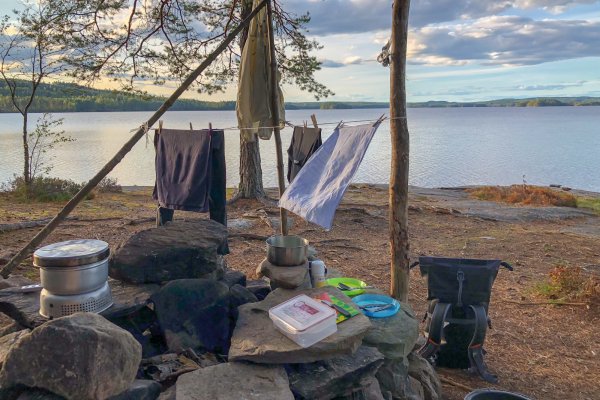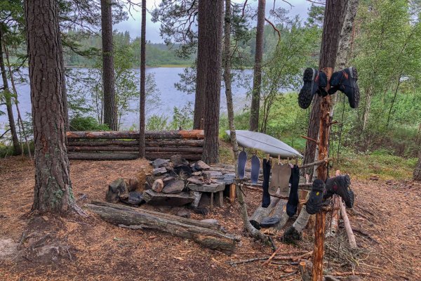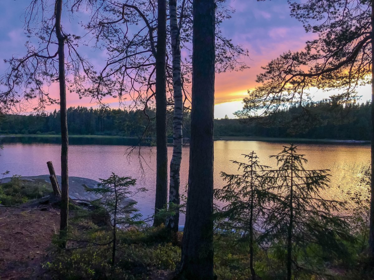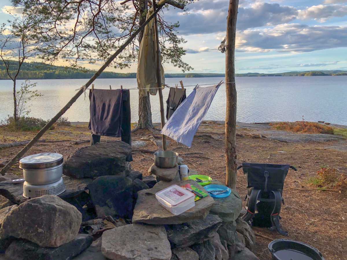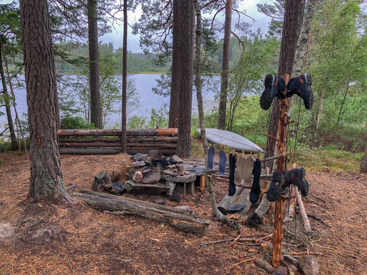 Die Nacht war wie beschrieben unruhig und kurz, das sorgte bei mir für etwas Wehmut und Sorgen, ob die Entscheidung für die Reise die richtige war. Die aufgehende Sonne und ein gutes Frühstück mit Hobo Feuer ließen meine Sorgen verschwinden und die Freude kam zurück. Unsere Wanderschuhe waren auch wieder trocken (welch ein Segen), sodass die Füße wieder wärmer wurden. Bis zum Mittag richteten wir weiter unser Camp ein und entschlossen uns, heute nochmal ohne Gepäck, das Paddeln zu üben. Insgesamt hatte sich das Wetter heute stark verbessert, die Sonne schien und Wind war auch kaum vorhanden. So fuhren wir den See hinauf und kamen mit der Paddeltechnik und unserem Rhythmus immer besser zurecht. Auf unserem Weg kamen wir an den Inseln der anderen Teilnehmer vorbei. Insel sieben ist besonders hervorzuheben, hier steht sogar eine kleine Hütte. Da kommt DANO Feeling auf und bei Regen ganz bestimmt ein Traum. Auf dem Rückweg zu unserer Insel hielten wir am Rand an und sammeln Feuerholz. Heute Abend sollte es Stockbrot geben. Zurück im Lager begannen wir also die Vorbereitung fürs Abendessen. Holz haken, Stöcke schnitzen, Teig anrühren, Tomaten, Zwiebeln, Salami und Speck in Würfel schneiden und natürlich ein Lagerfeuer machen. Wir achteten dabei darauf, dass unsere Glut und Flammen klein blieben, das Feuerverbot war ja erst kurz aufgehoben und der Torfboden noch sehr empfindlich. Die Wärme und der Anblick des Feuers waren einfach wunderschön. Das Brot und unsere Füllung (den Speck, Salami, Zwiebeln und Tomaten hatten wir in der Pfanne angebraten) waren ein wahrer Gaumenschmaus. Leider hatten wir uns bei der Menge des Brots verschätzt und waren nach dem Essen beide noch hungrig. Das war aber kein Problem, die große Essenstonne bot noch reichlich Auswahl, sodass wir uns kurzerhand dazu entschieden einen „RisiBissi“ zu kochen (Reis mit Karotten und Erbsen). Nach dem Essen begann der Sonnenuntergang einzusetzen. Auf einem Felsen vor unserem Lager genossen wir die tolle Atmosphäre. Darum waren wir hier. Die Stimmung hatte ich so bisher an keinem anderen Ort erlebt, das verschwindende Licht hatte einfach etwas Bezauberndes. Nach knapp zwei Stunden, als die Sonne bereits vollständig verschwunden war, zogen wir uns um kurz vor 10 Uhr in unser Zelt zurück. Es war windstill und wir waren gespannt wie die Nacht wird, wir schliefen das erste Mal in unserem Baumzelt.