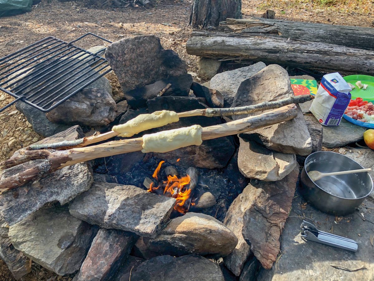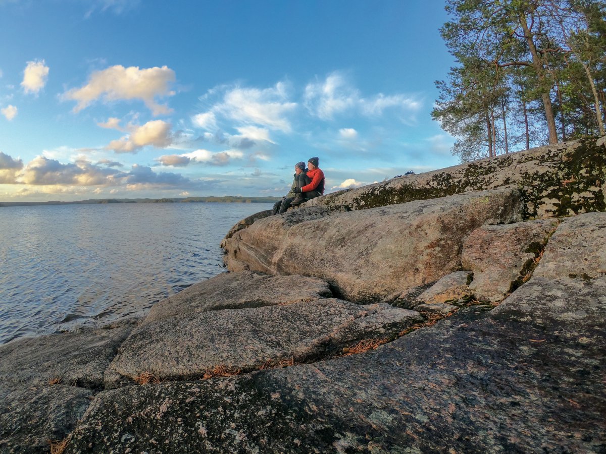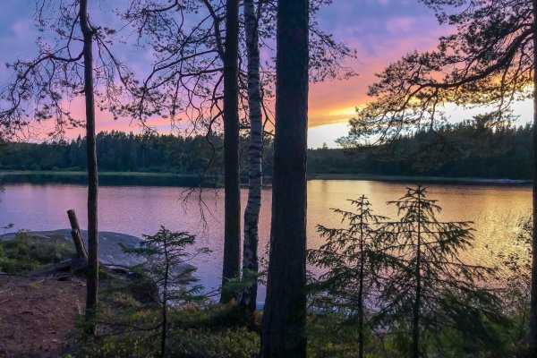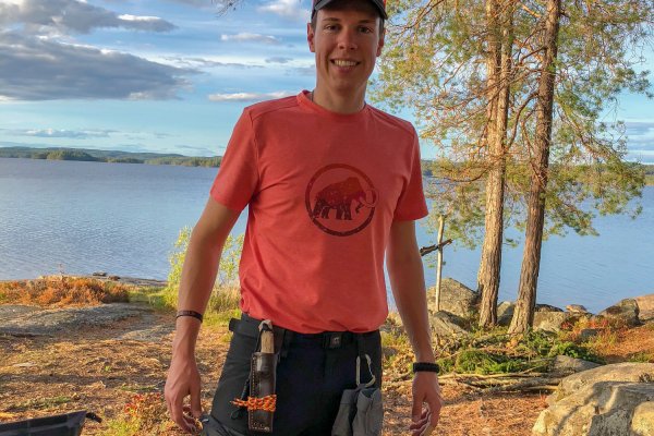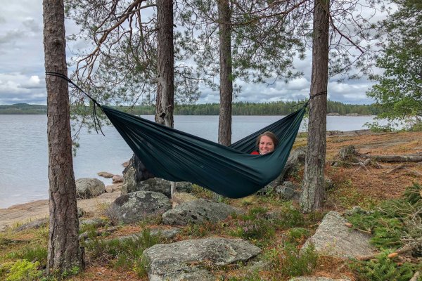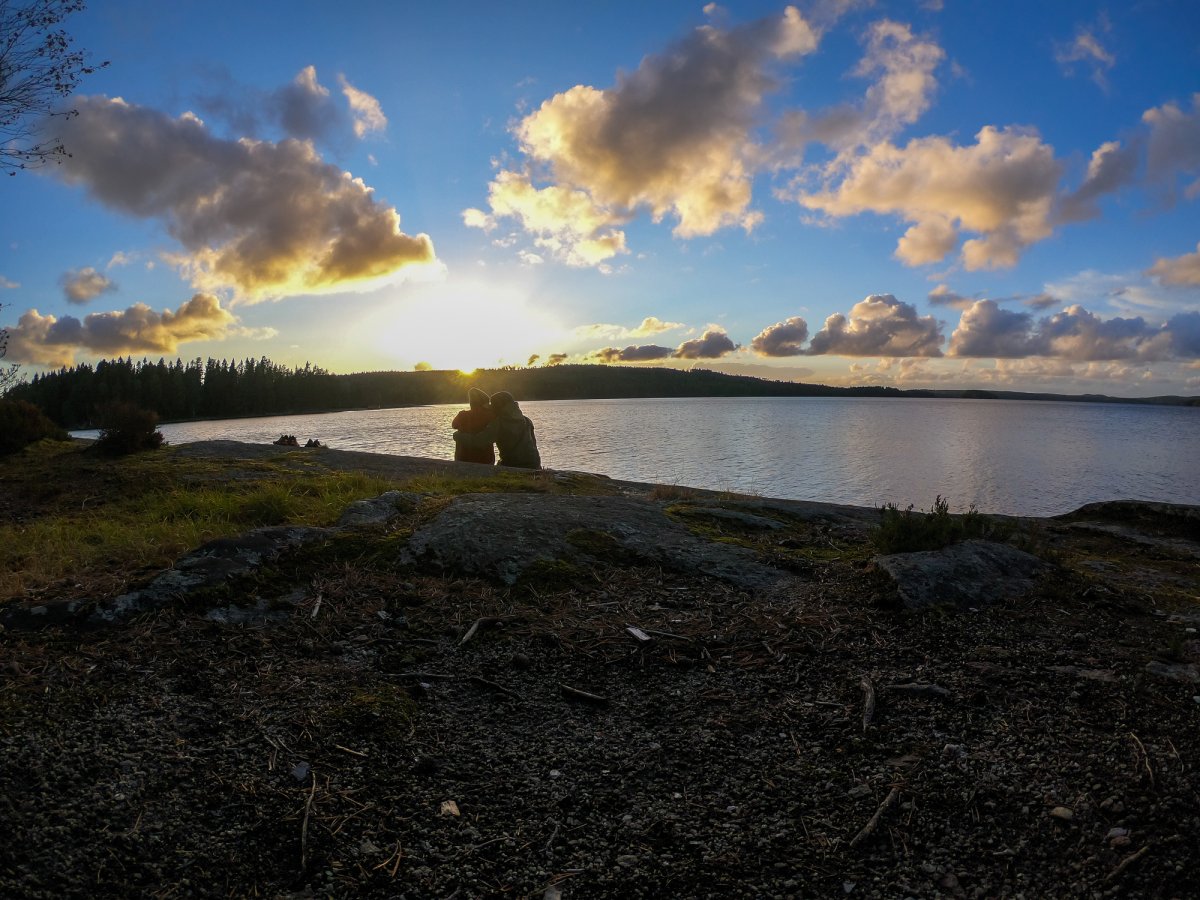 Die Nacht war wie beschrieben unruhig und kurz, das sorgte bei mir für etwas Wehmut und Sorgen, ob die Entscheidung für die Reise die richtige war. Die aufgehende Sonne und ein gutes Frühstück mit Hobo Feuer ließen meine Sorgen verschwinden und die Freude kam zurück. Unsere Wanderschuhe waren auch wieder trocken (welch ein Segen), sodass die Füße wieder wärmer wurden. Bis zum Mittag richteten wir weiter unser Camp ein und entschlossen uns, heute nochmal ohne Gepäck, das Paddeln zu üben. Insgesamt hatte sich das Wetter heute stark verbessert, die Sonne schien und Wind war auch kaum vorhanden. So fuhren wir den See hinauf und kamen mit der Paddeltechnik und unserem Rhythmus immer besser zurecht. Auf unserem Weg kamen wir an den Inseln der anderen Teilnehmer vorbei. Insel sieben ist besonders hervorzuheben, hier steht sogar eine kleine Hütte. Da kommt DANO Feeling auf und bei Regen ganz bestimmt ein Traum. Auf dem Rückweg zu unserer Insel hielten wir am Rand an und sammeln Feuerholz. Heute Abend sollte es Stockbrot geben. Zurück im Lager begannen wir also die Vorbereitung fürs Abendessen. Holz haken, Stöcke schnitzen, Teig anrühren, Tomaten, Zwiebeln, Salami und Speck in Würfel schneiden und natürlich ein Lagerfeuer machen. Wir achteten dabei darauf, dass unsere Glut und Flammen klein blieben, das Feuerverbot war ja erst kurz aufgehoben und der Torfboden noch sehr empfindlich. Die Wärme und der Anblick des Feuers waren einfach wunderschön. Das Brot und unsere Füllung (den Speck, Salami, Zwiebeln und Tomaten hatten wir in der Pfanne angebraten) waren ein wahrer Gaumenschmaus. Leider hatten wir uns bei der Menge des Brots verschätzt und waren nach dem Essen beide noch hungrig. Das war aber kein Problem, die große Essenstonne bot noch reichlich Auswahl, sodass wir uns kurzerhand dazu entschieden einen „RisiBissi“ zu kochen (Reis mit Karotten und Erbsen). Nach dem Essen begann der Sonnenuntergang einzusetzen. Auf einem Felsen vor unserem Lager genossen wir die tolle Atmosphäre. Darum waren wir hier. Die Stimmung hatte ich so bisher an keinem anderen Ort erlebt, das verschwindende Licht hatte einfach etwas Bezauberndes. Nach knapp zwei Stunden, als die Sonne bereits vollständig verschwunden war, zogen wir uns um kurz vor 10 Uhr in unser Zelt zurück. Es war windstill und wir waren gespannt wie die Nacht wird, wir schliefen das erste Mal in unserem Baumzelt.