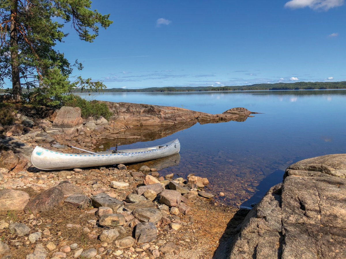 Mit uns sind drei andere Pärchen hier. Wir bekommen von Björn, dem Guide von scandtrack unsere Ausrüstung (Kanu, Zelt, Beil, Säge, Klappspaten, Wasserkanister und weitere nützliche Outdoor Gegenstände) und unsere Verpflegungstonne. Nach einer kurzen Einweisung wie man mit dem Kanu umgeht, werden die Kanus bepackt und die Gruppen starten nacheinander los. Wir haben Insel eins, die anderen Gruppen sind weiter oben am See angesiedelt (fünf, sieben, acht).