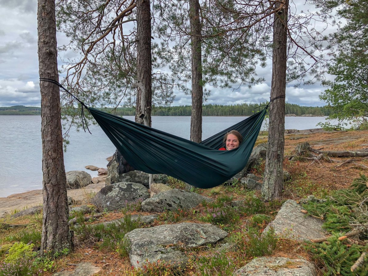 Das Wetter und der Wellengang hatten sich nicht verändert und ein erneutes Abenteuer auf dem Wasser wollten wir erstmal nicht beginnen. Auch der Weg zu Fuß zu Teil eins war so weit, sodass wir uns entscheiden erstmal unser Lager an der zwei einzurichten. Der Teil der Insel ist nicht so einsehbar wie Nummer eins und generell gefiel er uns sehr gut. Wir überlegten, ob wir den Aufenthalt auf unserer Insel aufteilen wollten, das könnten wir spontan entscheiden. Nun wurde erstmal das Zelt aufgebaut. Mittlerweile regnete es auch nicht mehr und wir errichteten fleißig unser Camp. Wir fanden sogar drei passende Bäume für unser Baumzelt!