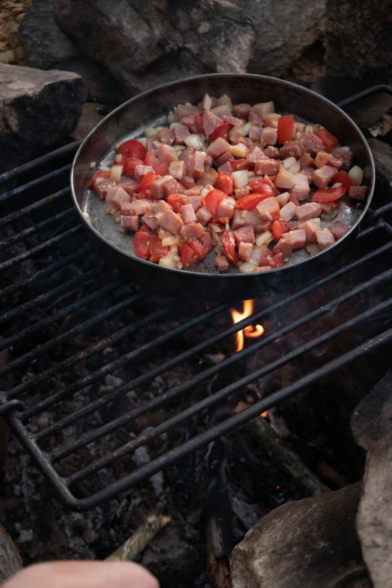 Zum Mittag stand nun wieder Kochen auf dem Programm. In dem Outdoor Kochbuch von scandtrack sind verschiedene Leckereien erklärt, die sich mit der Verpflegungstonne alle umsetzten lassen. Für heute stand die Terence Hill Pfanne auf dem Programm. Das hieß Bohnen, Bohnen und nochmal Bohnen. Am Anfang war ich etwas skeptisch, aber es hat mega gut geschmeckt!