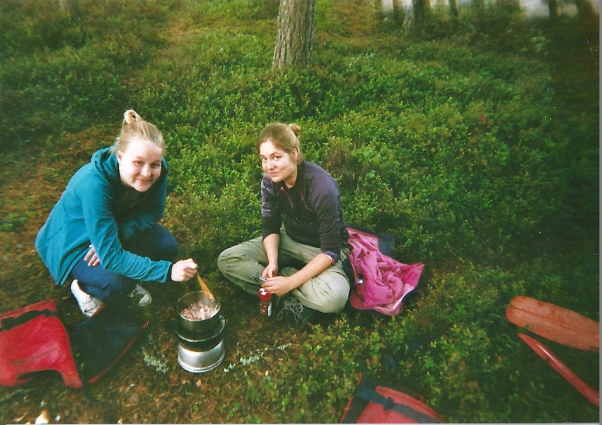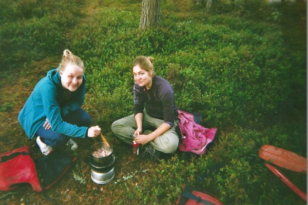 Als sich der Tag langsam dem Ende entgegen neigte, kochten wir eines der zahlreichen Gerichte aus dem der Ausrüstung beigefügten Outdoor-Kochbuch und bereiteten für den späteren Abend Stockbrotteich vor. Den Abend verbrachten wir zusammen mit weiteren Kanuten am Lagerfeuer des Zeltplatzes. Neben netten Gesprächen in entspannter Atmosphäre knabberten wir an unserem Stockbrot, welches an der einen oder anderen Stelle dem Feuer leider doch etwas zu nah gekommen war. Dieser Abend wurde zu einem unvergesslichen Erlebnis: zwar war die Stille in der Nacht für uns Städter schon gewöhnungsbedürftig und auch ein wenig beängstigend – doch näher, als in den Wäldern Schwedens, kann man der Natur nicht sein und das löste eine große Faszination in uns aus.