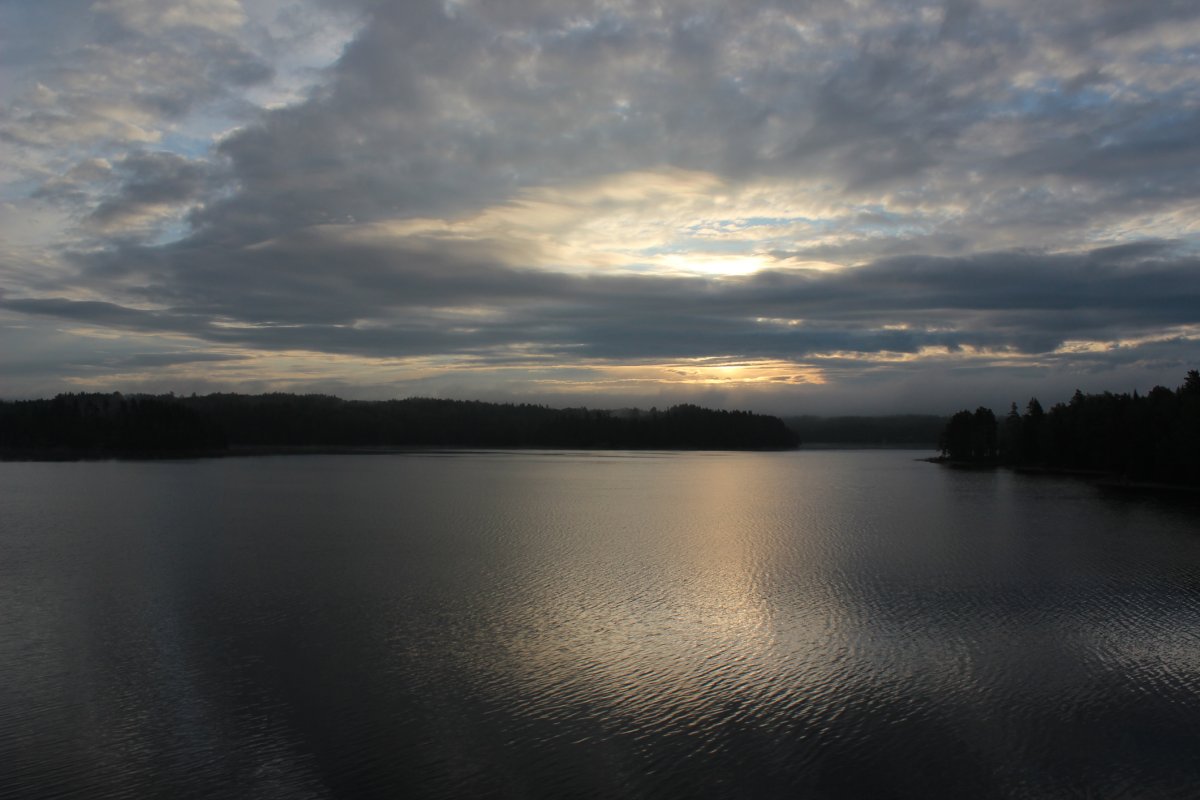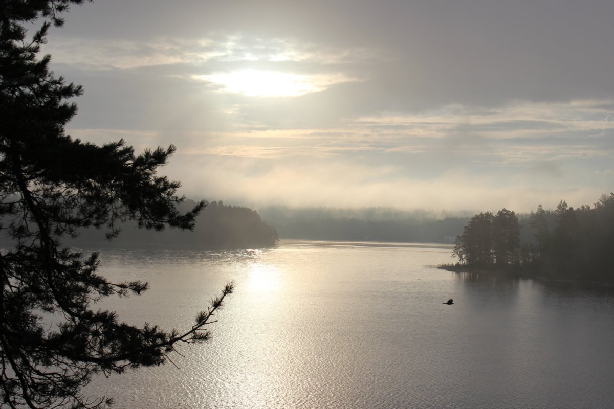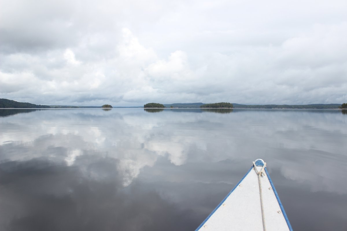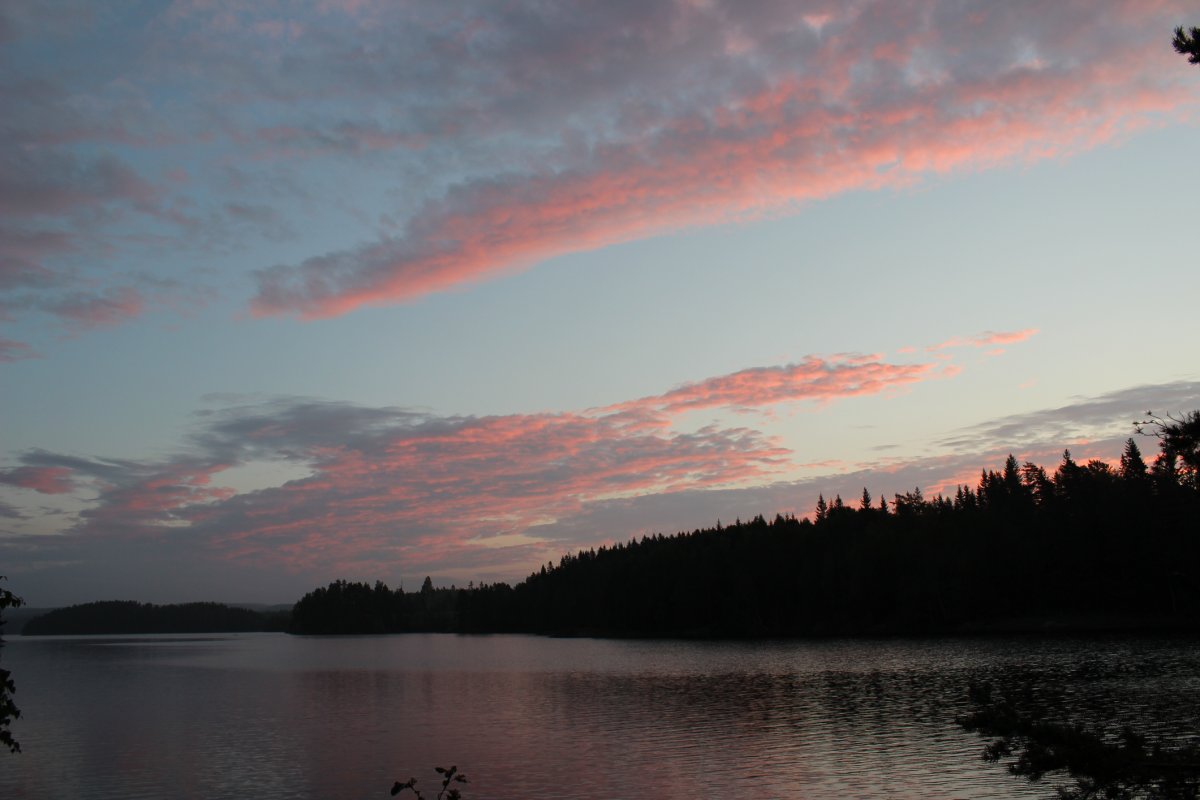 Am zweiten Tag, ging es für uns früh los. Am Strand entdeckten wir einige angespülte, tote Mäuse. Komisch! Alles wieder eingepackt, paddelten wir los. Diesmal ging es auch gradliniger voran. Nach ca. 5 Stunden Fahrt, inklusive Mittagspause und einem Abstecher nach Norwegen (Die Grenze verläuft durch den See), gelangen wir zu Dano7. Gegenwind hatte uns etwas Zeit gekostet. Ein schöner Rastplatz am Wasser. Schnell Holz gehackt und Essen zubereitet, dann konnten wir auch schon den Sonnenuntergang genießen und ein paar schöne Fotos knipsen. Von denen würden wir in diesem Urlaub noch viele bekommen! Vor allem Frühaufsteher werden mit Nebel und/oder klarem Wasser und tollem Licht belohnt. In der Nacht besuchte uns eine Maus in der Hütte, die uns auf Trab hielt. Am Tag klein und süß, doch in der Nacht ein echter Plagegeist. Sie hatte sich selbst in unserer Mülltüte eingesperrt und verursachte einen entsprechenden Lärm! Die nächsten Hütten haben wir dann Maussicher gemacht, indem wir die Löcher, in den Ecken, mit Steinen und Tannenzapfen verschlossen haben. Am nächsten Tag mussten wir gezwungenermaßen nochmal einen Abstecher zur Dano17 machen. Grillrost vergessen... Danach sind wir ausversehen an Dano18 vorbeigerudert und haben letztendlich bei Dano19 Rast gemacht. Ca. 25 Km! ZzZzZz..... am nächsten Tag auf zur Dano20. Sehr schön und direkt am Wasser! Beim Insel erkunden bin ich erstmal in einen Sumpf gelatscht. Es sah nach festem Boden aus! Nach schönem, festem, moosigem und belastbaren Boden! Ich schwöre! ;-)