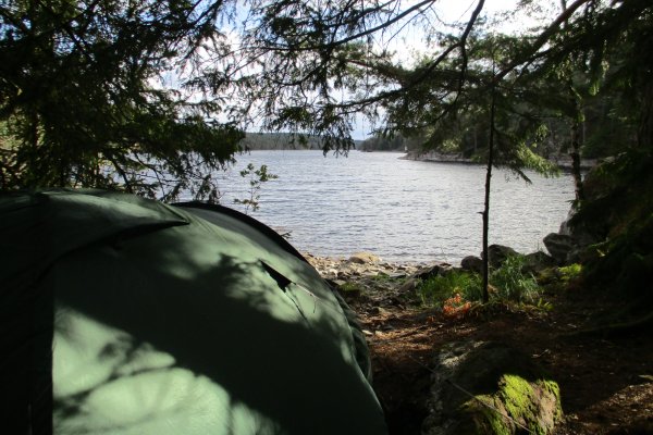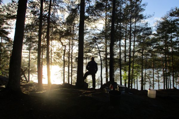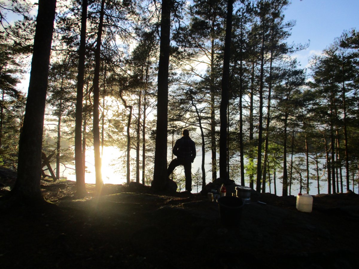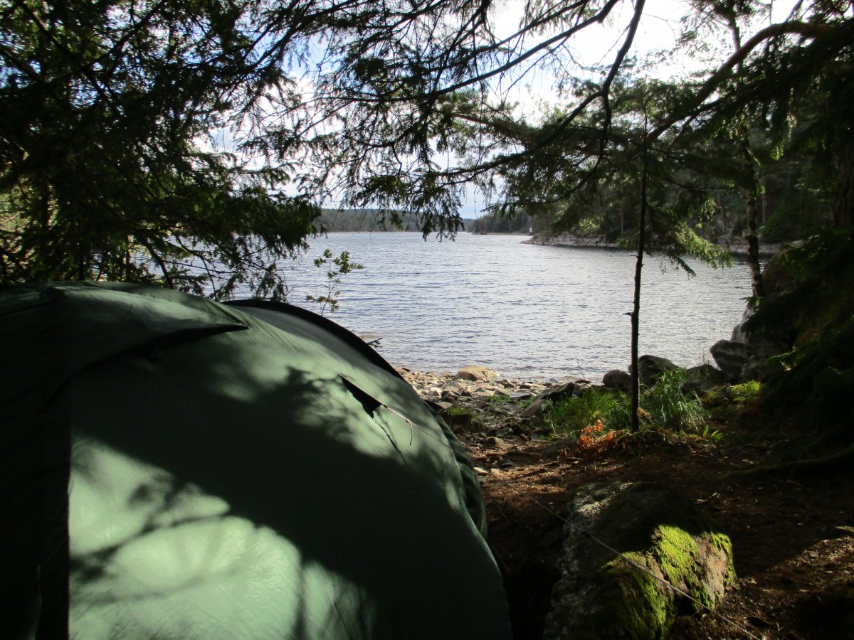 In dieser Nacht erreichen wir keine Schutzhütte mehr, sondern campieren wild in einem Waldstück, durch das wir das Kanu vorher getragen haben. Verflucht schwer, die Teile! Doch es lohnt sich. Nach dieser Abenteueretappe genießen wir den Abend in unserer Privatbucht und fallen schließlich erschöpft auf unsere Isomatten. Dieser Tag hat uns gelehrt, dass ein Blick auf die Wetter-App doch von Vorteil sein kann: Gegen den Regen kann man sich schützen, der Wind und die Nervennahrung sind das Entscheidende!