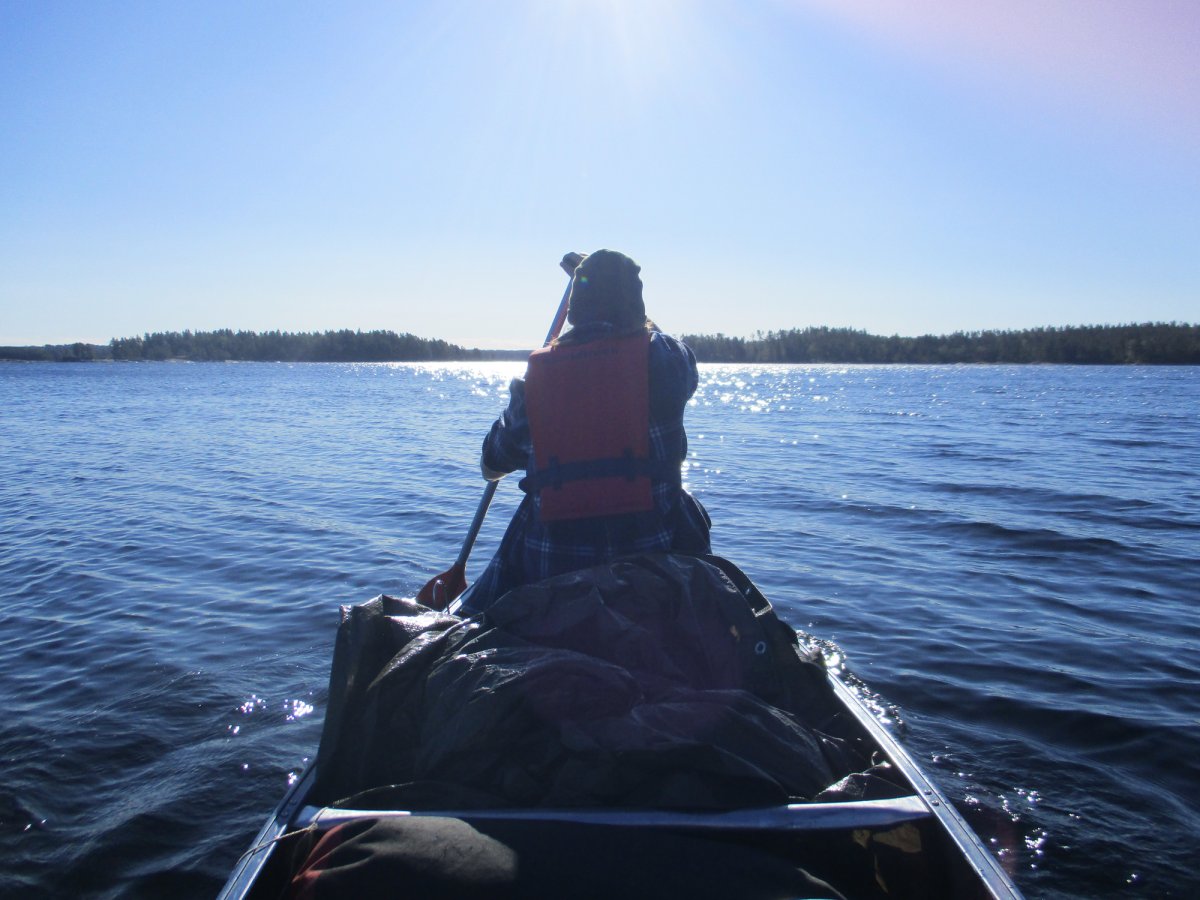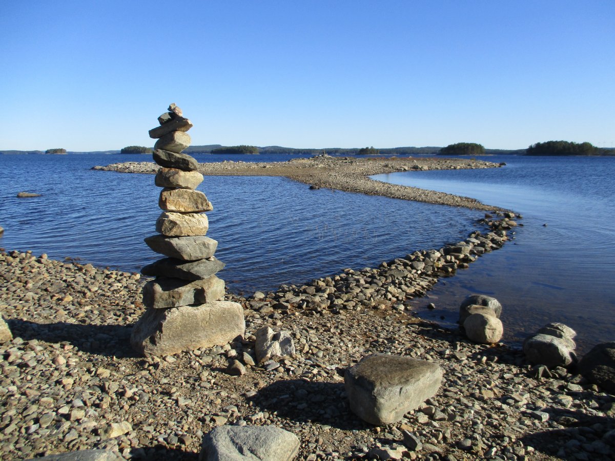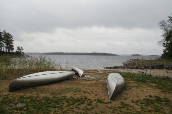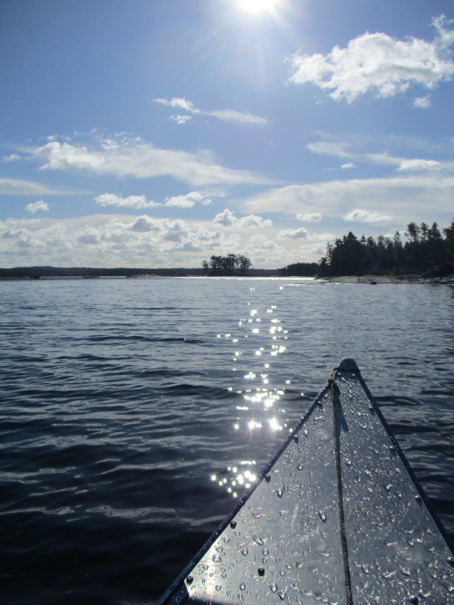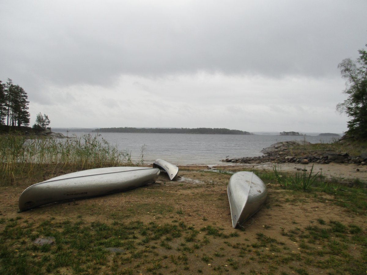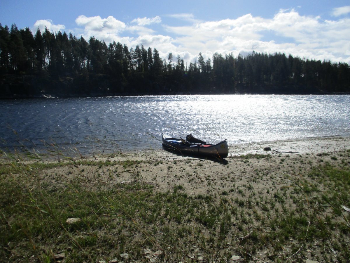 Am nächsten Morgen sieht alles paddelfreundlich aus. Wir wagen das Kreuzen des Sees. Etwa in der Mitte beginnt der Wind aufzufrischen! Wir schaffen es bis zum anderen Ufer, doch hier hatten wir unsere erste und einzige brenzlige Situation: Der Wind und der Wellengang drücken uns richtig gegen die Felsen des Ufers, sodass wir auf dem glitschigen Grund notaussteigen und das Kanu irgendwie zur nächsten Sandbank ziehen müssen. Danach ist unser Selbstvertrauen erstmal erschüttert – und unser Gepäck ziemlich nass. Erste Hilfe: Lutschbonbon!