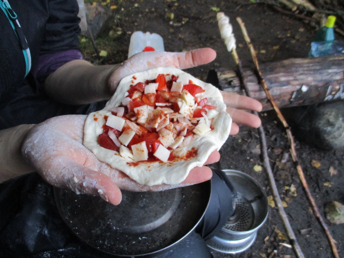 Der erste Kochversuch (Linseneintopf mit Kartoffeln) war ein Erfolg. Dazu müssen wir euch allerdings auch erklären, dass draußen und nach einem anstrengenden Paddeltag jedes Essen wie ein Festmahl schmeckt. Unsere kulinarischen Highlights waren eine Stockbrotpizzakreation und der Versuch eines Kuchens. Das Verpflegungspaket ist gut zusammengestellt, zumindest können wir dies über die vegetarische Variante sagen. Mit dem Outdoorkochbuch ist man auf der sicheren Seite, aber es bietet auch viel Raum für Kreativköche.