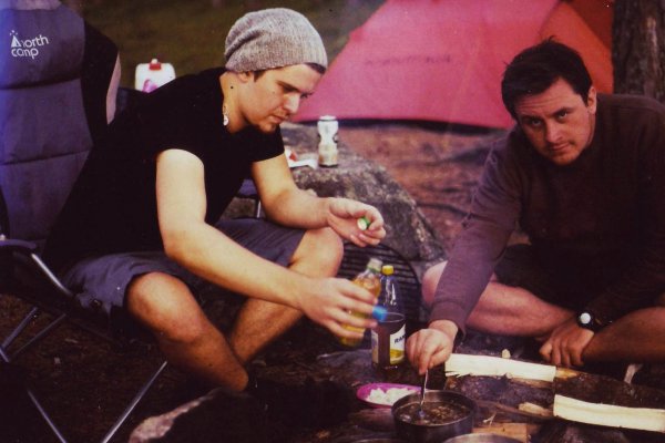 Dominic und ich schlagen uns über den kleinen Weg zu unserem Zelt, ich habe natürlich meine Kopflampe in meinem Packsack vergessen und muss deswegen an Dominics Hemdzipfel blind durch den Wald tapsen.