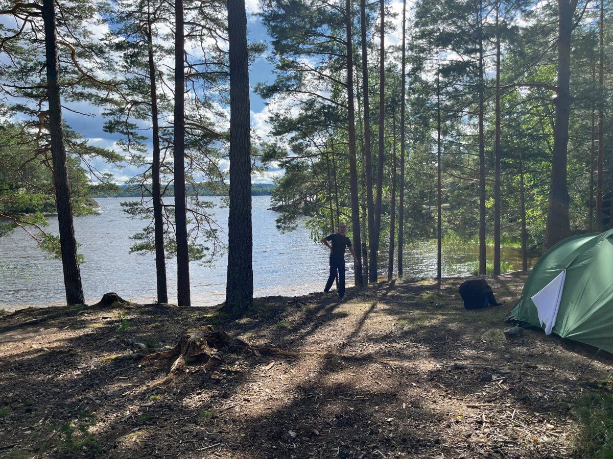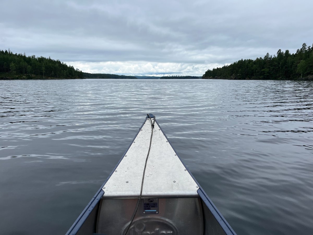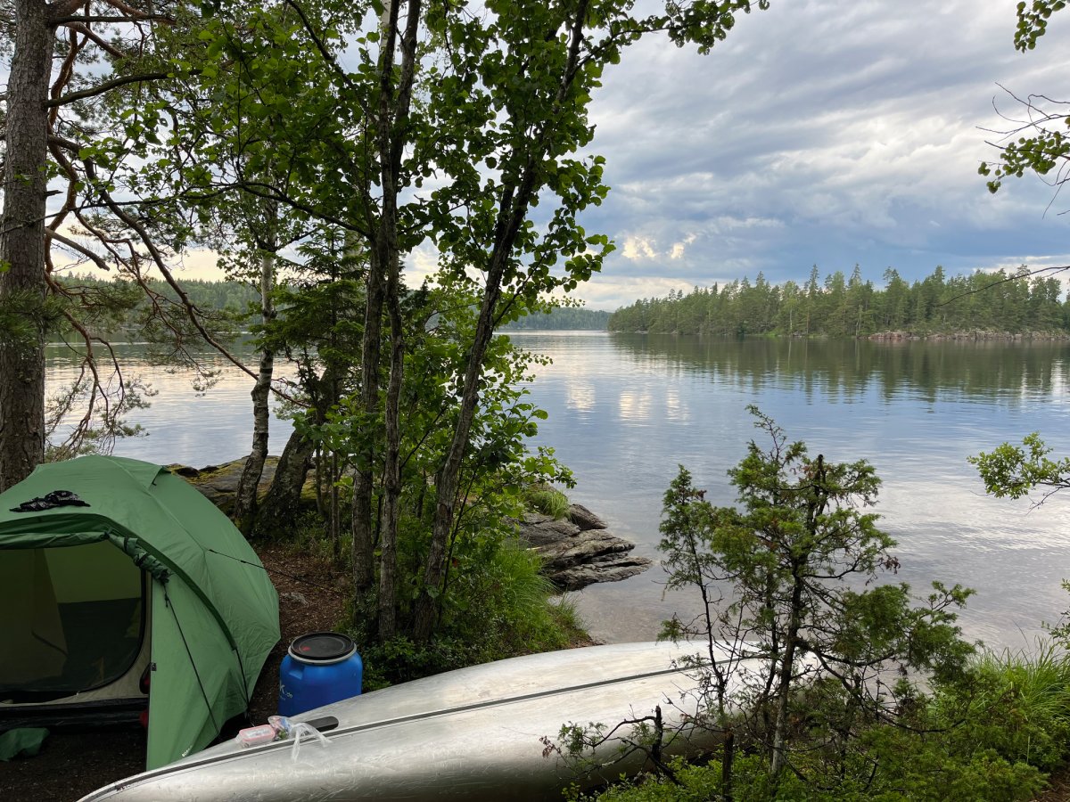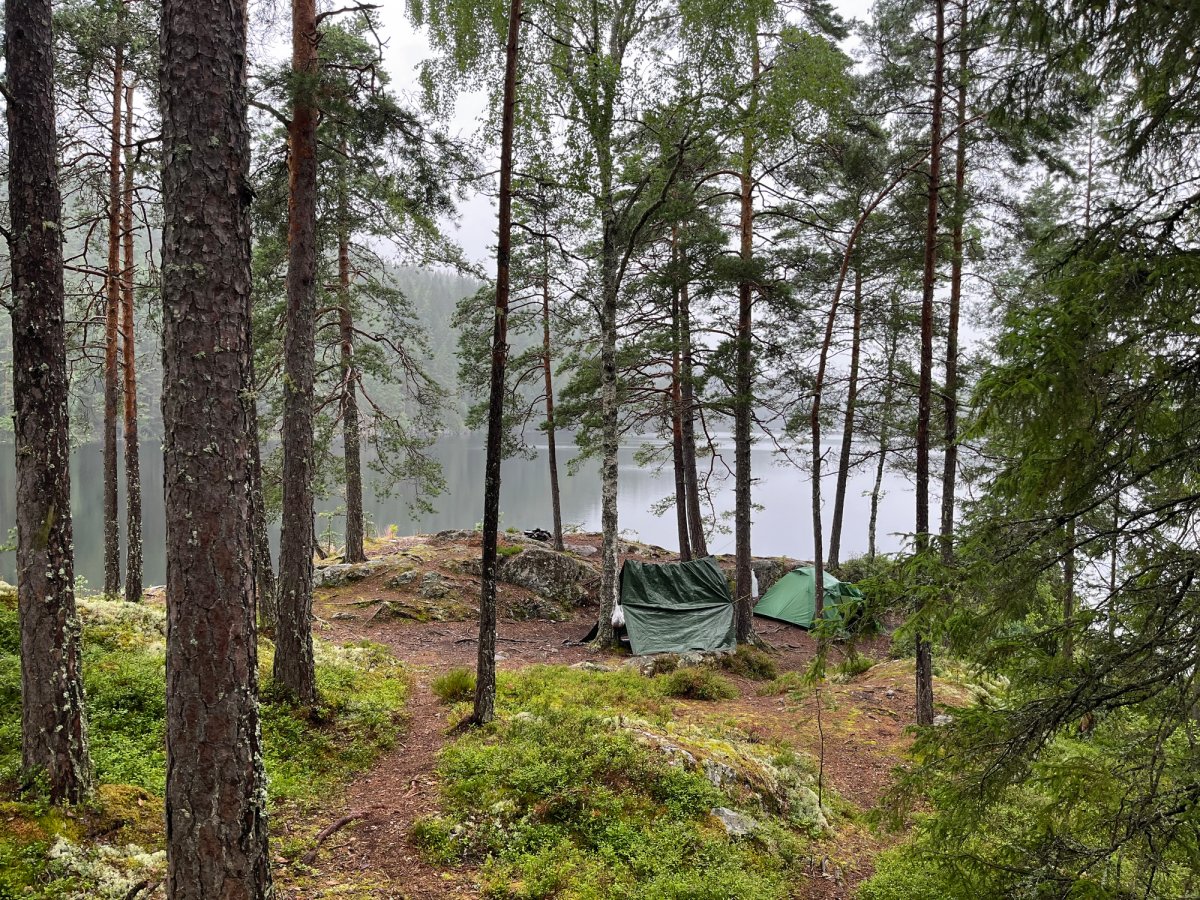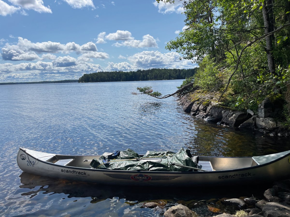 Wir glaubten bald nicht mehr daran, einen schönen Platz zu finden. Bei einer kurzfristigen Pause wurden wir dann aber doch fündig - also packten wir schnell das Kanu aus und sicherten es, bevor wir unser Lager aufbauten.Als das Zelt endlich stand, kam die Sonne zum Vorschein, nur um einige Minuten später wieder unter einer dicken Wolkendecke zu verschwinden. Den darauffolgenden Regen konnten wir zum Glück im Zelt abwarten und anschließend, nachdem die Sonne wieder schien, kochen. Jetzt sitzen wir auf unserer Privat-Stein-Terasse mit Seeblick und genießen bei ein paar Spielen wieder die Abendsonne. Gleich gibt es noch Schogetten :)