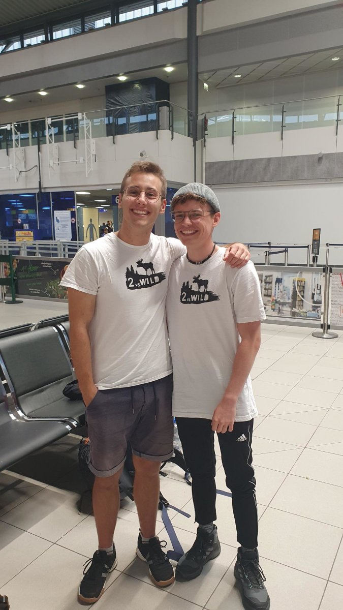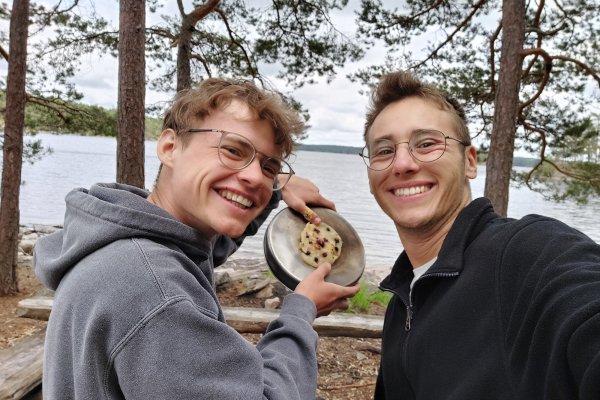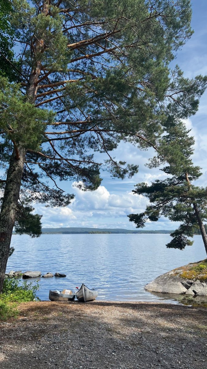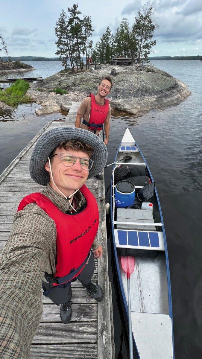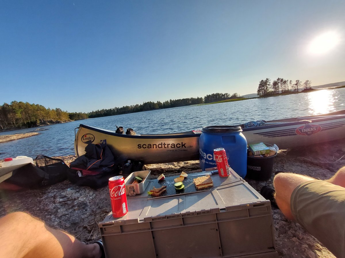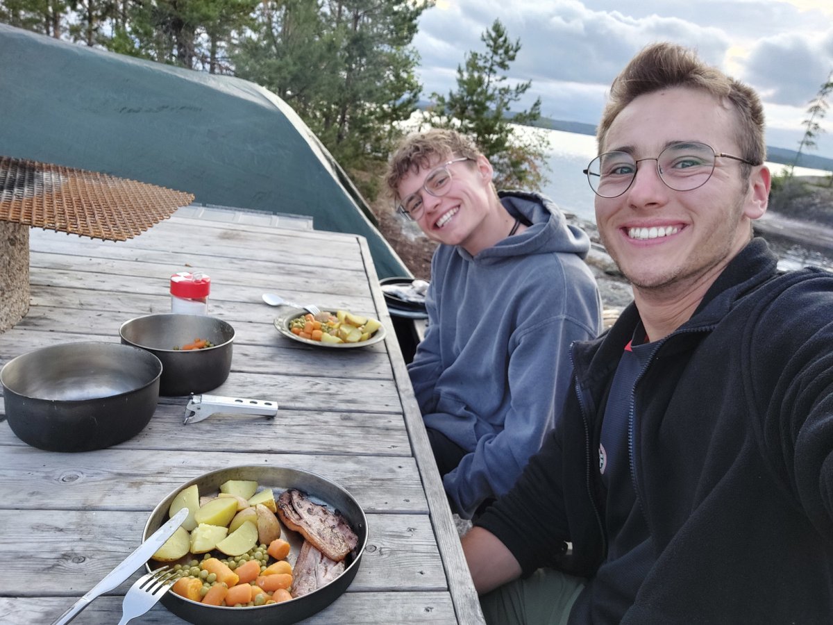 2,5 Stunden vor eigentlicher Abfahrt trafen wir am Flughafen Halle/Leipzig ein, um das Abenteuer Schweden zu beginnen. Der Blick an den Himmel bereitete uns etwas Sorge, es wurde immer dunkler. Nicht viel Später ging es auch schon los. Regen und Böen direkt am Anreisetag- ,,na das kann ja was werden“, dachten wir uns. Dennoch warteten wir voller Vorfreude, bis der Bus kommen sollte. Wir sahen auch schon ein paar andere Leute, deren Reisegepäck stark vermuten ließ, dass sie mit uns im Scandtrack-Bus sitzen werden. Mit einigen kamen wir sogar vor Ort noch ins Gespräch, denn auch an uns war unschwer zu erkennen, was wir machen wollten. Die selbst gefertigten ,,2 vs. Wild“-T-Shirts inklusive Elch im Bild, die wir trugen, verrieten uns. Dann ging die 18-stündige Fahrt auch schon los, vor der wir etwas Angst hatten. Aber es stellte sich als viel unproblematischer heraus, als erwartet. Die 18 h vergingen wir im Flug, auch wenn der Nachtschlaf etwas unruhiger war als sonst. Auch die Toilettenpausen waren super verteilt und vollkommen ausreichend in der Anzahl. Das Fahren mit den beiden Fähren war auf jeden Fall schon ein Highlight. Auf ,,hoher See“ kam direkt Urlaubsfeeling auf. Gegen 10 Uhr landeten wir am Samstag dann im Basiscamp in Lennartsfors, wo man uns herzlich mit Getränken und Keksen empfing. Wenig später gab es die Ausrüstungs- und Proviantpakete und das Kanu-Material, sodass unsere Kanutour nach dem Umpacken des Gepäcks und einer kleinen Einweisung vom Team starten konnte. Gemütlich machten wir uns auf den Weg und waren direkt beheistert von der wunderschönen Natur hier in Schweden. Überall sahen wir schöne Plätze, wovon wir uns dann auch bald einen sicherten, um unser (schon mitgebrachtes) Mittagsmahl zu verzehren. Aber für den ersten Schlafplatz wollten wir dann doch noch ein bisschen weiter paddeln. Dann kam die perfekte Stelle mit Blick in den Sonnenuntergang, wenn man es denn so bezeichnen kann. Da an diesem Tag ,,Midsommar“ war, wurde es nachts quasi nicht dunkel, obwohl die Sonne für eine kurze Phase hinterm Horizont verschwand. Nach ein bisschen Lageraufbau und Abendbrot genossen wir den ersten Abend noch mit wundervoller Aussicht über den Foxen, bevor die erste Nacht im Zelt begann. Trotz einiger Kiefernnadeln, die unser Zelt befielen und einigen Seevögeln, die auch spät abends noch ertönten, schliefen wir tief und fest.