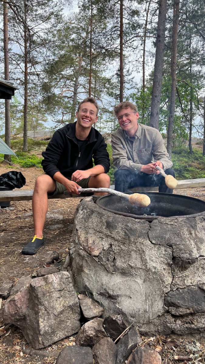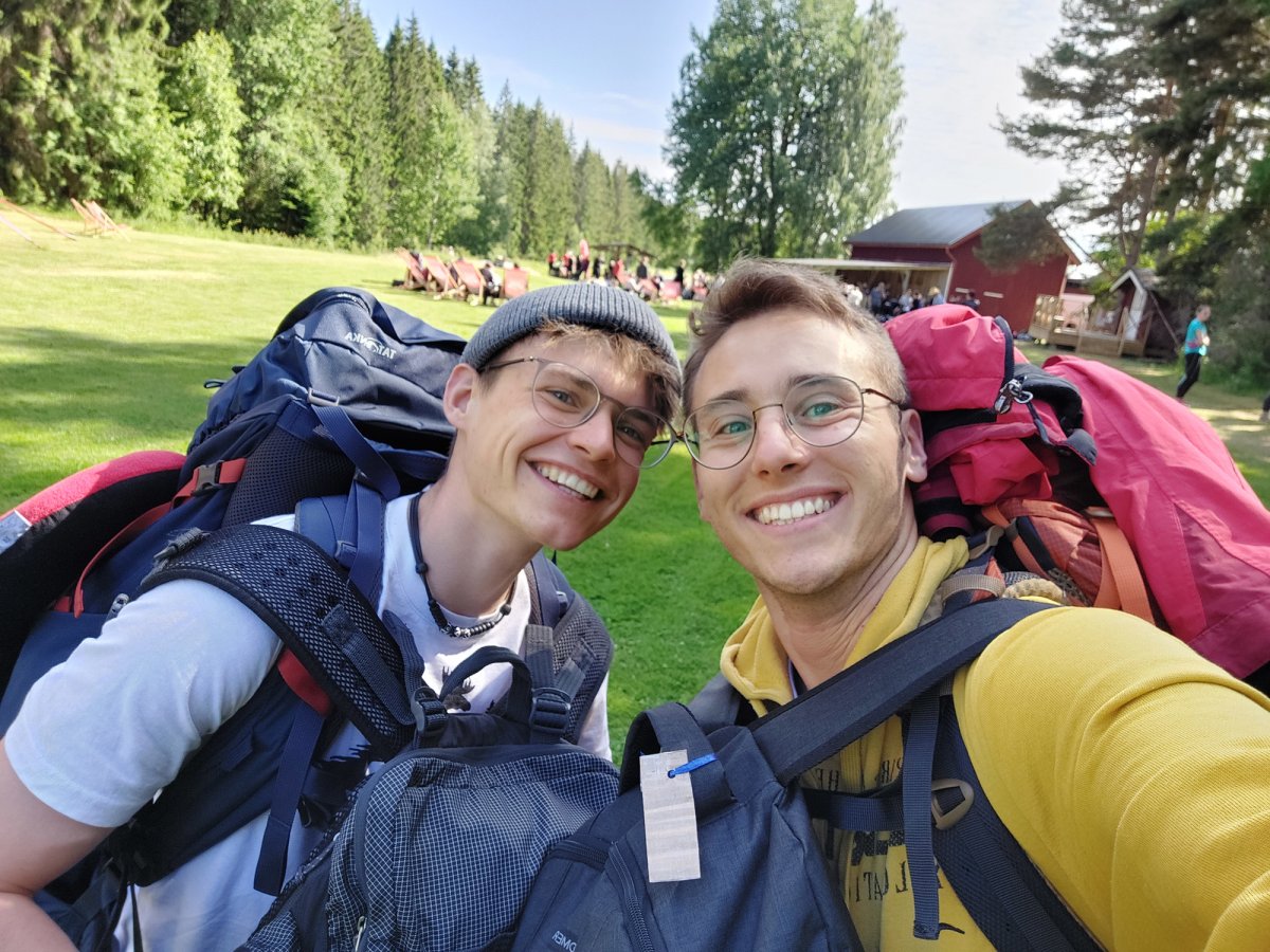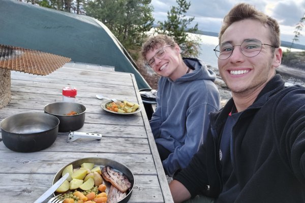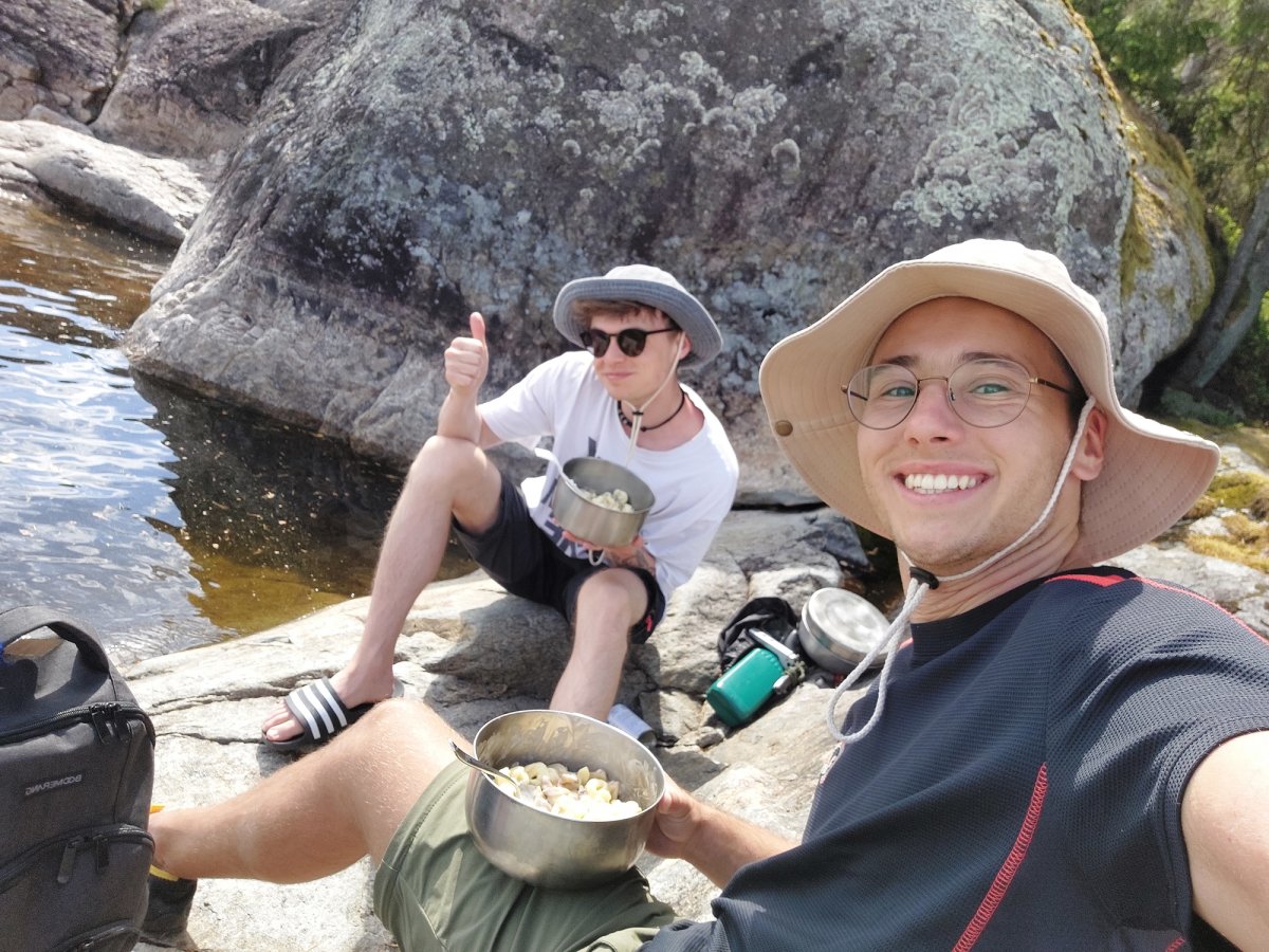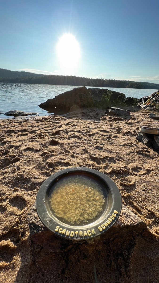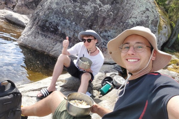 2,5 Stunden vor eigentlicher Abfahrt trafen wir am Flughafen Halle/Leipzig ein, um das Abenteuer Schweden zu beginnen. Der Blick an den Himmel bereitete uns etwas Sorge, es wurde immer dunkler. Nicht viel Später ging es auch schon los. Regen und Böen direkt am Anreisetag- ,,na das kann ja was werden“, dachten wir uns. Dennoch warteten wir voller Vorfreude, bis der Bus kommen sollte. Wir sahen auch schon ein paar andere Leute, deren Reisegepäck stark vermuten ließ, dass sie mit uns im Scandtrack-Bus sitzen werden. Mit einigen kamen wir sogar vor Ort noch ins Gespräch, denn auch an uns war unschwer zu erkennen, was wir machen wollten. Die selbst gefertigten ,,2 vs. Wild“-T-Shirts inklusive Elch im Bild, die wir trugen, verrieten uns. Dann ging die 18-stündige Fahrt auch schon los, vor der wir etwas Angst hatten. Aber es stellte sich als viel unproblematischer heraus, als erwartet. Die 18 h vergingen wir im Flug, auch wenn der Nachtschlaf etwas unruhiger war als sonst. Auch die Toilettenpausen waren super verteilt und vollkommen ausreichend in der Anzahl. Das Fahren mit den beiden Fähren war auf jeden Fall schon ein Highlight. Auf ,,hoher See“ kam direkt Urlaubsfeeling auf. Gegen 10 Uhr landeten wir am Samstag dann im Basiscamp in Lennartsfors, wo man uns herzlich mit Getränken und Keksen empfing. Wenig später gab es die Ausrüstungs- und Proviantpakete und das Kanu-Material, sodass unsere Kanutour nach dem Umpacken des Gepäcks und einer kleinen Einweisung vom Team starten konnte. Gemütlich machten wir uns auf den Weg und waren direkt beheistert von der wunderschönen Natur hier in Schweden. Überall sahen wir schöne Plätze, wovon wir uns dann auch bald einen sicherten, um unser (schon mitgebrachtes) Mittagsmahl zu verzehren. Aber für den ersten Schlafplatz wollten wir dann doch noch ein bisschen weiter paddeln. Dann kam die perfekte Stelle mit Blick in den Sonnenuntergang, wenn man es denn so bezeichnen kann. Da an diesem Tag ,,Midsommar“ war, wurde es nachts quasi nicht dunkel, obwohl die Sonne für eine kurze Phase hinterm Horizont verschwand. Nach ein bisschen Lageraufbau und Abendbrot genossen wir den ersten Abend noch mit wundervoller Aussicht über den Foxen, bevor die erste Nacht im Zelt begann. Trotz einiger Kiefernnadeln, die unser Zelt befielen und einigen Seevögeln, die auch spät abends noch ertönten, schliefen wir tief und fest.