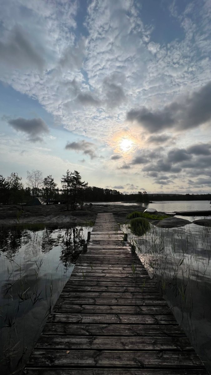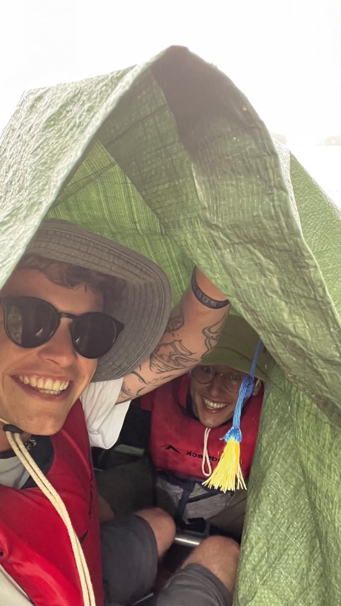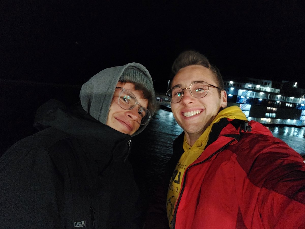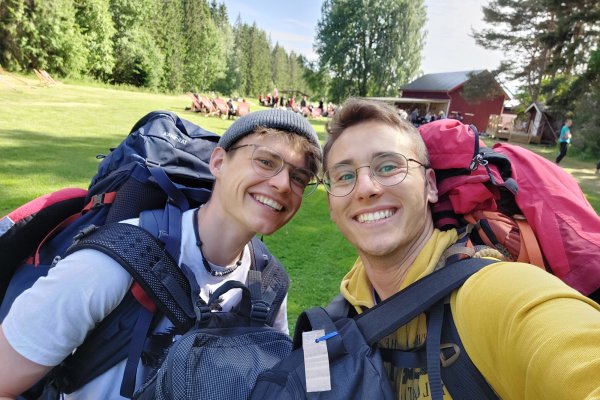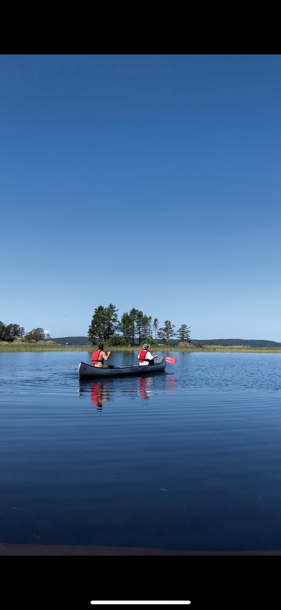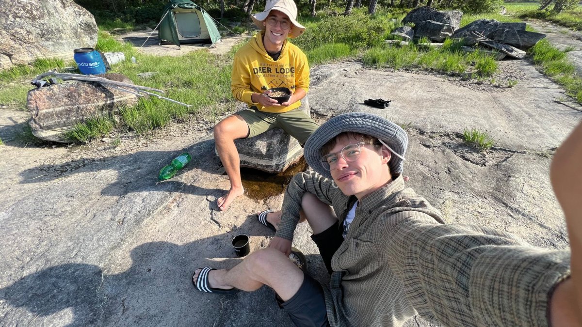 2,5 Stunden vor eigentlicher Abfahrt trafen wir am Flughafen Halle/Leipzig ein, um das Abenteuer Schweden zu beginnen. Der Blick an den Himmel bereitete uns etwas Sorge, es wurde immer dunkler. Nicht viel Später ging es auch schon los. Regen und Böen direkt am Anreisetag- ,,na das kann ja was werden“, dachten wir uns. Dennoch warteten wir voller Vorfreude, bis der Bus kommen sollte. Wir sahen auch schon ein paar andere Leute, deren Reisegepäck stark vermuten ließ, dass sie mit uns im Scandtrack-Bus sitzen werden. Mit einigen kamen wir sogar vor Ort noch ins Gespräch, denn auch an uns war unschwer zu erkennen, was wir machen wollten. Die selbst gefertigten ,,2 vs. Wild“-T-Shirts inklusive Elch im Bild, die wir trugen, verrieten uns. Dann ging die 18-stündige Fahrt auch schon los, vor der wir etwas Angst hatten. Aber es stellte sich als viel unproblematischer heraus, als erwartet. Die 18 h vergingen wir im Flug, auch wenn der Nachtschlaf etwas unruhiger war als sonst. Auch die Toilettenpausen waren super verteilt und vollkommen ausreichend in der Anzahl. Das Fahren mit den beiden Fähren war auf jeden Fall schon ein Highlight. Auf ,,hoher See“ kam direkt Urlaubsfeeling auf. Gegen 10 Uhr landeten wir am Samstag dann im Basiscamp in Lennartsfors, wo man uns herzlich mit Getränken und Keksen empfing. Wenig später gab es die Ausrüstungs- und Proviantpakete und das Kanu-Material, sodass unsere Kanutour nach dem Umpacken des Gepäcks und einer kleinen Einweisung vom Team starten konnte. Gemütlich machten wir uns auf den Weg und waren direkt beheistert von der wunderschönen Natur hier in Schweden. Überall sahen wir schöne Plätze, wovon wir uns dann auch bald einen sicherten, um unser (schon mitgebrachtes) Mittagsmahl zu verzehren. Aber für den ersten Schlafplatz wollten wir dann doch noch ein bisschen weiter paddeln. Dann kam die perfekte Stelle mit Blick in den Sonnenuntergang, wenn man es denn so bezeichnen kann. Da an diesem Tag ,,Midsommar“ war, wurde es nachts quasi nicht dunkel, obwohl die Sonne für eine kurze Phase hinterm Horizont verschwand. Nach ein bisschen Lageraufbau und Abendbrot genossen wir den ersten Abend noch mit wundervoller Aussicht über den Foxen, bevor die erste Nacht im Zelt begann. Trotz einiger Kiefernnadeln, die unser Zelt befielen und einigen Seevögeln, die auch spät abends noch ertönten, schliefen wir tief und fest.