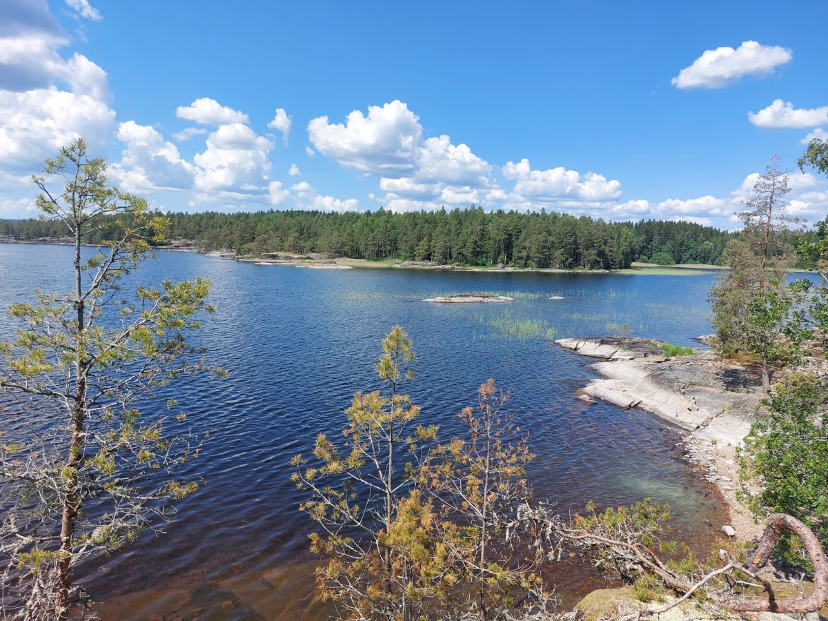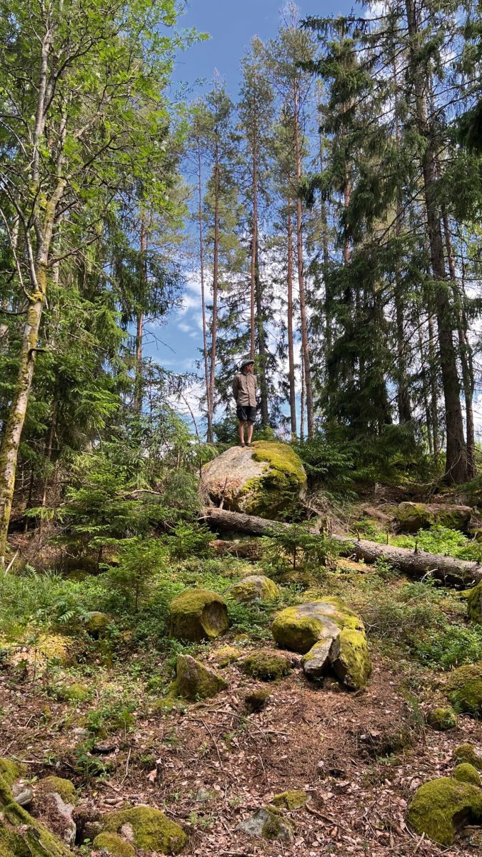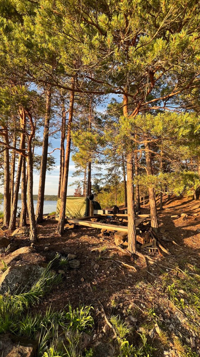 Zum Frühstück gab es eine Schale Müsli mit Milch und danach ging es zum frisch machen und zusammenpacken. Für unser zweites Nachtlager ging es mit dem Kanu weiter Richtung Norden, während wir unterwegs an jeder Ecke die Natur bestaunten. Unterwegs legten wir einen Stopp an einem sehr felsigen „Strand“ ein, um diesen ein bisschen zu erkunden. Hoch hinaus ging es auf eine Felsenkante; vorbei an großen Steinen, super weichem Moos und kleinen Heidelbeersträuchern. Klettern und Springen durfte dabei natürlich nicht fehlen. Außerdem fanden wir ein paar, schon blau gewordene Heidelbeeren, welche jedoch bei weitem noch nicht reif waren. Zurück im Kanu ging es für uns nur auf die andere Uferseite zu einem Platz, welchen wir von weitem erspäht hatten und beschlossen, dort unser Zelt aufzuschlagen. Der Platz lag hinter einer kleinen Bucht und es fühlte sich direkt wie eine Privatinsel an.