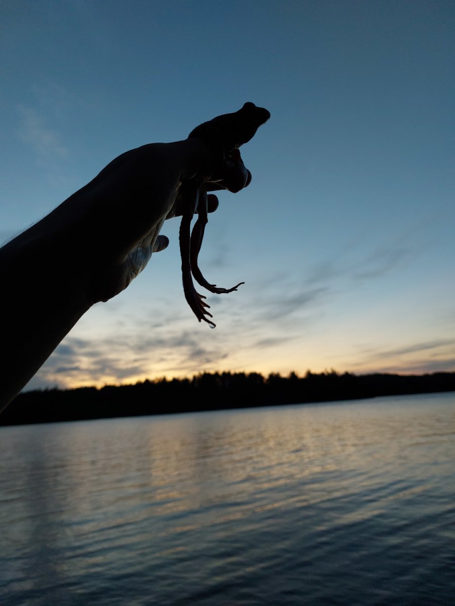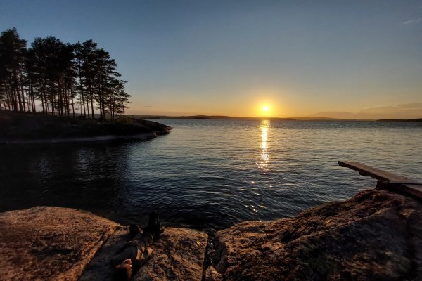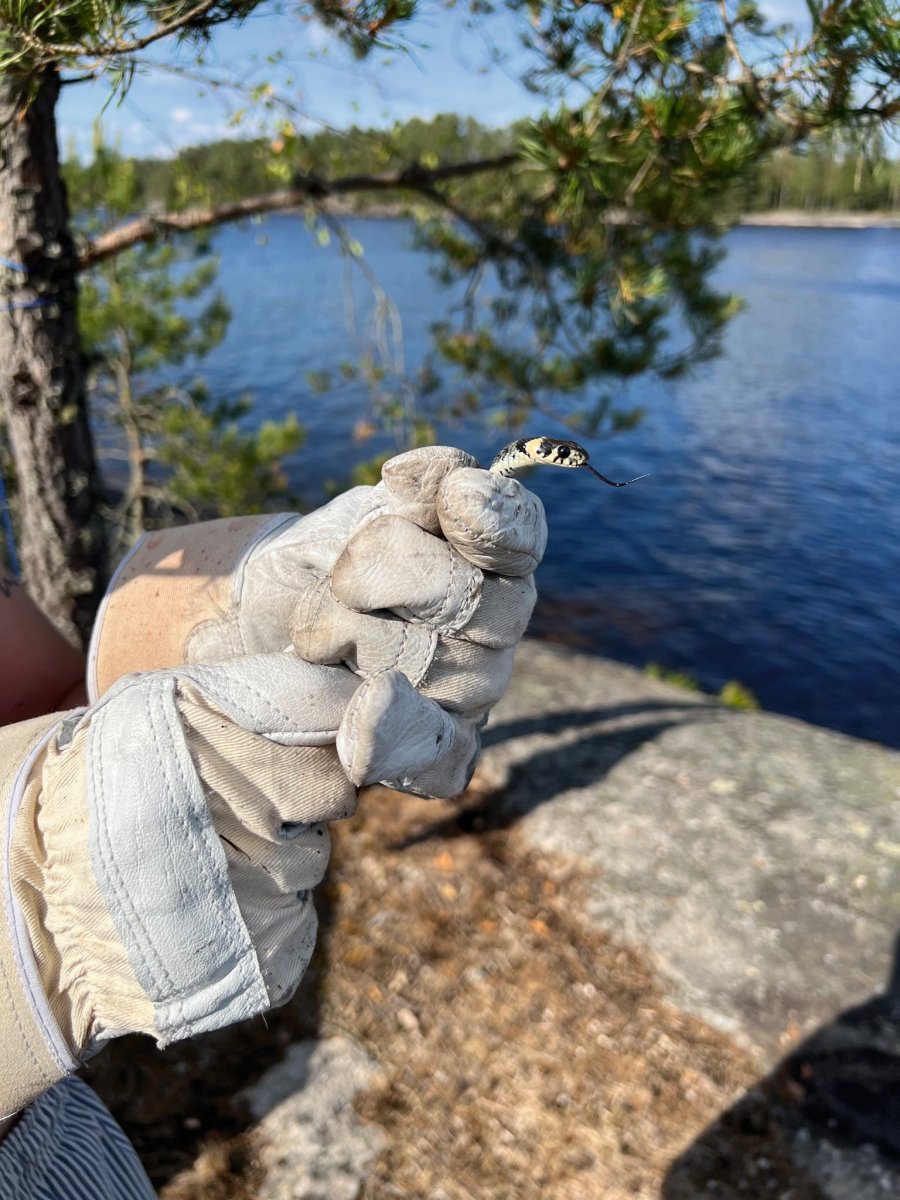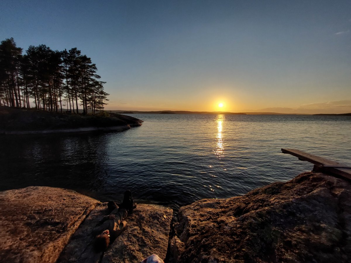 Unser letzter voller Tag in Schwedens Wildnis begann mit den am Vorabend gebackenen Pancakes. Im Schlafsack liegend schmeckten sie fast noch besser als am Tag zuvor. Der Morgen war noch grau und windig, weshalb wir sehr froh waren, nicht raus zu müssen. Nach dem Aufstehen machten wir uns an den Abwasch vom Tag davor. Da wir über dem Feuer gekocht hatten, waren die Töpfe ordentlich eingerußt. Das Reinigen erwies sich zeitaufwendiger als gedacht und so scheuerten wir eine gute Stunde die Töpfe mit Sand und Spülmittel. Gegen Mittag kamen zwei schwedische Pärchen mit ihren Motorbooten auf „unsere“ Insel. Nach dem sie angelegt hatten, plauderten wir ausgelassen mit ihnen, woraufhin sie uns sogar etwas von ihrem Mittag anboten. Gut gesättigt machten wir uns danach an ein paar unserer Vorhaben – unsere Schnitzstücke fertigstellen, Postkarten schreiben und nochmal Wäschewaschen. Nach einem kleinen Mittagsschlaf in der Sonne entdeckten wir eine Ringelnatter, welche sich in Richtung unseres Zeltes schlängelte. Direkt ging mein Biologen-Herz auf und ich holte die Arbeitshandschuhe raus. Da sie sich unter unser Zelt verkrochen hatte und wir uns nicht auf sie legen wollten, mussten wir sie suchen und wegbringen. Nach ein paar Runden uns Zelt, welches wir währenddessen hochhoben, fanden wir diese. Für ihre Freilassung brachte ich sie auf die andere Seite der, über einen Steg zu erreichenden, angrenzenden Insel. So waren wir uns einerseits relativ sicher, dass sie nicht zurück kommt, und sie hatte dort ihre Ruhe. Der Rest des Tages verlief eher entspannt. Wir gingen noch einmal baden, packten großteils unsere Sachen zusammen und bereiteten uns Proviant für den Abreisetag vor. Ein letztes Mal setzten wir uns runter an den See und sahen der Sonne beim untergehen zu. Die Abendsonne stimmte uns traurig und melancholisch – wir ließen die letzten sieben aufregenden Tage noch einmal Revue passieren, bevor für uns die letzte Nacht im Zelt anbrach.