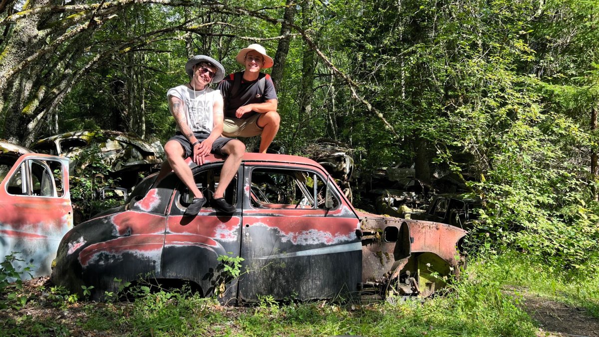 Nachdem wir nach einer sehr regenreichen Nacht aus dem Zelt gekrochen waren, stellten wir mit großer Freude fest, dass uns unsere Tarp-Rekonstruktion erfolgreich trocken gehalten hat. Als wir dann endlich fertig mit dem Packen waren, ging es Richtung Båstnäs zu einem Autofriedhof. Dort angekommen stellten wir schnell fest, dass wir dort nicht die einzigen waren. Nach einem ca. 800 Meter-Marsch durch den Wald kamen wir an unserem Ziel an. Hunderte von Autos, Vans und Bussen standen im Wald verteilt. Teilweise übereinander gestapelt, teils sehr verrostet, aber dennoch ein atemberaubender Anblick! So etwas haben wir noch nie zuvor gesehen! Nachdem wir dort ca. 2 Stunden mit dem Umsehen beschäftigt waren, ging es zurück zum Kanu. Der Blick nach Norden verhieß nichts gutes und ließ eine unangekündigte Regenfront in unsere Richtung ziehen. Also – ab ins Kanu und so schnell weg wie möglich. Unser Ziel war es, Richtung Norwegen zu paddeln und dort einen Schlafplatz zu finden, bevor es zu regnen begann. Doch daraus wurde nichts – der Regen kam schneller als gehofft. So legten wir an einer kleineren Insel einen Zwischenstopp ein und warfen das Tarp über uns und das Kanu, sodass wir vorerst weitestgehend trocken blieben. Nach ca. 30 Minuten war der Schauer auch schon vorbei und wir fuhren mit der Fahrt Richtung Süden fort. Kurz darauf fanden wir einen richtigen Sandstrand, welchen wir direkt als Nachtlager auserkoren und schlugen das Zelt auf. Außerdem fingen wir direkt an zu kochen, da das Mittag ausgefallen war und wir sehr hungrig waren.