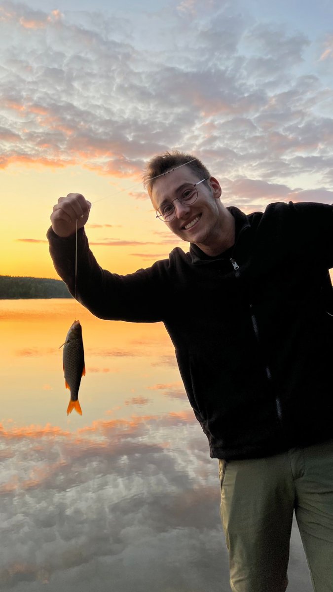Gegen Abend gingen wir nochmal baden und stellten unsere Angel fertig. Ziel für heute: einen Fisch fangen! Tatsächlich traf dies nach nur wenigen Versuchen ein und wir zogen eine 15 cm lange Rotfeder aus dem Foxen. Wir waren total aus dem Häuschen und darüber erfreut, dass unsere selbstgebaute Angel tatsächlich funktioniert! Nach dem Freilassen des Fischs räumten wir ein und machten uns auf ins Zelt um schlafen zu gehen. Schon dort merkten wir, dass es eine kältere Nacht werden sollte, als es die anderen waren.