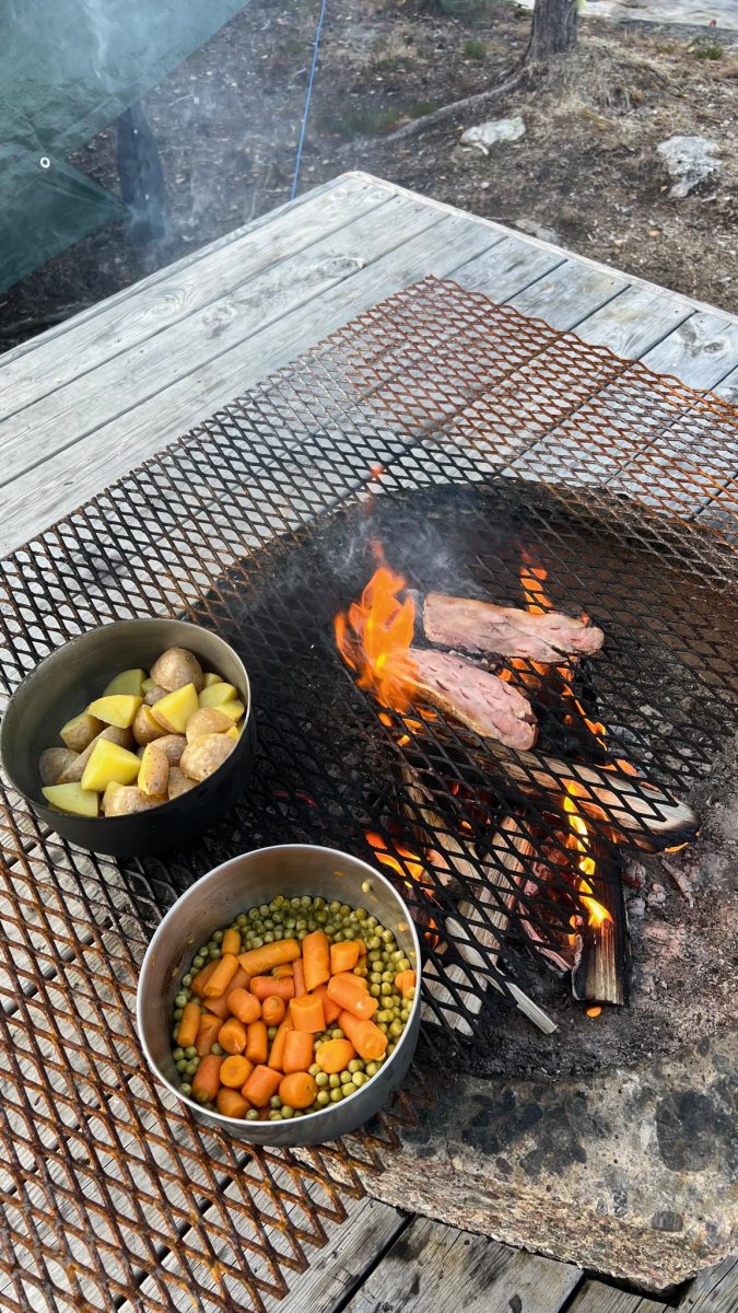 Außerdem entschieden wir uns, unser Abendbrot heute über dem Feuer kochen zu wollen. Demnach hieß es erst einmal Holz suchen, sägen und spalten. Somit kamen Säge und Beil, welche sich für uns eher als lästig und im Weg rumstehend erwiesen, zum ersten Mal in Gebrauch. Nachdem wir mehrere kleine Scheite hatten, begannen wir unser erstes eigenes Feuer zu entzünden. Kurz darauf flackerten die kleinen Flammen lichterloh und wir begannen mit dem Kochen. Dies ging viel schneller als über dem Trangia-Kocher, aber trotzdem aßen wir erst gegen 21 Uhr, da das Vorbereiten des Holzes die Zeit schneller verfliegen ließ, als wir dachten. Gut gesättigt und glücklich über unser Feuer, backten wir den restlichen Pancake-Teig aus der Früh aus, damit wir sie für morgen schon vorbereitet hatten. Auch dies stellte sich als wesentlich einfacher raus als auf dem Kocher. Den restlichen Abend verbrachten wir mit quatschen und schnitzen, bevor es dann wieder Zeit für den Schlafsack war. Kurz nachdem wir uns ins Zelt verkrochen hatten, setzte pünktlich wie angekündigt der leichte Regen und wind ein. Durch das Rascheln und Plätschern hörte es sich so an, als würde jemand um unser Zelt herumschleichen. Kurzerhand packten wir unseren Mut und die Stirnlampe, kletterten aus dem warmen Zelt und sahen uns auf der Insel um… doch: nichts! Es war nur Wind und Regen. Beruhigt zogen wir uns wieder zurück und schliefen kurzerhand ein.