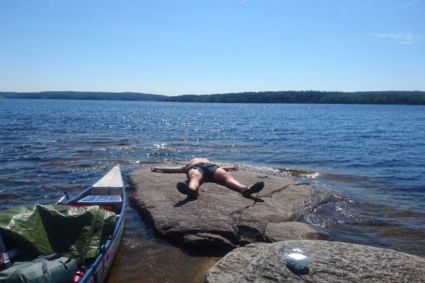 Es war unfassbar warm, also wollten wir eigentlich nur baden und nicht weit paddeln. Leider waren alle Rastplätze besetzt. Wir sind aber trotzdem immer mal wieder einfach in den See gesprungen. Das war super in der Woche. Außer an dem Montag konnte man immer in die glasklaren Seen springen. Manchmal haben wir nur zum pullern gehalten und schwupp sind wir wieder reingesprungen. Wir sind auch unfassbar schnell trocken geworden wieder. Wir haben keine Gelegenheit ausgelassen in den See zu springen. Wir habeen uns dann auf Dano 65 niedergelassen. Der ist ziemlich versteckt. Im Schatten und man findet ihn schwierig. Das war aber super. Weil wir eine Sonnenpause brauchten. Und dort war alles super sauber, sogar die Toliette! Ich glaube da steigen selten Menschen ab. Aber für uns war es an diesem Tag perfekt.