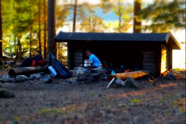 Aber die Laune haben wir uns nicht vermiesen lassen. Es war trotzdem irgendwie gemütlich. Eigentlich wollten wir ein ganzes Stück weiter kommen. Aber es hat so dolle geregnet, dass wir einfach nur gehofft haben in ein Dano mit Dach zu kommen. Der Kanugott hat es gut mit uns gemeint und gleich der erte nach dem Umtragen war ein Dano mit Hütte. Wir haben uns eingemummelt. Lange Unterehose, Pulli trocken angezogen uns eine Linsensuppe gemacht und dem prasselnden Regen auf der Hütte zugehört. Es war auch traumhaft. Und Gott sei dank hatten wir auch so einen Tag, sonst hätten wir die dicken Sachen ja ganz umsonst mitgenommen… Wir hatten ein bisschen gehofft, dass der Regen ausgereicht hat, um wieder Feuer machen zu können. Um das rauszukriegen haben wir einfach mit Scantrack gechattet. Es gab einfach keine Fahne in der Nähe. Und witzigerweise hat man in Schweden mitten im Nichts besseres Internet als in der Metropolregion Nürnberg.
