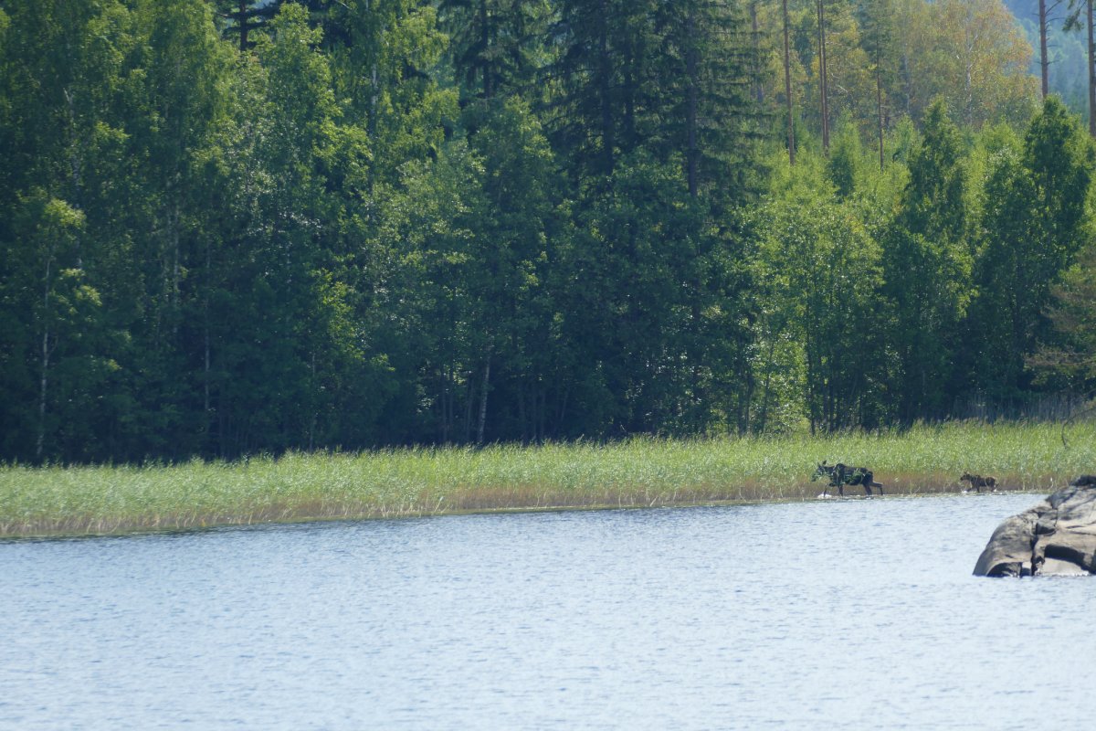 Da es nun schon Donnerstag war, wollten wir wieder Richtung Camp fahren. Also sind wir vom DANO 71 Richtung Süden gefahren. Allerdings waren wir nicht die einzigen die den Gedanken hatten und so waren die DANO´s belegt, und einen anderen für uns schönen Platz haben wir nicht gefunden. Also haben wir noch mal unser ganzen Kräfte gesammelt und sind zu der Insel gefahren, auf der wir unsere erste Nacht verbracht hatten. Dort haben wir auch die nächsten zwei Nächte verbracht, weil wir die Insel sehr schön fanden. Da haben wir auch mal ein paar Tage, ohne paddeln verbringen können. Wir waren sehr viel im Wasser, haben was für unsere Bräune getan und konnten sehr viele und schöne Eindrücke mit unsere Kamera einfangen. So konnten wir auch den Moment festhalten, als eine Elchmutter mit ihrem Kind aus dem Gebüsch kam.