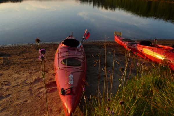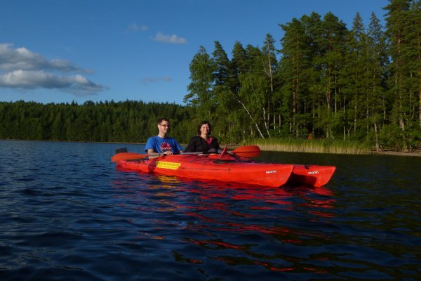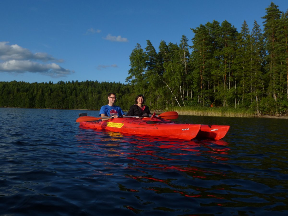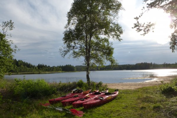 Gespannt und voller Vorfreude begannen wir unsere Kajaktour am „Kyrkekvarn Kanocenter“. Wir erhielten dort von den sympathischen Mitarbeitern die Wasserkarte, die Kajaks, sowie das Equipment (z.B. Spritzschutz, Säge und Beil), das wir noch für unsere Reise benötigten. Dadurch hatte sich zusammen mit den Nahrungsmitteln ein ganz schöner Gepäckhaufen angesammelt. Wir fragten uns, wie dies alles in unsere 4 Kajaks passen sollte. Mit etwas Packgeschick und Umpacken haben wir es dann doch geschafft.