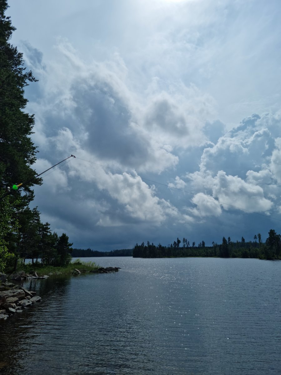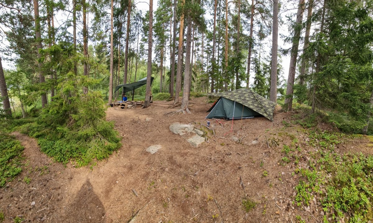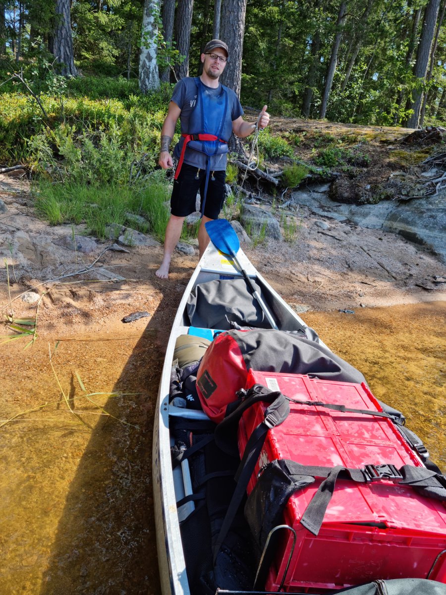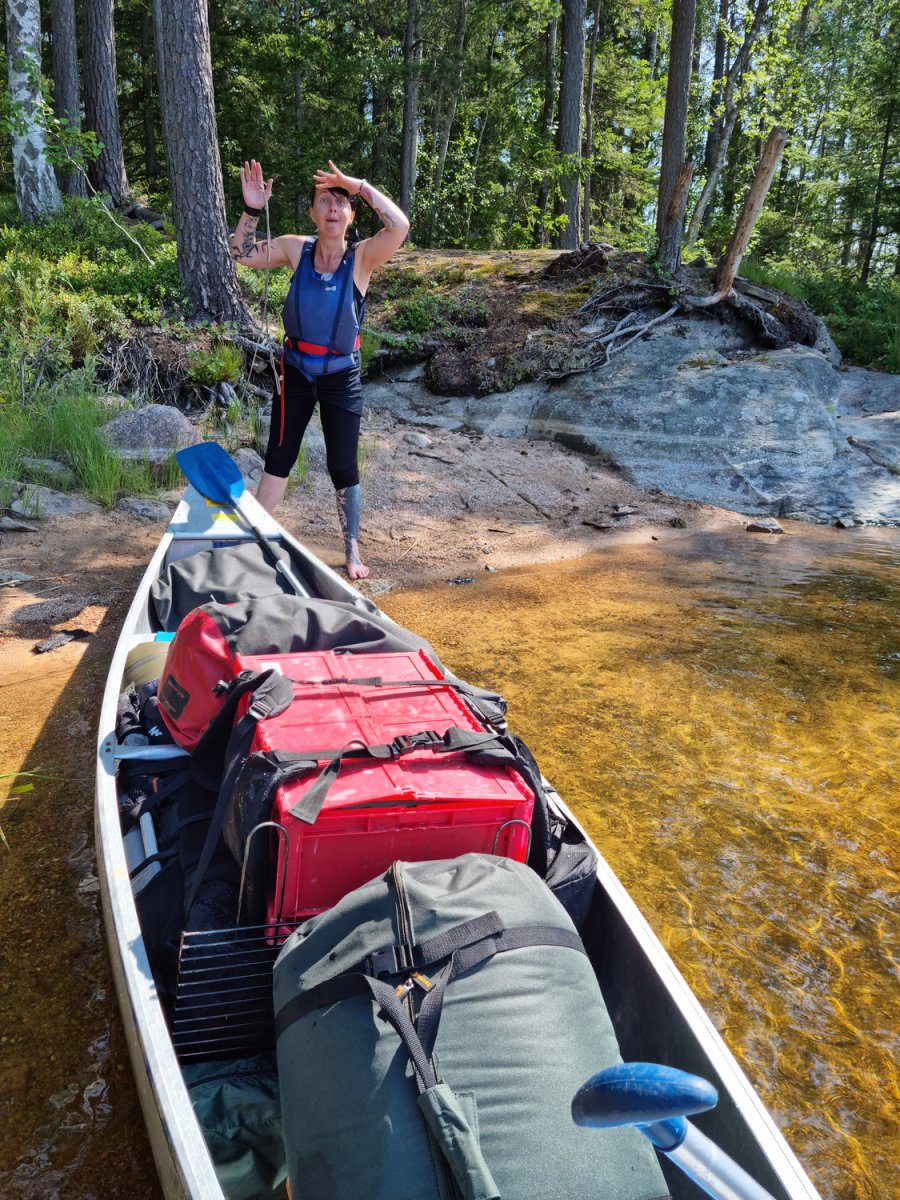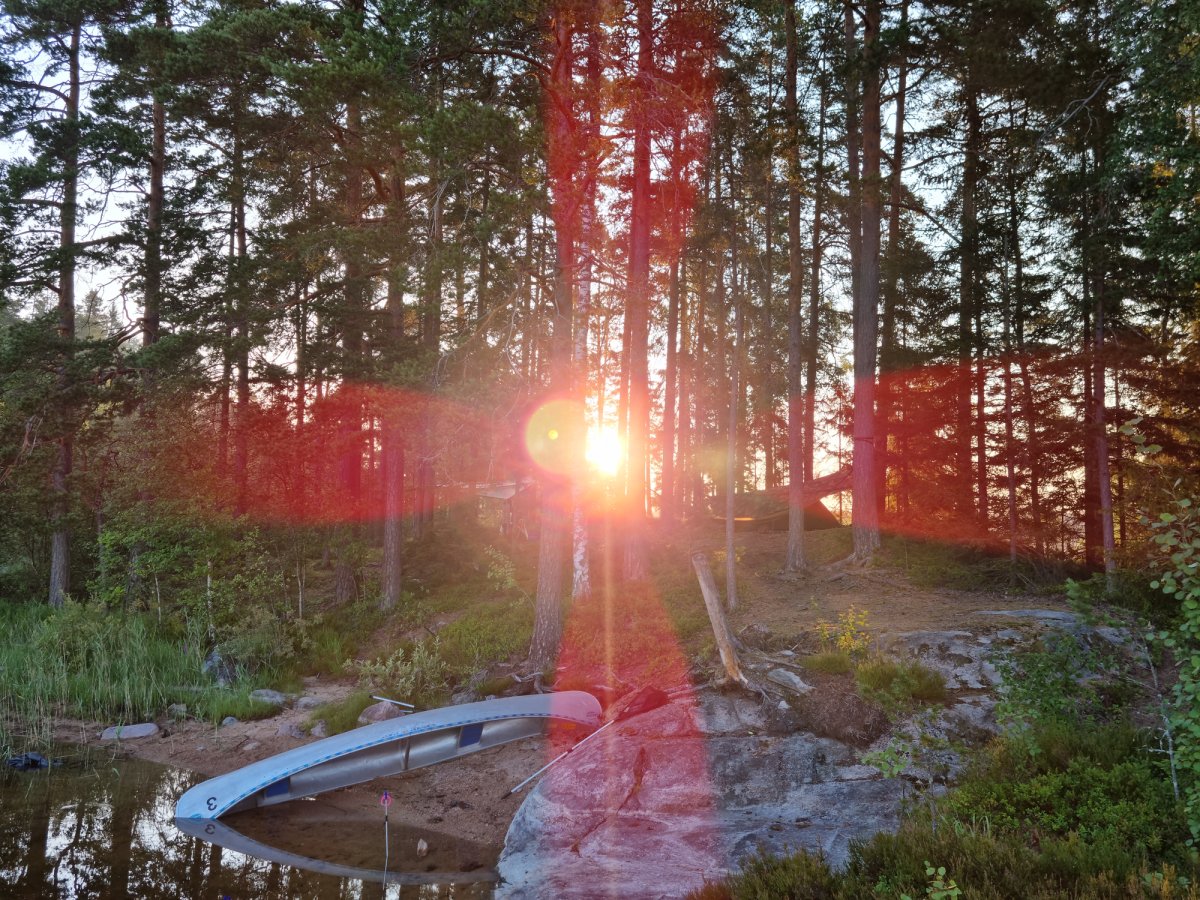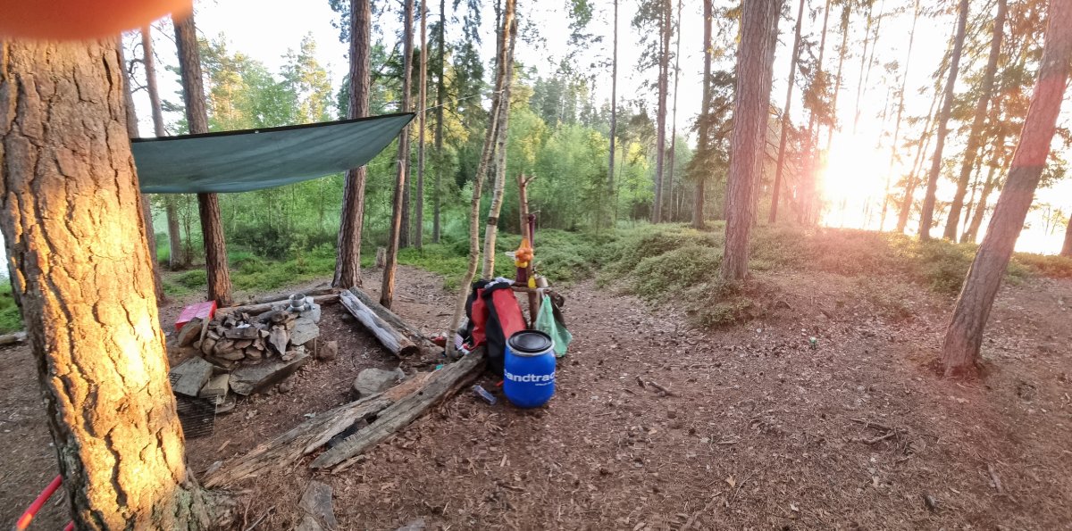 Bevor wir ein Camp weiter bei unseren booten und der Verpflegung angekommen sind.Dort gab es dann durch den sehr freundlichen Mitarbeiter, Ahne...oder Arne er möge es mir verzeihen(nahmen sind wie schall und rauch);) eingewiesen. Mit entsprechenden guten und auch hilfreichen Tips versehenden kontrollierten wie ob alles gebuchte da und beisammen ist.+das Boot richtig beladen sollte auch wirklich beachtet und zugehört werden;)sonst könnte es ein kurzer tipp werden;)Nach ca.ner stunde ist man dann aber mit allem durch und man kann auf seiner karte gucken welch feine Insel man ansteuern darf....wünsche sind kurzfristig auch möglich wenn was oder die Wunschinsel frei ist,wenn man lieb fragt;)Besser ist aber immer sich die Nummer zu merken und beim nächsten mal mit an zu geben,was wir zumindest machen werden um unsere rosa klobrille zu bekommen;)Mehr dazu später...;)wir spartrn uns zumindest gut 3km offenen See mit ziemlich beladenen Boot,was nicht sooo ganz einfach zu steuern ist bei Wind usw...zumindest das erste mal;)Auf unserer Insel angekommen,wussten wir vom vorjahr(inselbesuch )wo wir das Zelt und wo wir die planen ausspannen sollten,Ja richtig planen denn eine bekommt man von skantreck,und aus Erfahrung brachten wir noch eine mit.Denn wenn es regnet ist es oft dieser Regen der in bindfäden runter kommt,und da hatten wir ha auch gewisse Erfahrungen gemacht im Vorjahr trotz tippi.