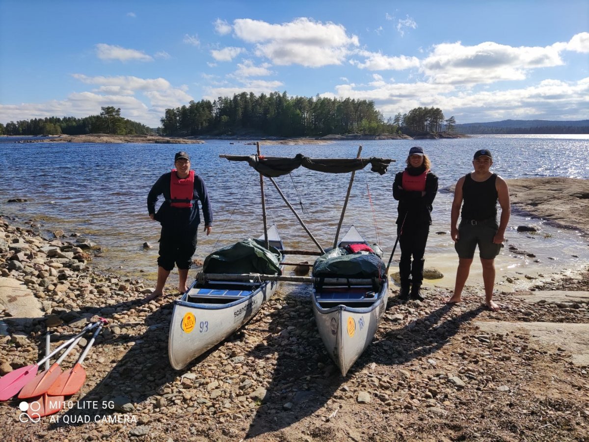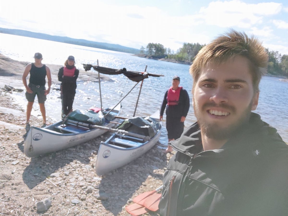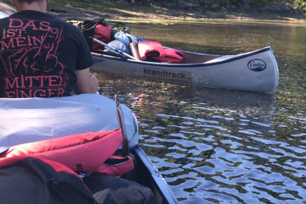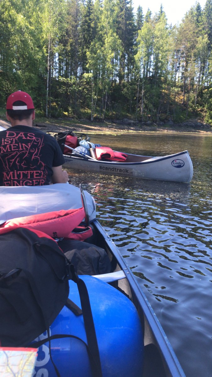 Nach unserer Ankunft im Outdoorcamp wurden wir zuerst sehr herzlich von den Scandtrack Mitarbeitern empfangen. Danach hatte man die Möglichkeit, sich auf der Wiese zu Erholen und einen Kaffee zu trinken. Wir entschlossen uns dazu, nicht lange dort zu verweilen und uns direkt in das Abenteuer zu stürzen. Also packten wir unsere sieben Sachen und machten uns auf zu der Ausrüstungsausgabe. Dort erhielten wir unsere Proviantpakete, zwei Zelte und die anderen Ausrüstungsgegenstände wie zum Beispiel Paddel, Schwimmwesten, Gaskocher. Wir sammelten uns hinter dem großen Ausrüstungszelt und packten unsere Sachen aus unseren Rucksäcken in die Packsäcke. Als das erledigt war gingen wir zur Kanuausgabe, bepackten unsere zwei Kanus mit unserem Gepäck und machten uns auf in Richtung Norden.