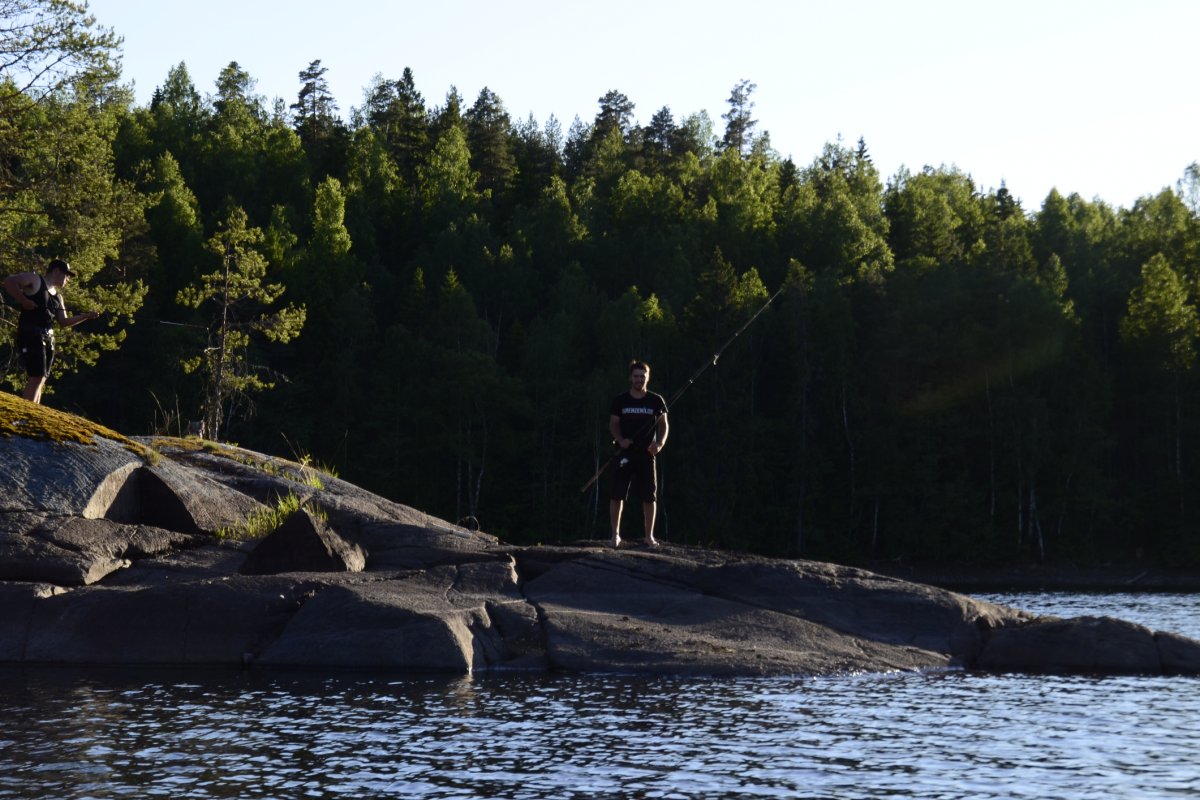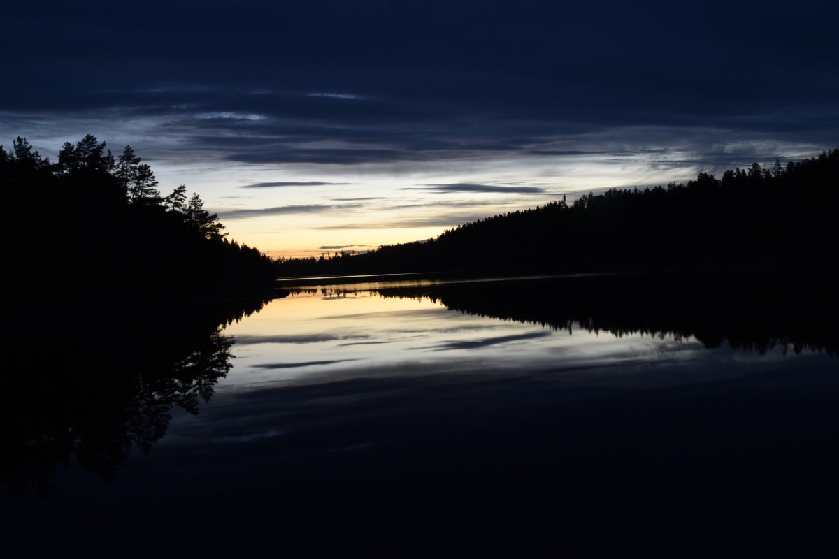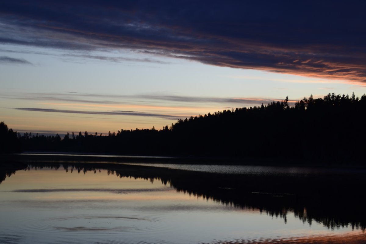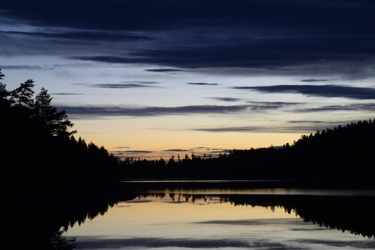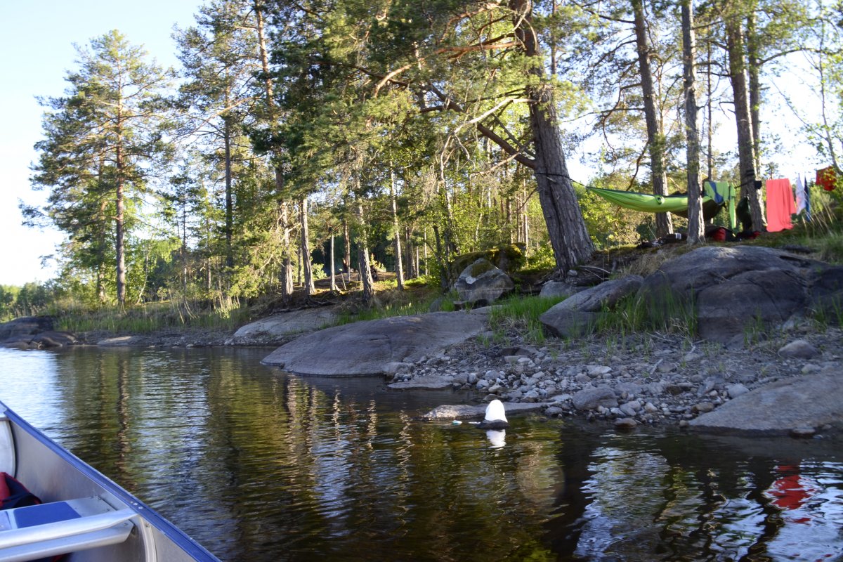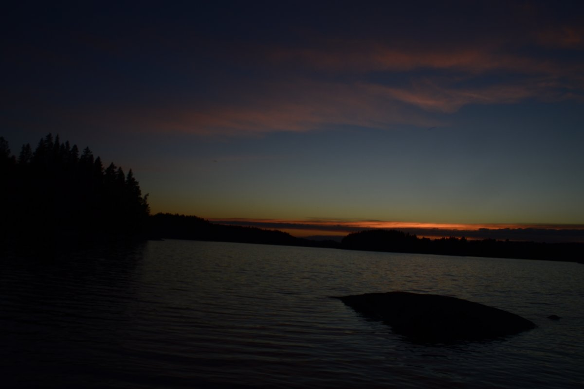 Als wir am nächsten Morgen aufgestanden sind, frühstückten wir Schokomüsli und packten unser Nachtlager zusammen. Unsere Reise sollte weiter in Richtung Norden, Stora Le, gehen. Wir hielten uns ab Camp 36 in Richtung der Umtragestelle, begaben uns somit etwas in Richtung Süden. Etwa einen Kilometer vor der Umtragestelle fiel uns eine kleine Insel ins Auge, auf welcher wir die zweite Nacht in Schweden verbringen wollten. Da wir bereits mittags anlegten entschlossen wir uns dazu, warm Mittag zu essen. Wir machen uns Nudeln mit Käsesoße. Den restlichen Tag angelten wir gelegentlich, bauten einen Windschutz auf und sammelten Feuerholz. Zum Abendessen gab es Tomatensuppe nach Rezept aus dem Outdoorkochbuch, mitsamt Stockbrot. Abends angelten wir noch weiter und ich machte noch ein paar Fotos von der untergehenden Sonne.